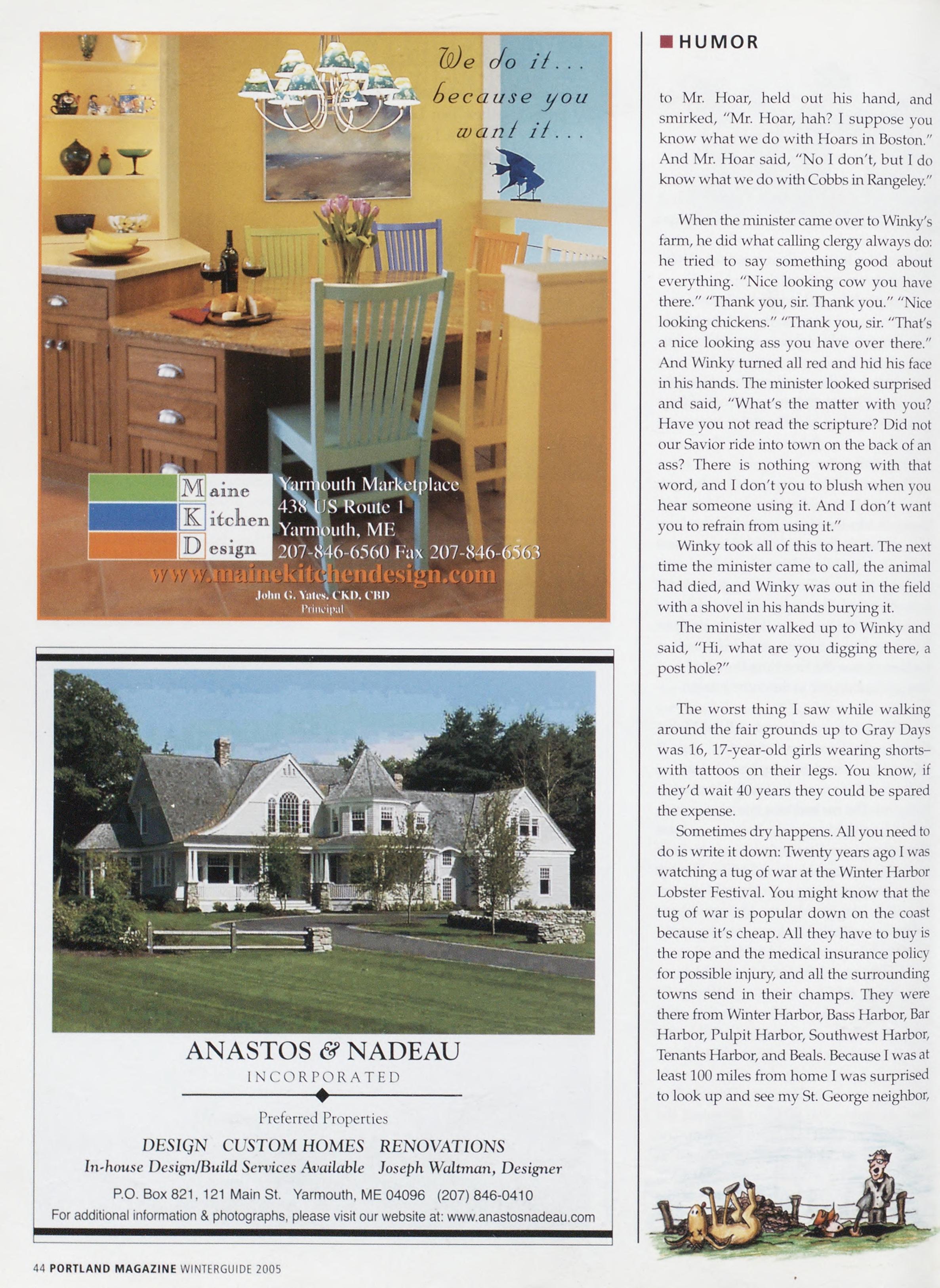 Newsstand Cover Date: Winterguide 2005, published in December 2004, Vol. 19, No. 10, copyright 2004.Portland Magazineismailedat third-class mail rates in Portland, ME 04101 (ISSN: 1073-1857). Opinions expressed in articles are those of authors and do not represent editonalpositionsofPortland Magazine. Letters to the editor are welcome and will be treated as unconditionally assigned for publication and copyright purposes and as subject toPortland Magazine'sunrestrict¬ ed right to edit and comment editorially. Responsible only for that por¬ tion of any advertisement which is printed incorrectly. Advertisers are responsible for copyrights of materials they submit. Nothing in this issue may be reprinted in whole or in part without written permission from the publishers. Submissions welcome, but we take no responsibil¬ ityforunsolicitedmaterials.