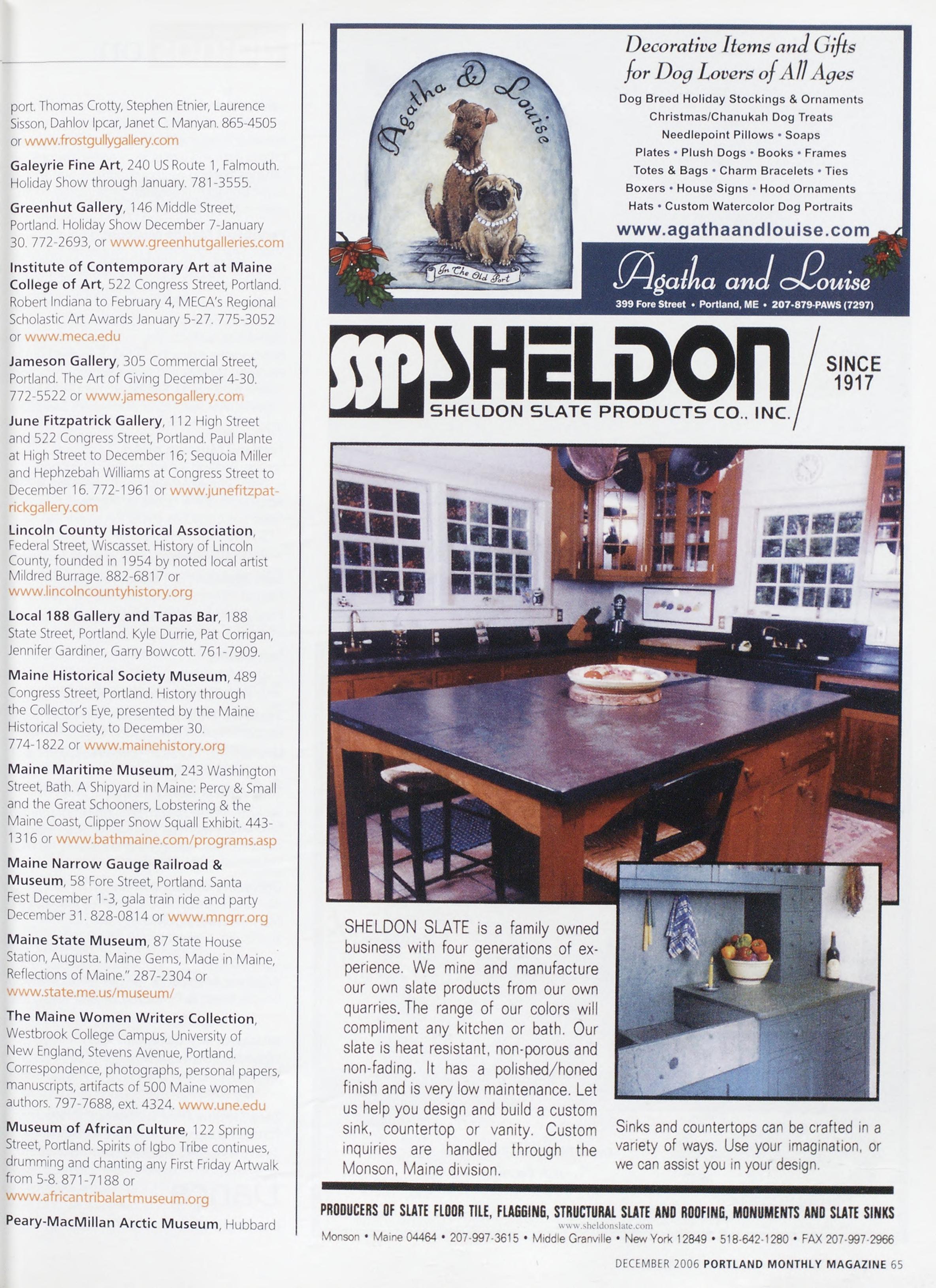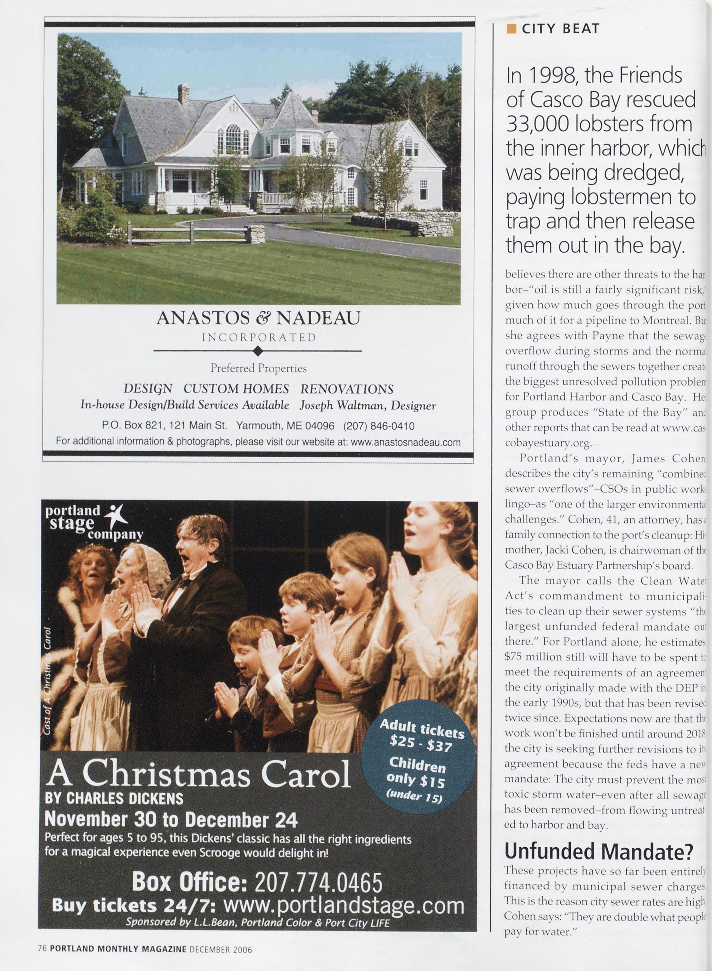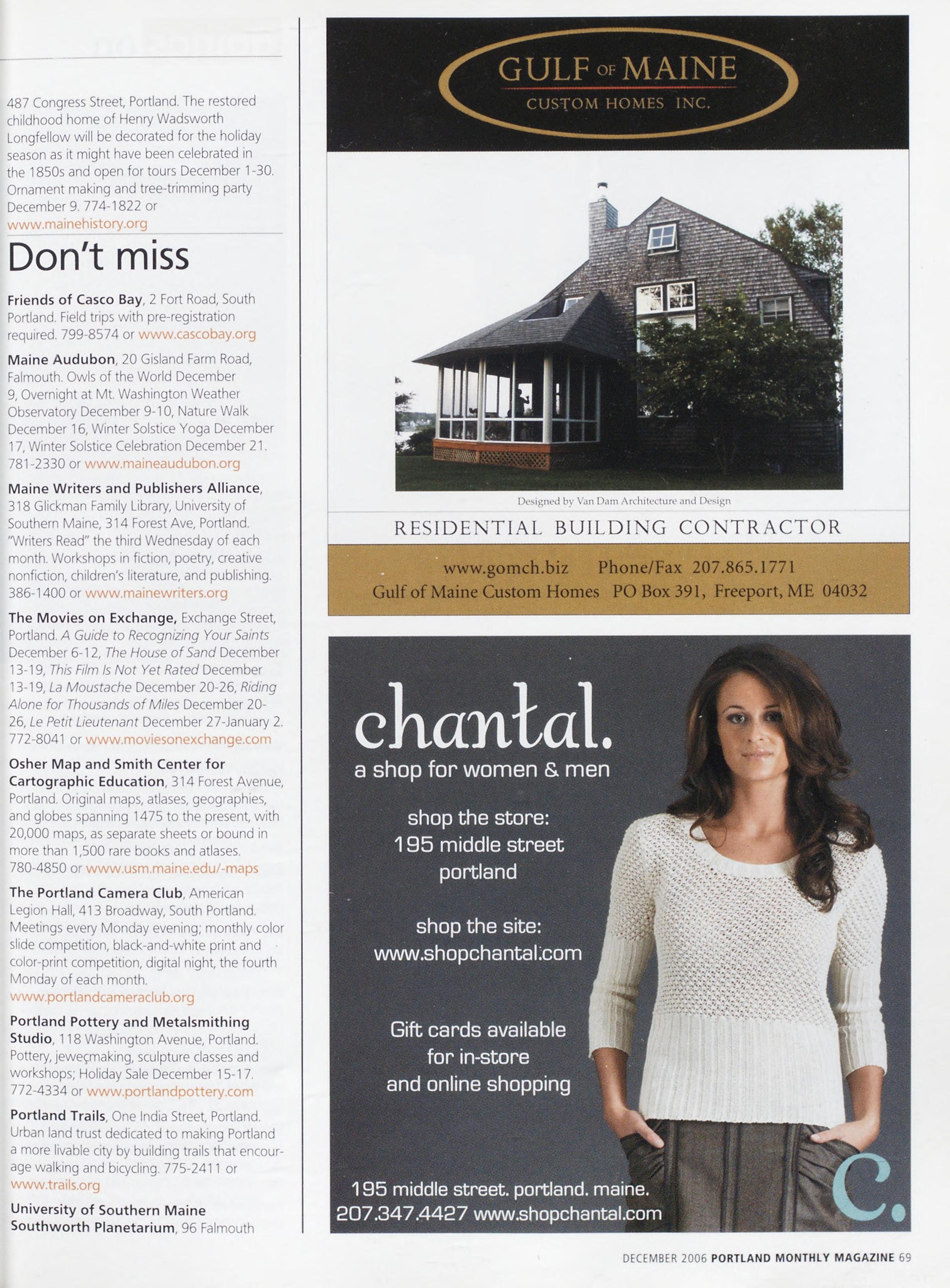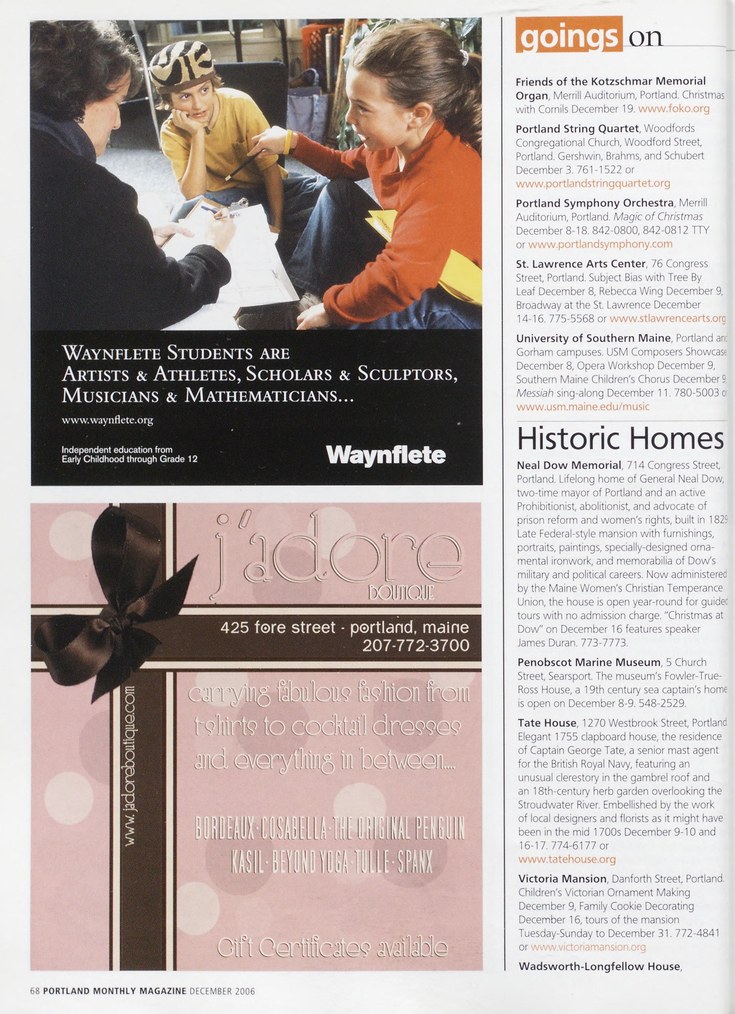 Newsstand Cover Date: December 2006, published in November 2006, Vol. 21, No. 9, copyright 2006.Portland Magazine ismailedatthirdclass mail rates in Portland, ME 04101 (ISSN: 1073-1857). Opinions expressed in articles are those of authors and do not represent editorial positions of Portland Magazine. Letters to the editor are welcome and will be treated as unconditionally assigned for publication and copyright purposes and as subject to Portland Magazine's unre¬ stricted right to edit and comment editorially. Responsible only for that portion of any advertisement which is printed incorrectly. Advertisers are responsible for copyrights of materials they submit. Nothing in this issue may be reprinted in whole or in part without written permission from the publishers. Submissions welcome, but we take no responsibil¬ ityforunsolicitedmaterials.