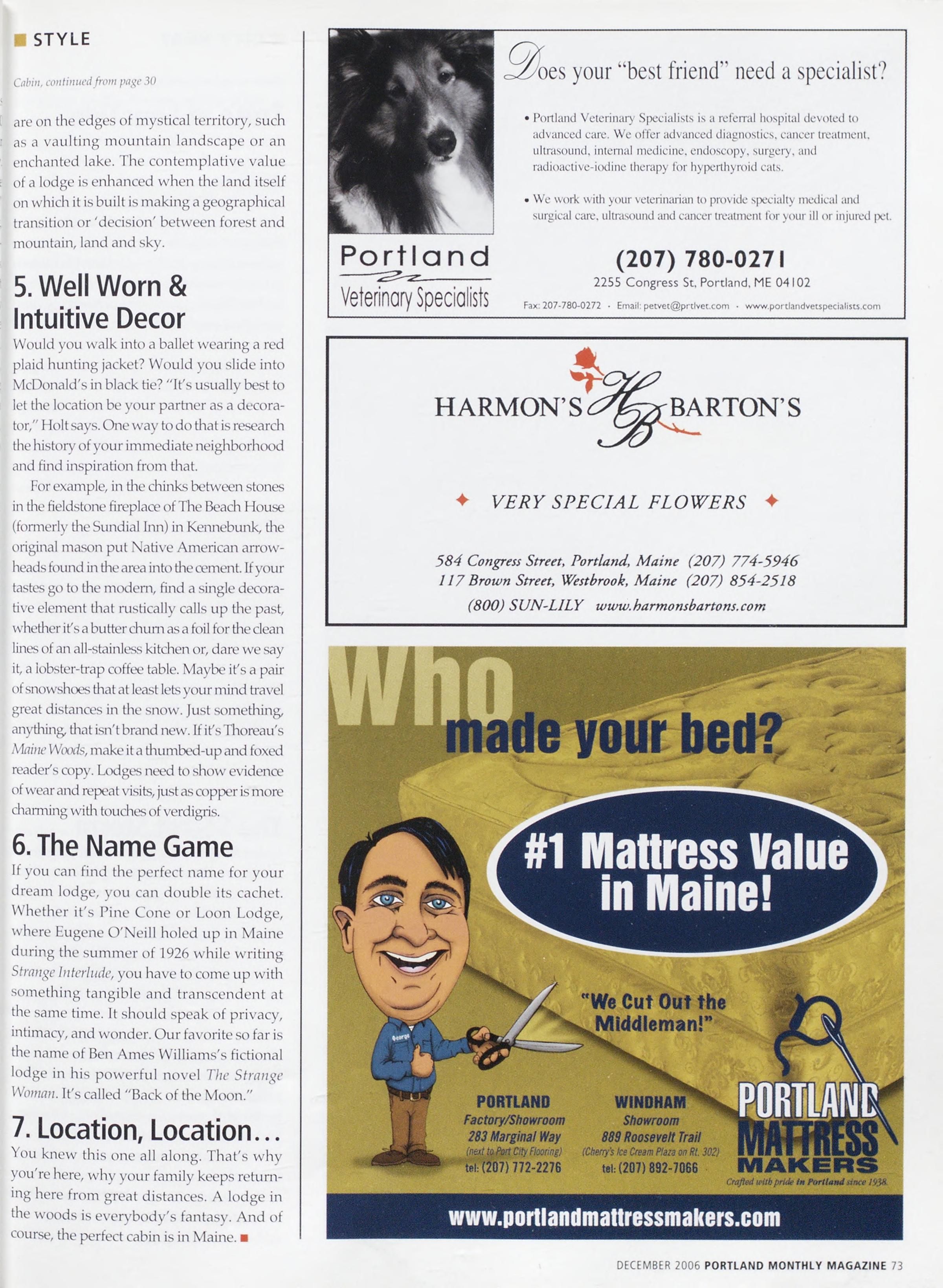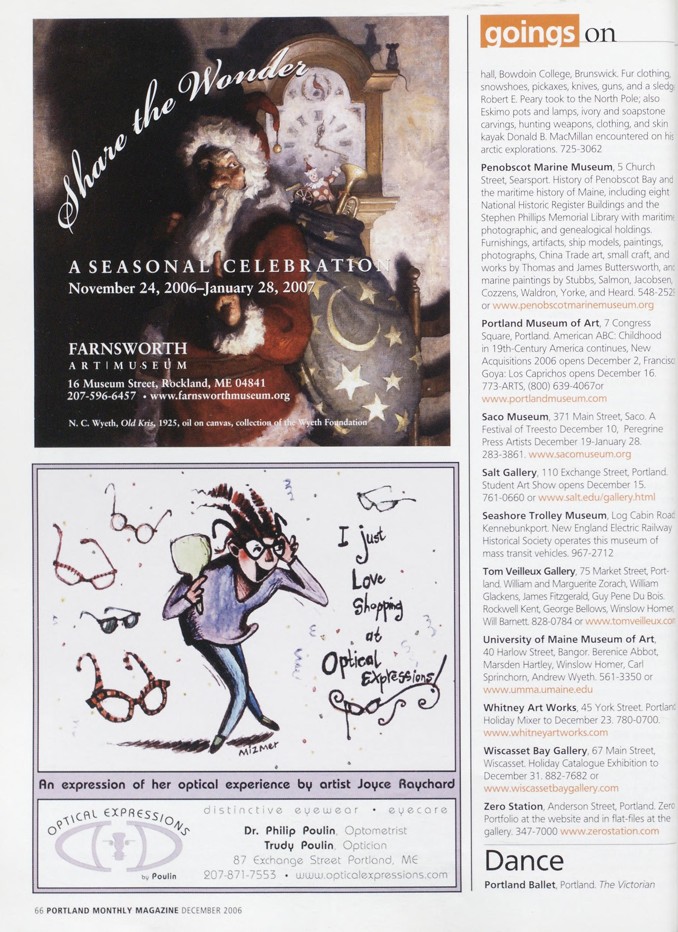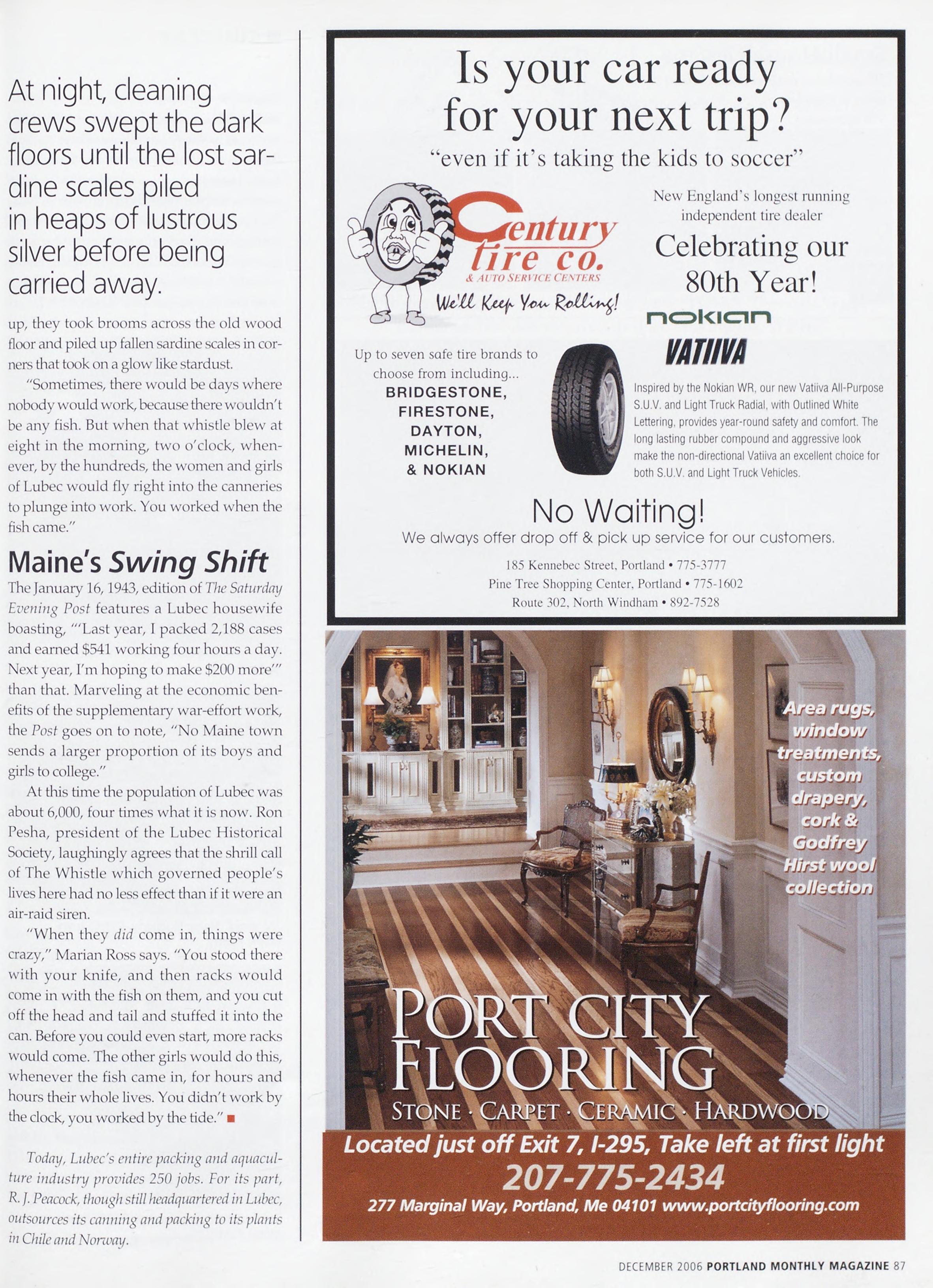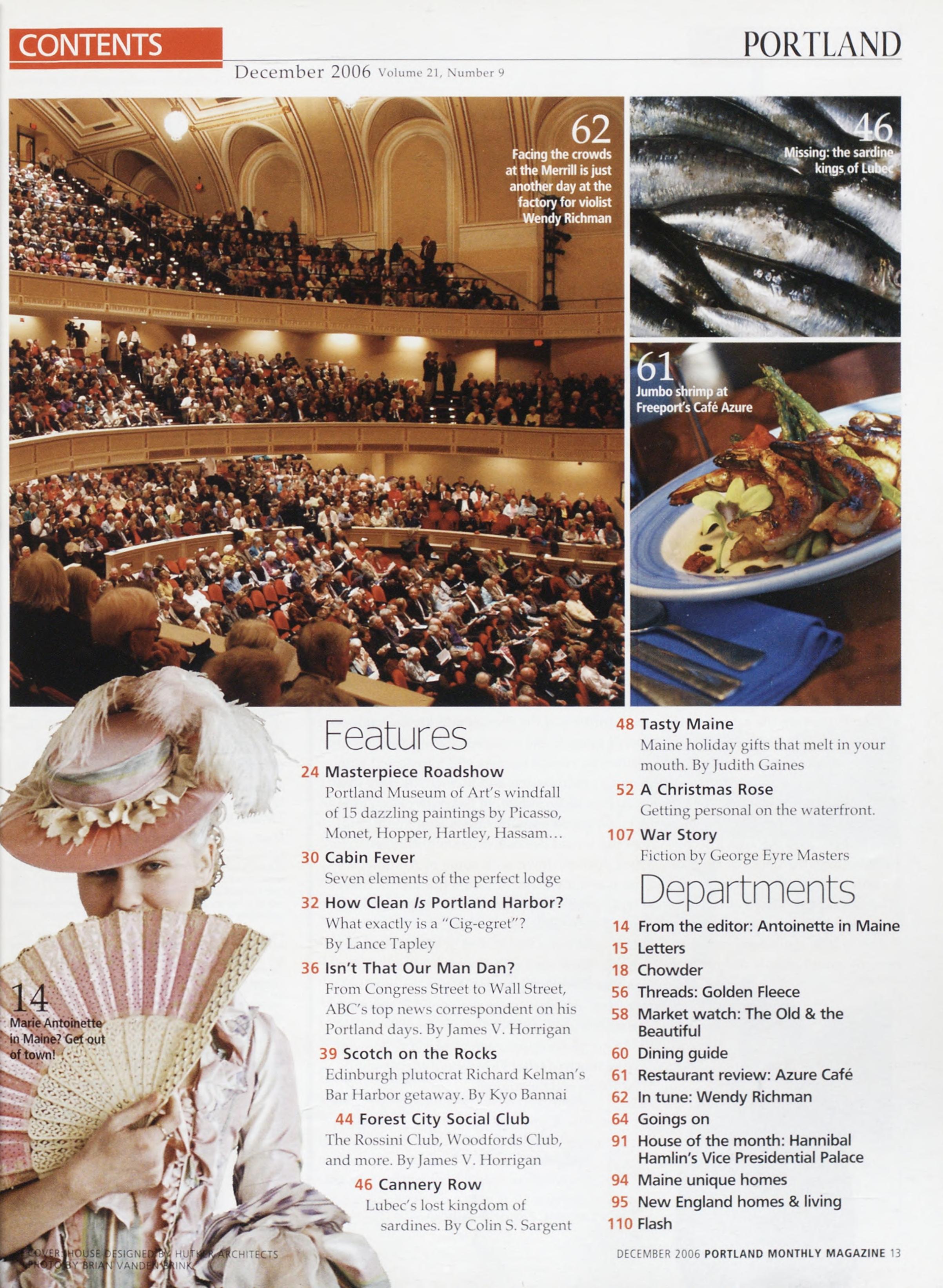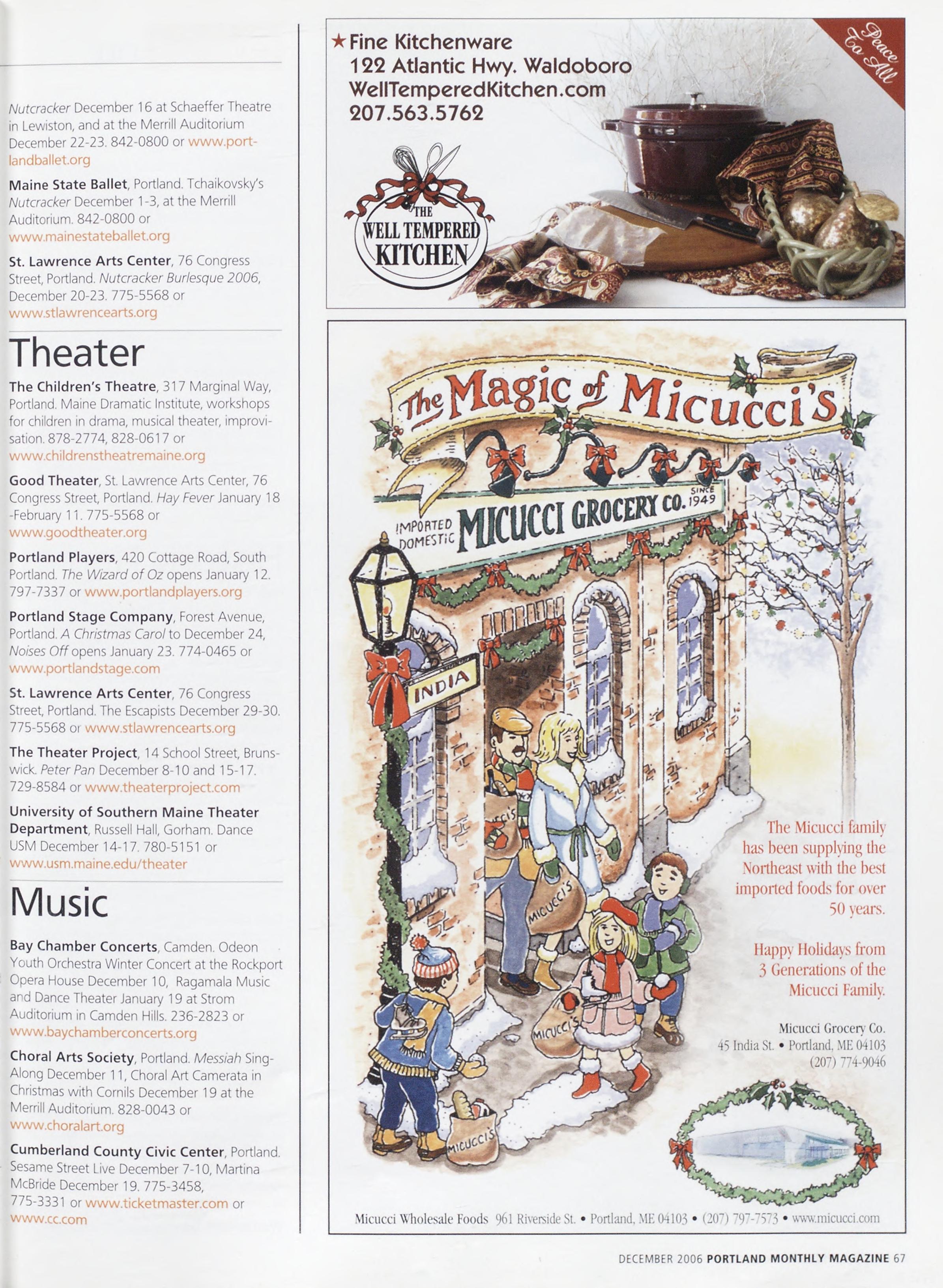 Newsstand Cover Date: December 2006, published in November 2006, Vol. 21, No. 9, copyright 2006.Portland Magazine ismailedatthirdclass mail rates in Portland, ME 04101 (ISSN: 1073-1857). Opinions expressed in articles are those of authors and do not represent editorial positions of Portland Magazine. Letters to the editor are welcome and will be treated as unconditionally assigned for publication and copyright purposes and as subject to Portland Magazine's unre¬ stricted right to edit and comment editorially. Responsible only for that portion of any advertisement which is printed incorrectly. Advertisers are responsible for copyrights of materials they submit. Nothing in this issue may be reprinted in whole or in part without written permission from the publishers. Submissions welcome, but we take no responsibil¬ ityforunsolicitedmaterials.