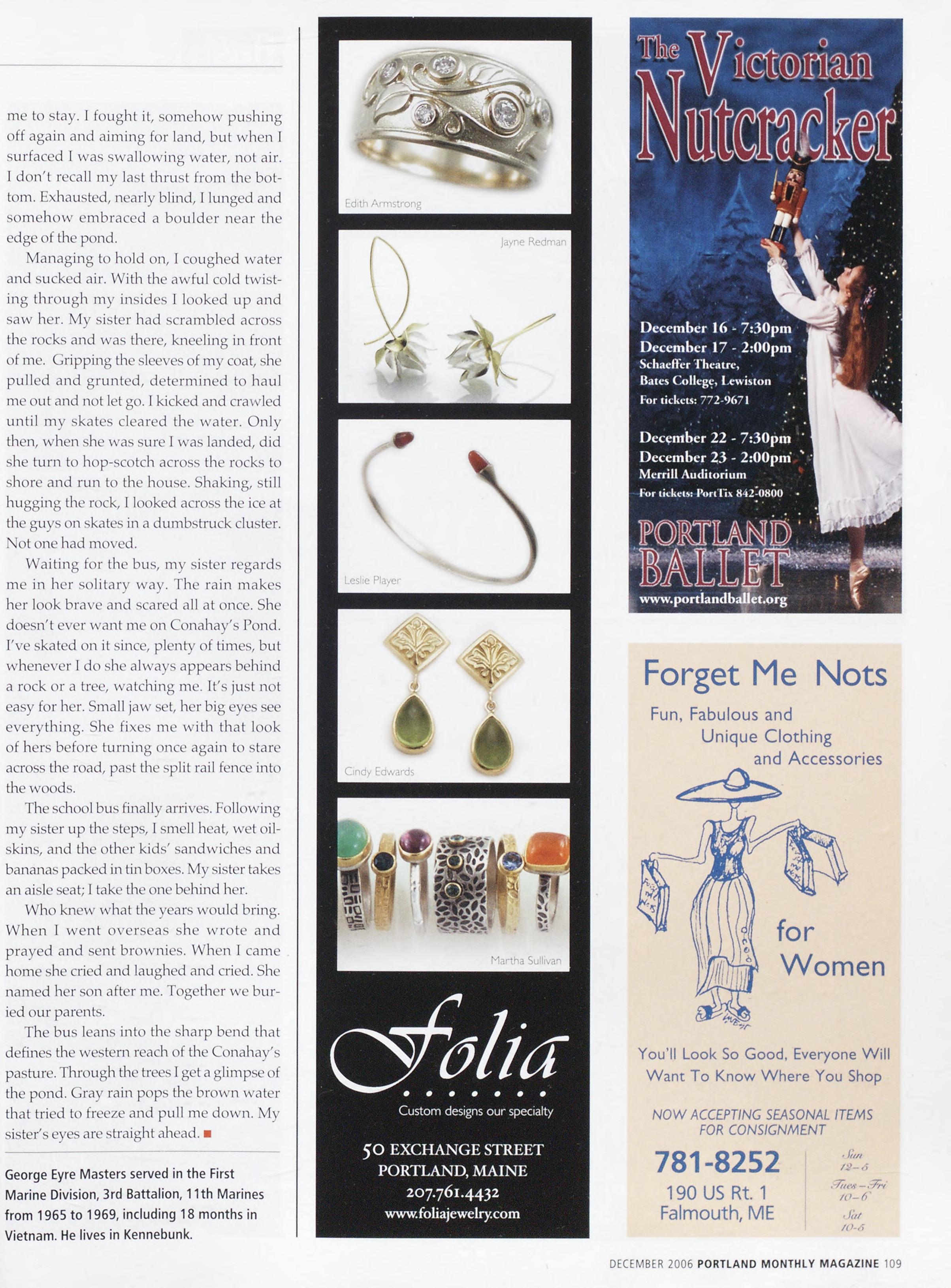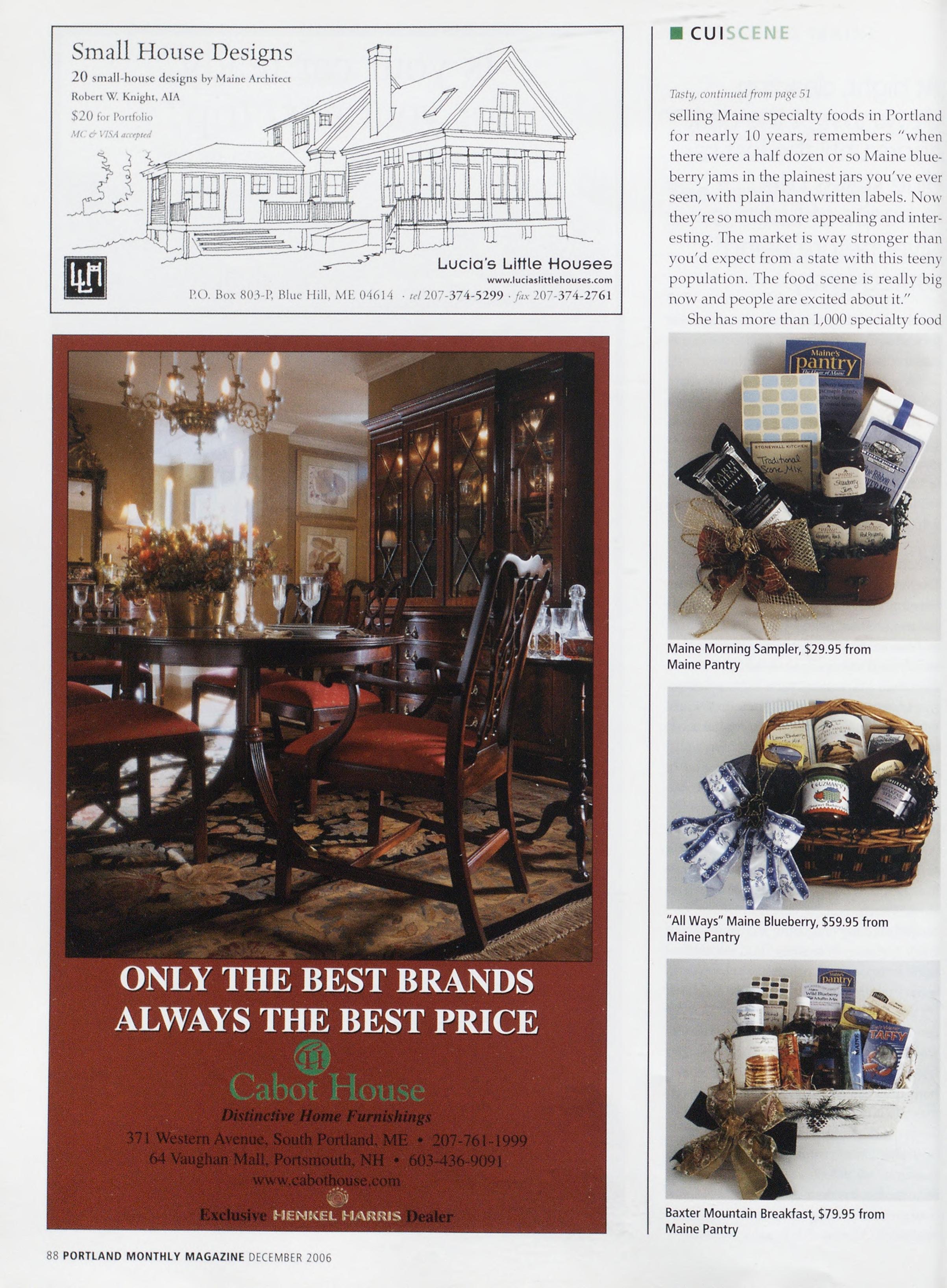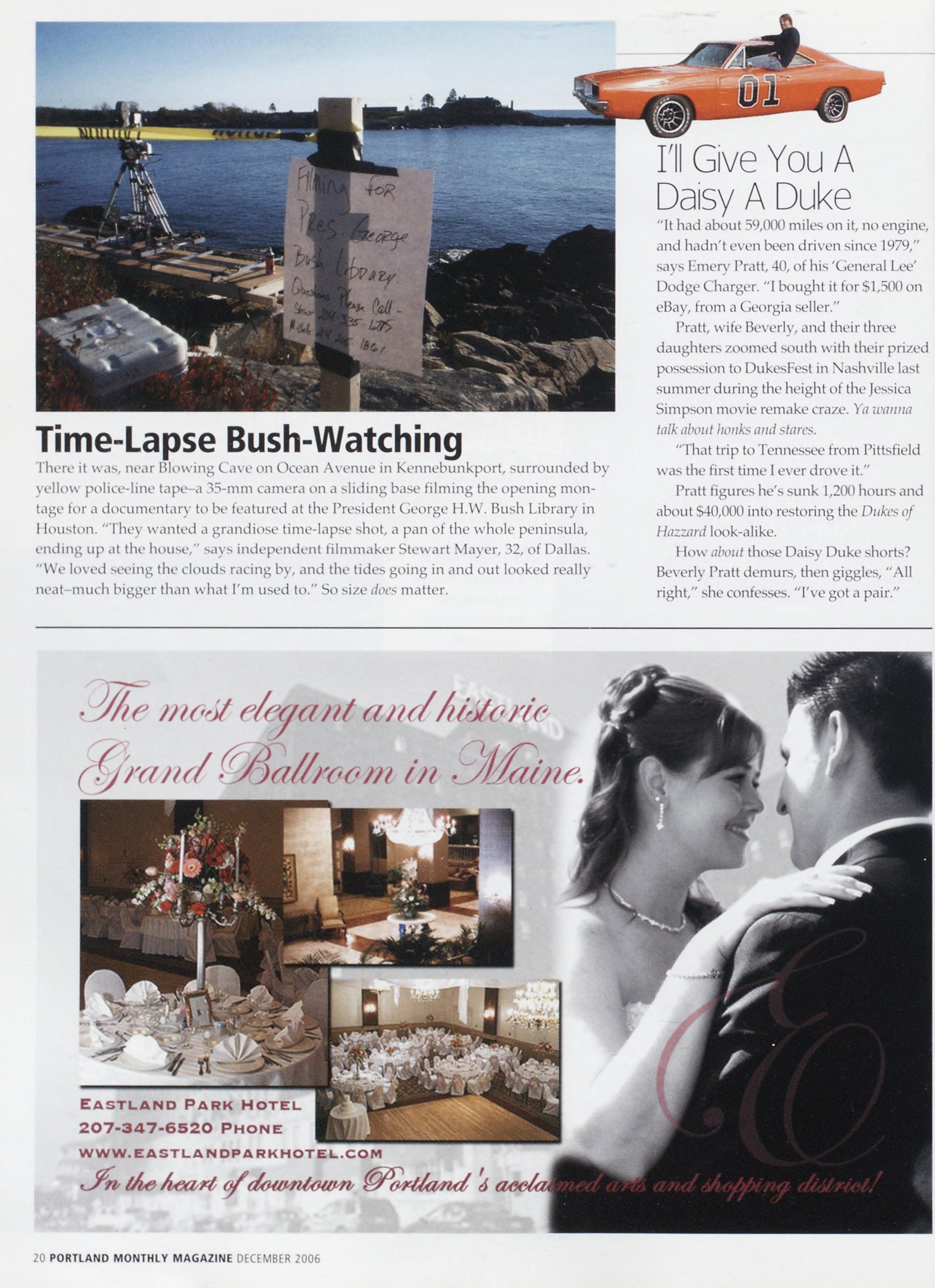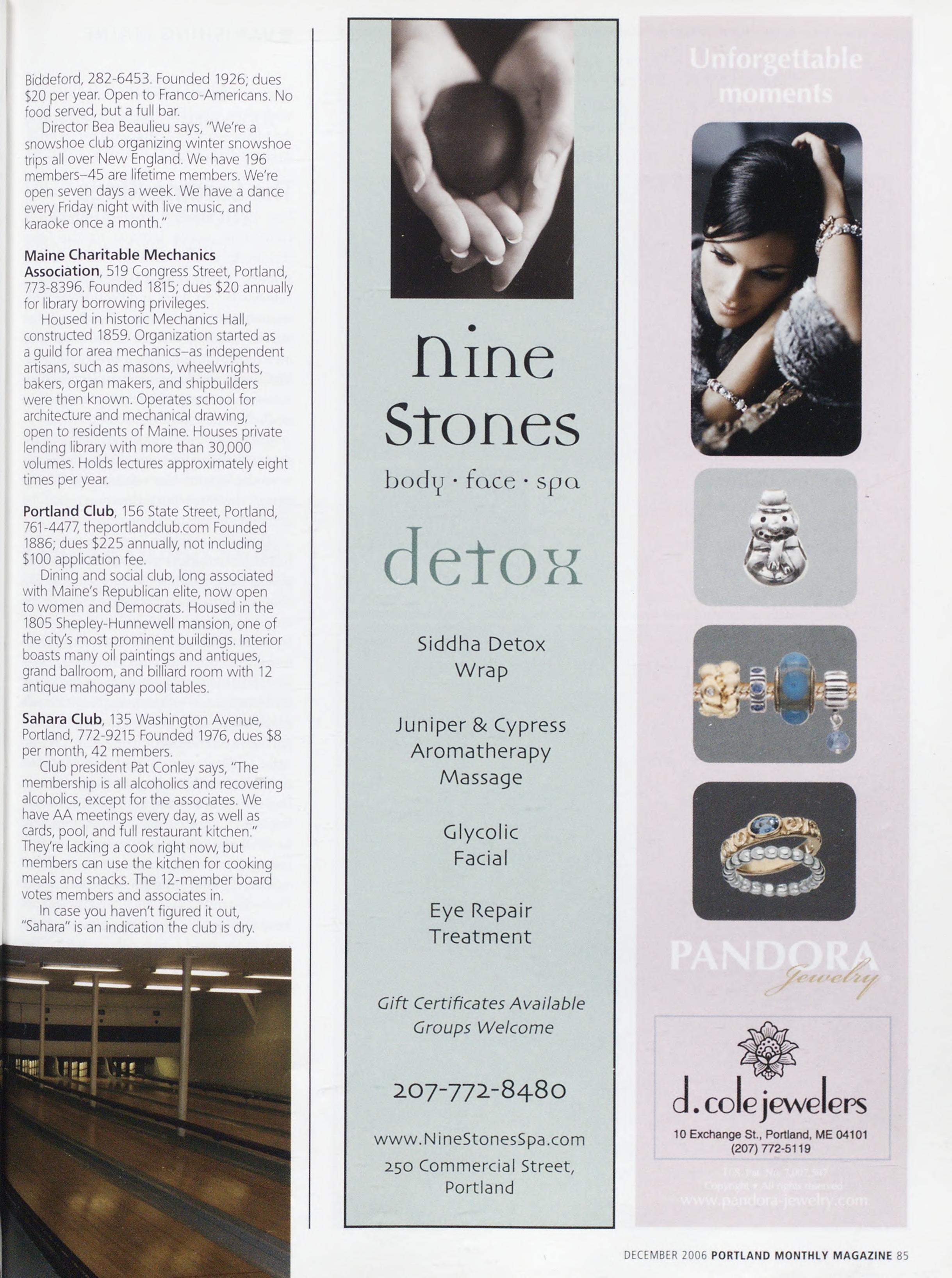 Newsstand Cover Date: December 2006, published in November 2006, Vol. 21, No. 9, copyright 2006.Portland Magazine ismailedatthirdclass mail rates in Portland, ME 04101 (ISSN: 1073-1857). Opinions expressed in articles are those of authors and do not represent editorial positions of Portland Magazine. Letters to the editor are welcome and will be treated as unconditionally assigned for publication and copyright purposes and as subject to Portland Magazine's unre¬ stricted right to edit and comment editorially. Responsible only for that portion of any advertisement which is printed incorrectly. Advertisers are responsible for copyrights of materials they submit. Nothing in this issue may be reprinted in whole or in part without written permission from the publishers. Submissions welcome, but we take no responsibil¬ ityforunsolicitedmaterials.