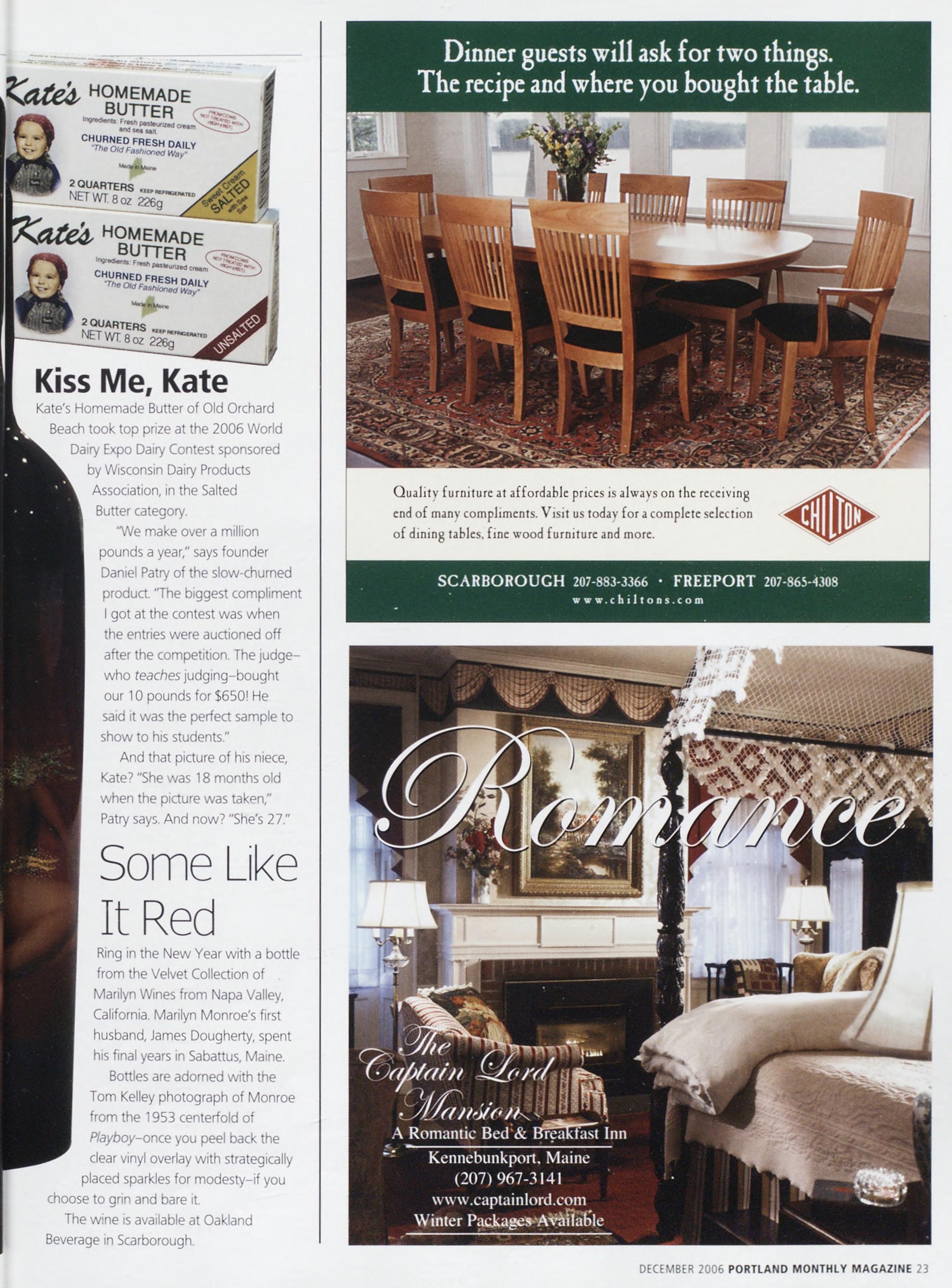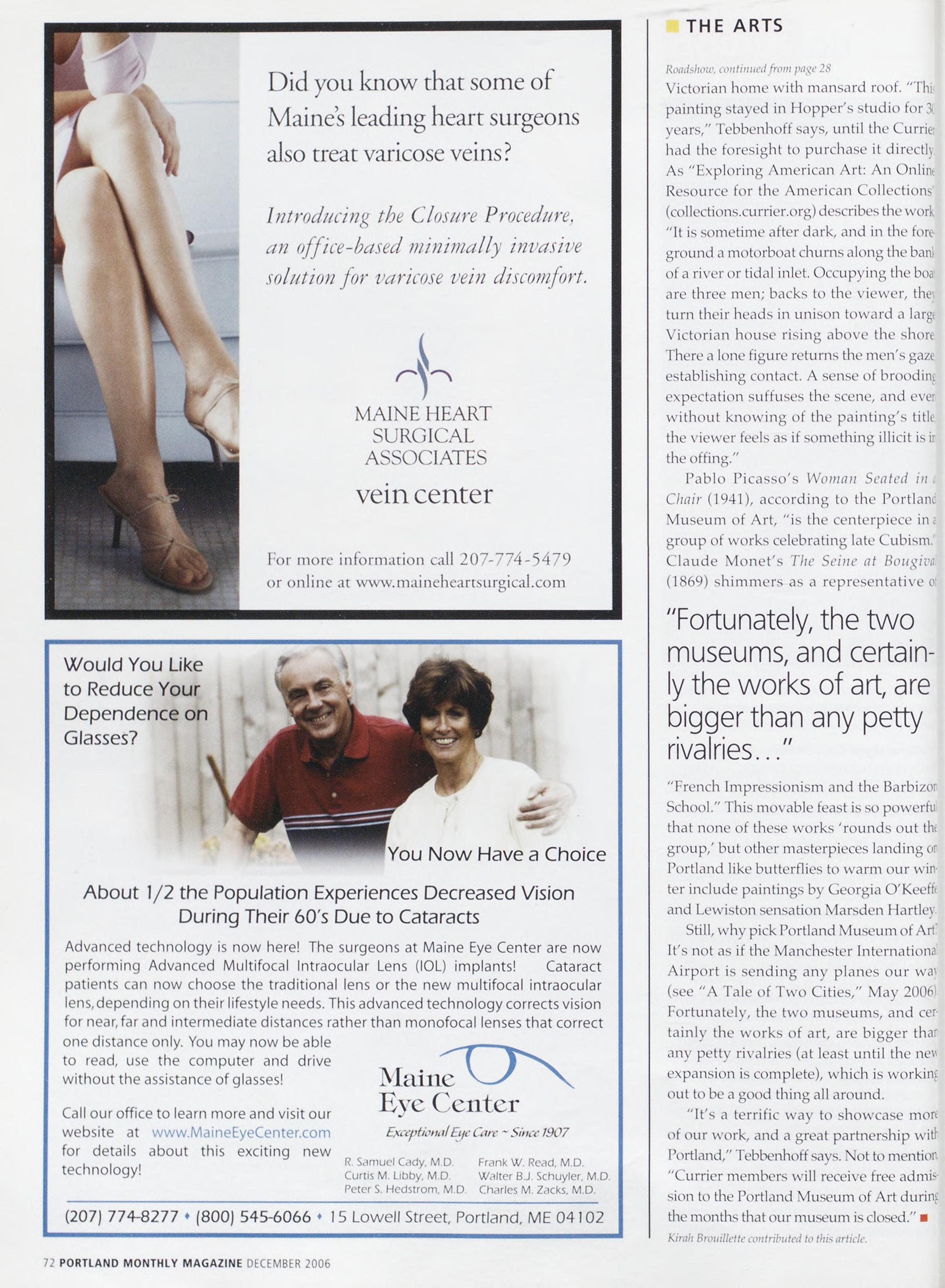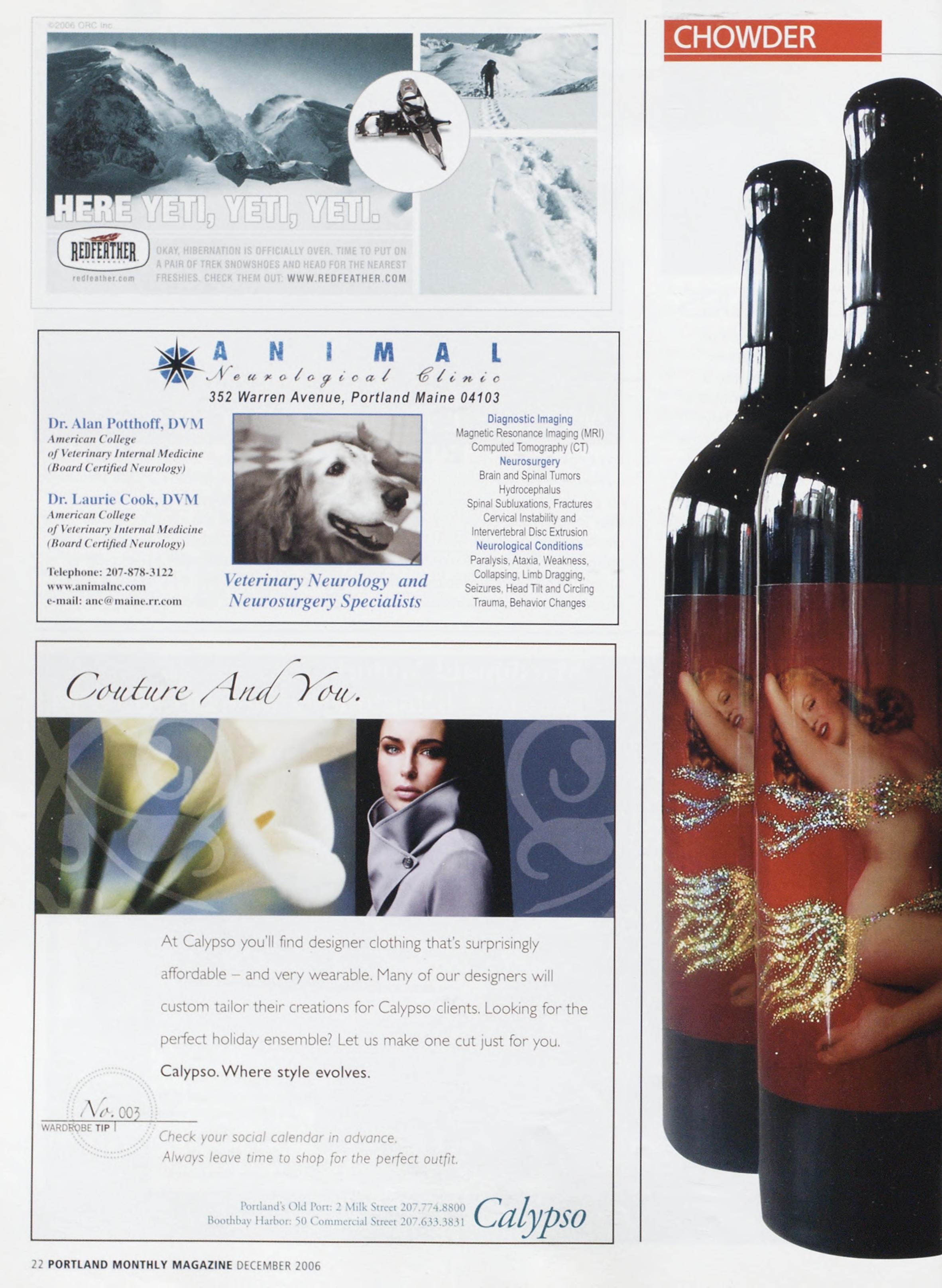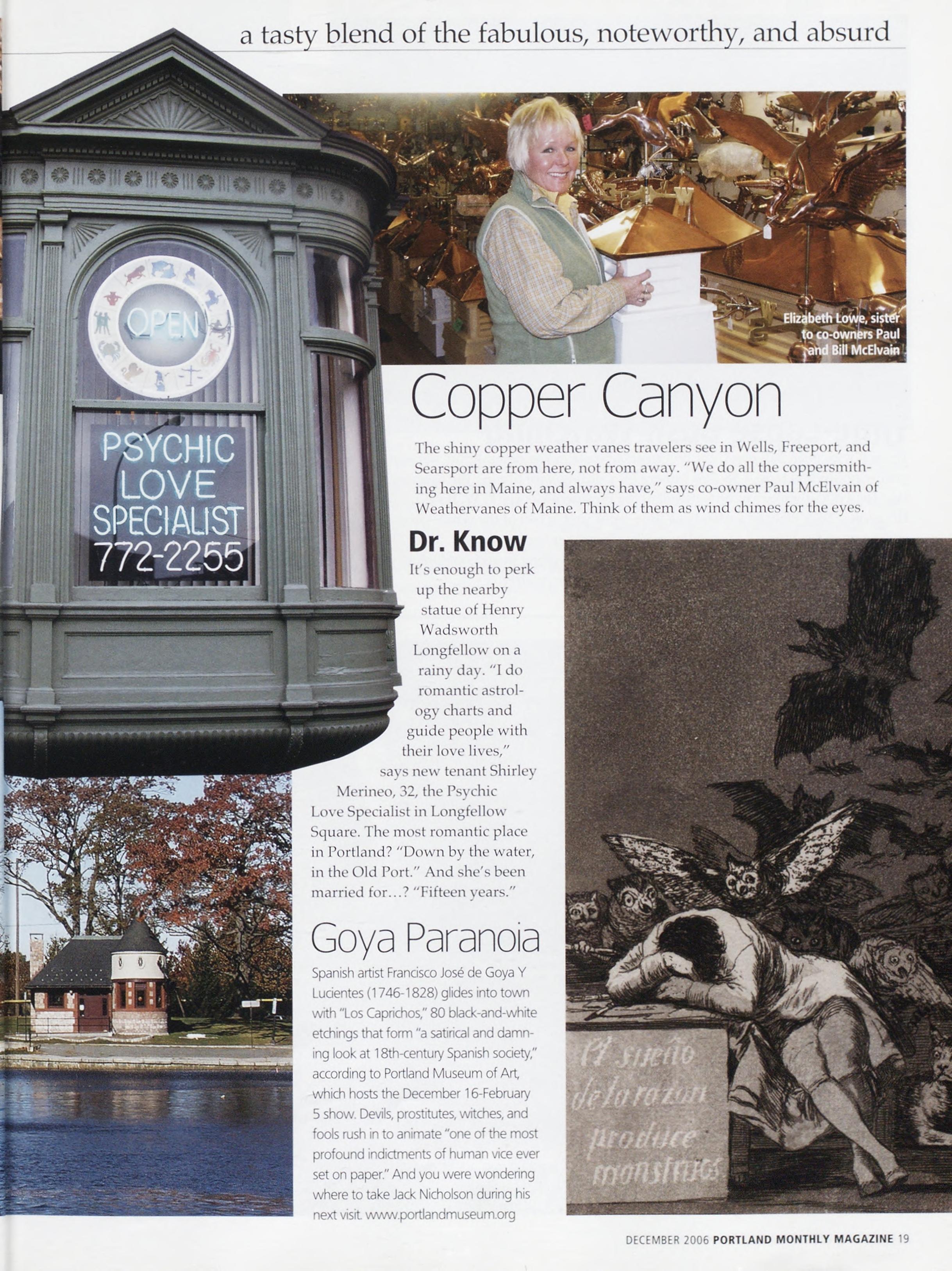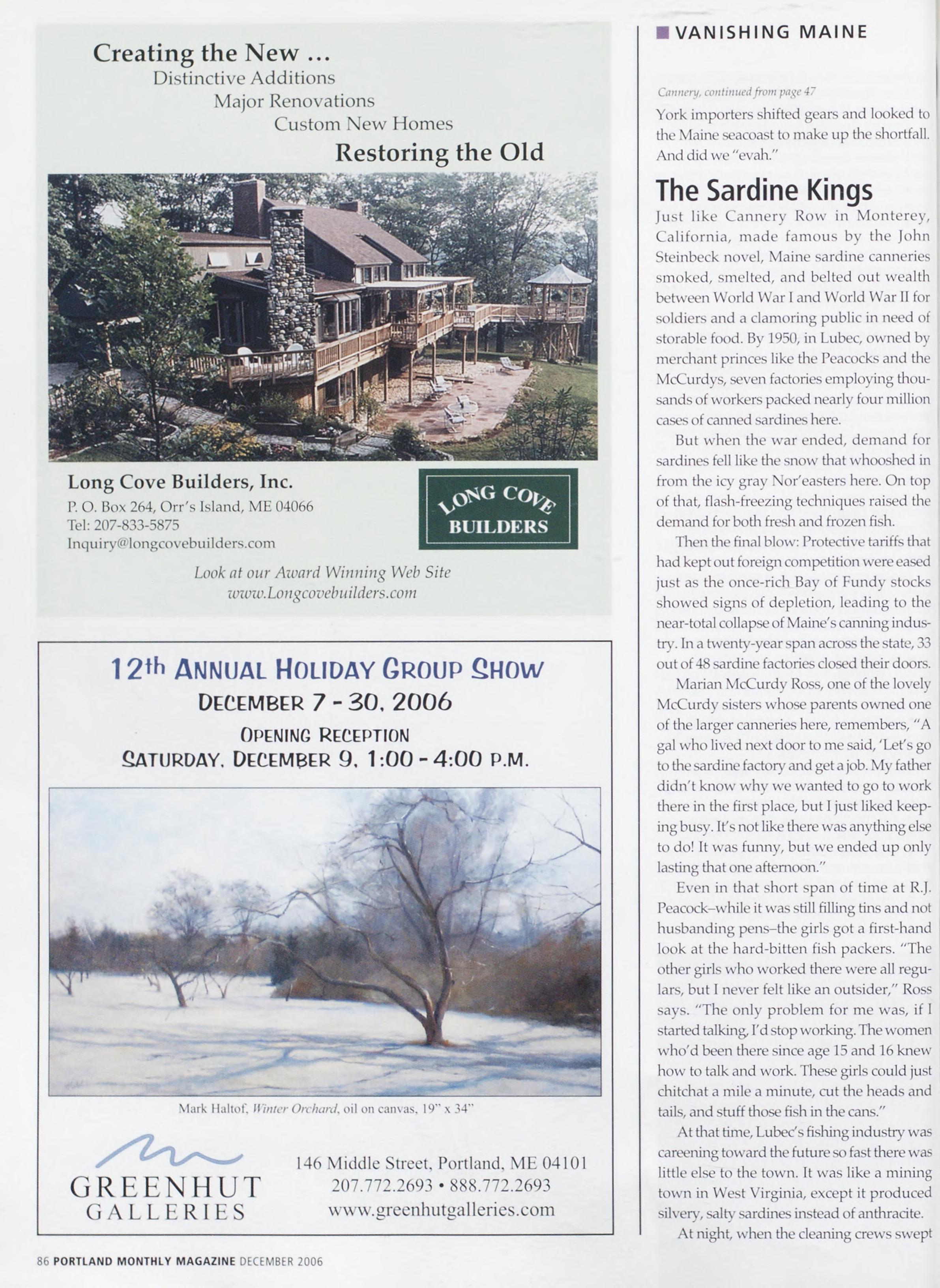 Newsstand Cover Date: December 2006, published in November 2006, Vol. 21, No. 9, copyright 2006.Portland Magazine ismailedatthirdclass mail rates in Portland, ME 04101 (ISSN: 1073-1857). Opinions expressed in articles are those of authors and do not represent editorial positions of Portland Magazine. Letters to the editor are welcome and will be treated as unconditionally assigned for publication and copyright purposes and as subject to Portland Magazine's unre¬ stricted right to edit and comment editorially. Responsible only for that portion of any advertisement which is printed incorrectly. Advertisers are responsible for copyrights of materials they submit. Nothing in this issue may be reprinted in whole or in part without written permission from the publishers. Submissions welcome, but we take no responsibil¬ ityforunsolicitedmaterials.