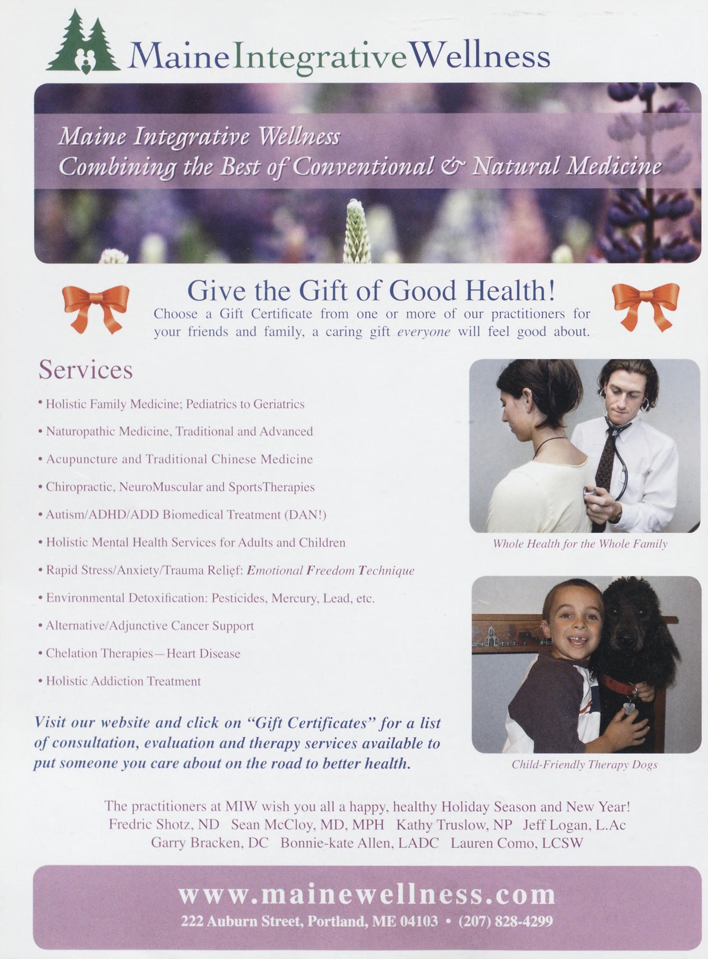 MaineIntegrativeWellness ChooseaGiftCertificatefromoneormoreofourpractitionersfor yourfriendsandfamily,acaringgift everyonewillfeelgoodabout.
