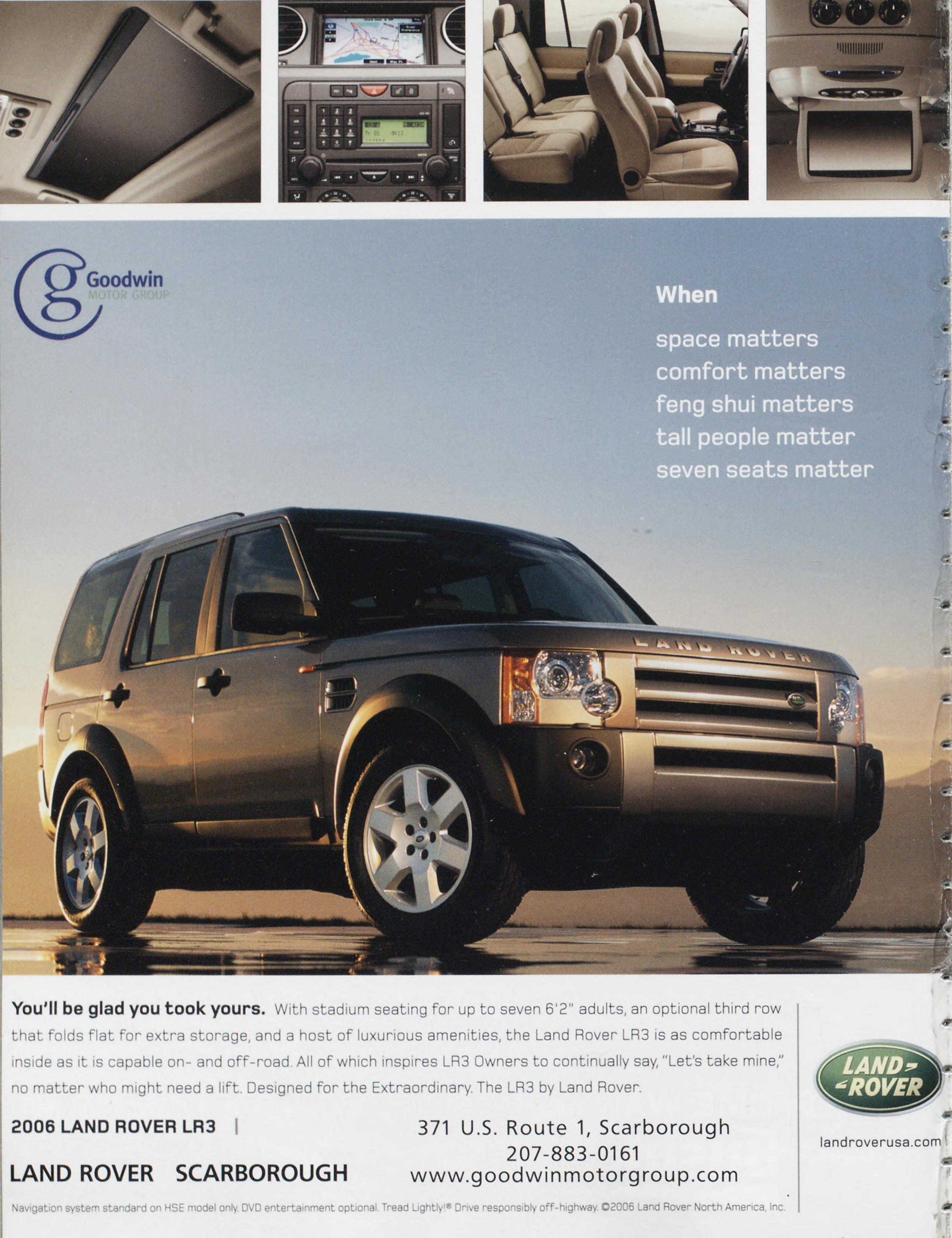 I You’llbegladyoutookyours. Withstadiumseatingforuptoseven6'2"adults,anoptionalthirdrow thatfoldsflatforextrastorage,andahostofluxuriousamenities,theLandRoverLR3isascomfortable insideasitiscapableon-andoff-road.AllofwhichinspiresLR3Ownerstocontinuallysay,"Let’stakemine," nomatterwhomightneedalift.DesignedfortheExtraordinary.TheLR3byLandRover.