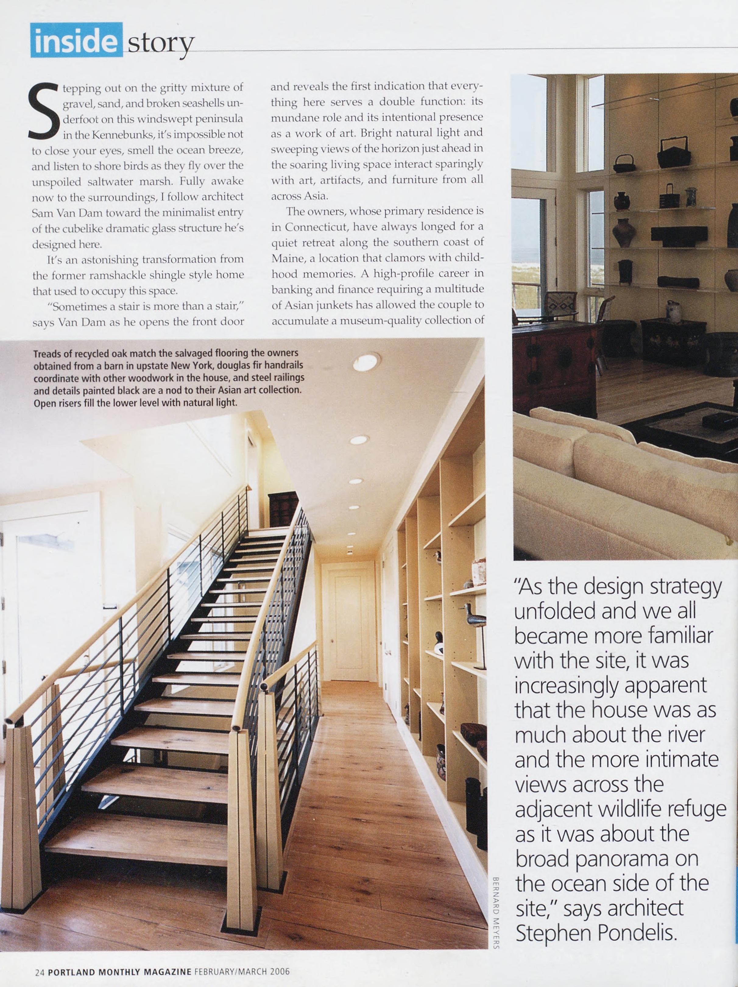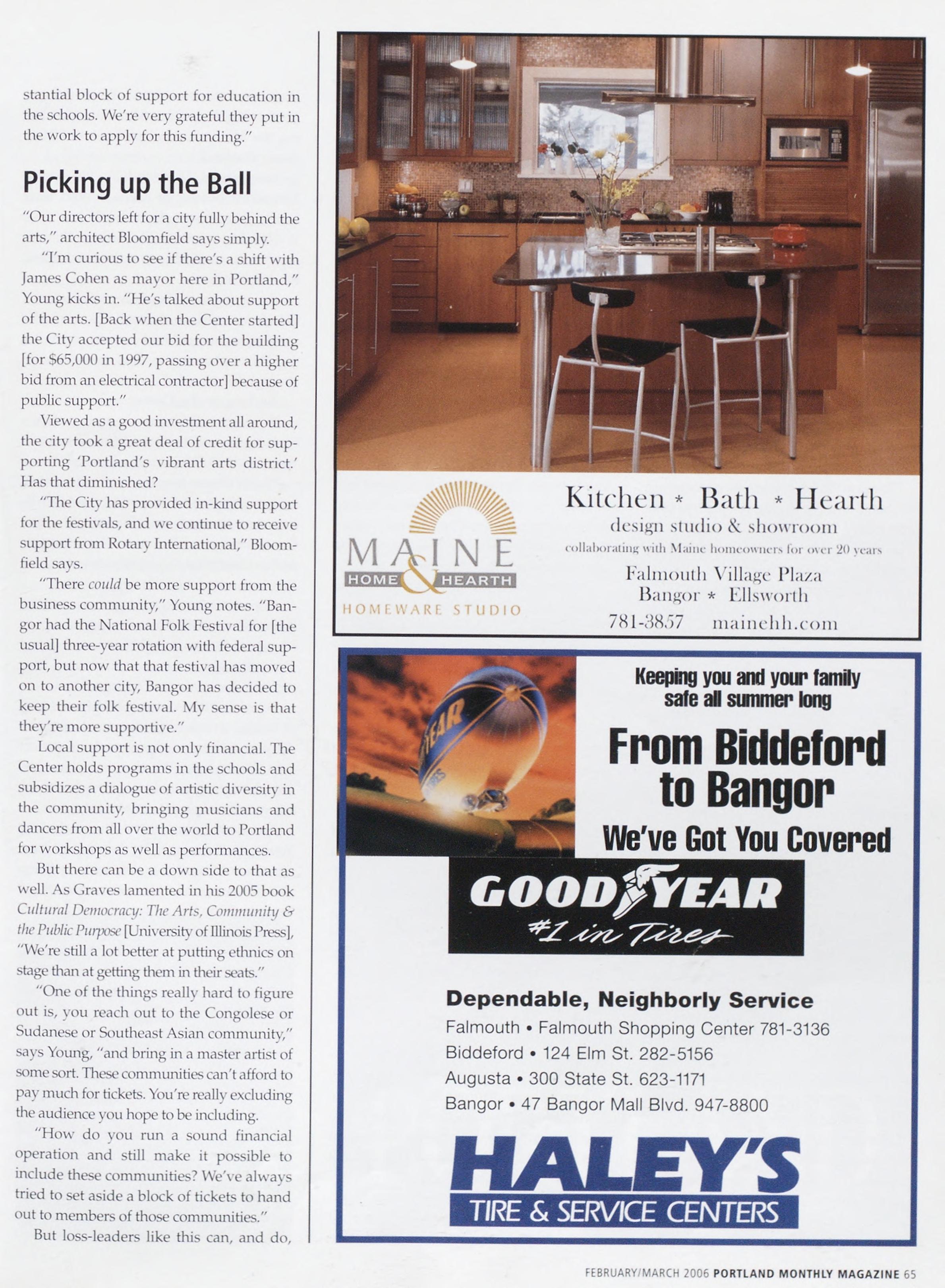 Newsstand Cover Date: February/March 2006, published in January 2006,Vol.21,No.1,copyright2006.Portland Magazineismailedat third-classmailratesinPortland,ME04101(ISSN:1073-1857).Opinions expressedinarticlesarethoseofauthorsanddonotrepresenteditori¬ alpositionsofPortland Magazine, letterstotheeditorarewelcome andwillbetreatedasunconditionallyassignedforpublicationand copyrightpurposesandassubjecttoPortland Magazine's ^restrict¬ edrighttoeditandcommenteditorially.Responsibleonlyforthatpor¬ tionofanyadvertisementwhichisprintedincorrectly.Advertisersare responsibleforcopyrightsofmaterialstheysubmit.Nothinginthis issuemaybereprintedinwholeorinpartwithoutwrittenpermission fromthepublishers.Submissionswelcome,butwetakenoresponsibil¬ ityforunsolicitedmaterials.