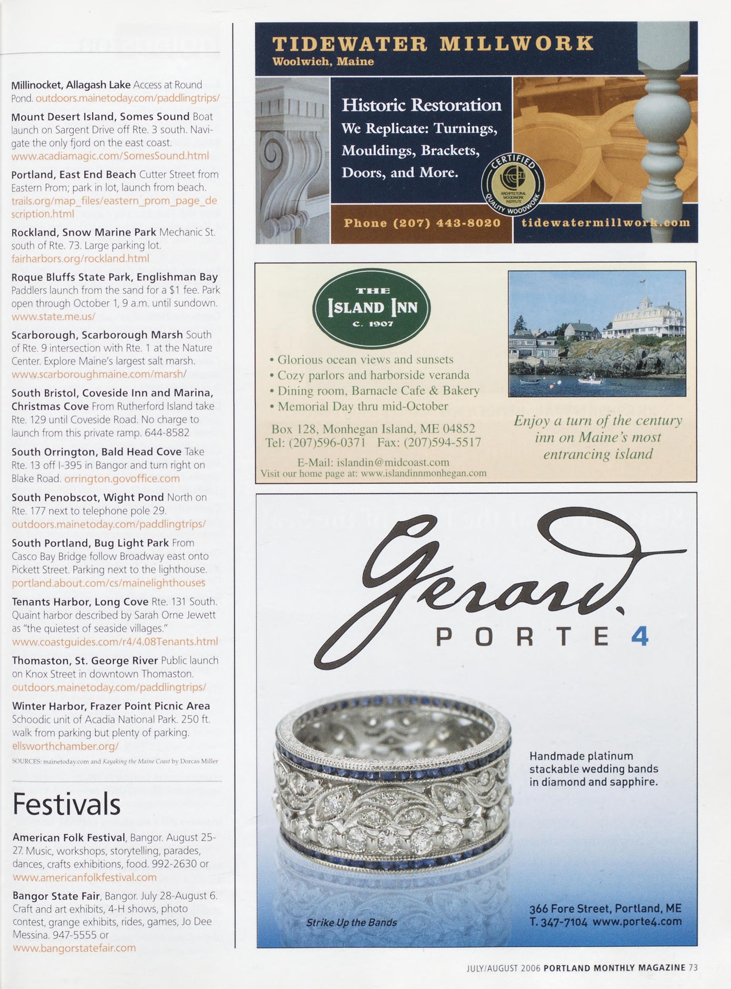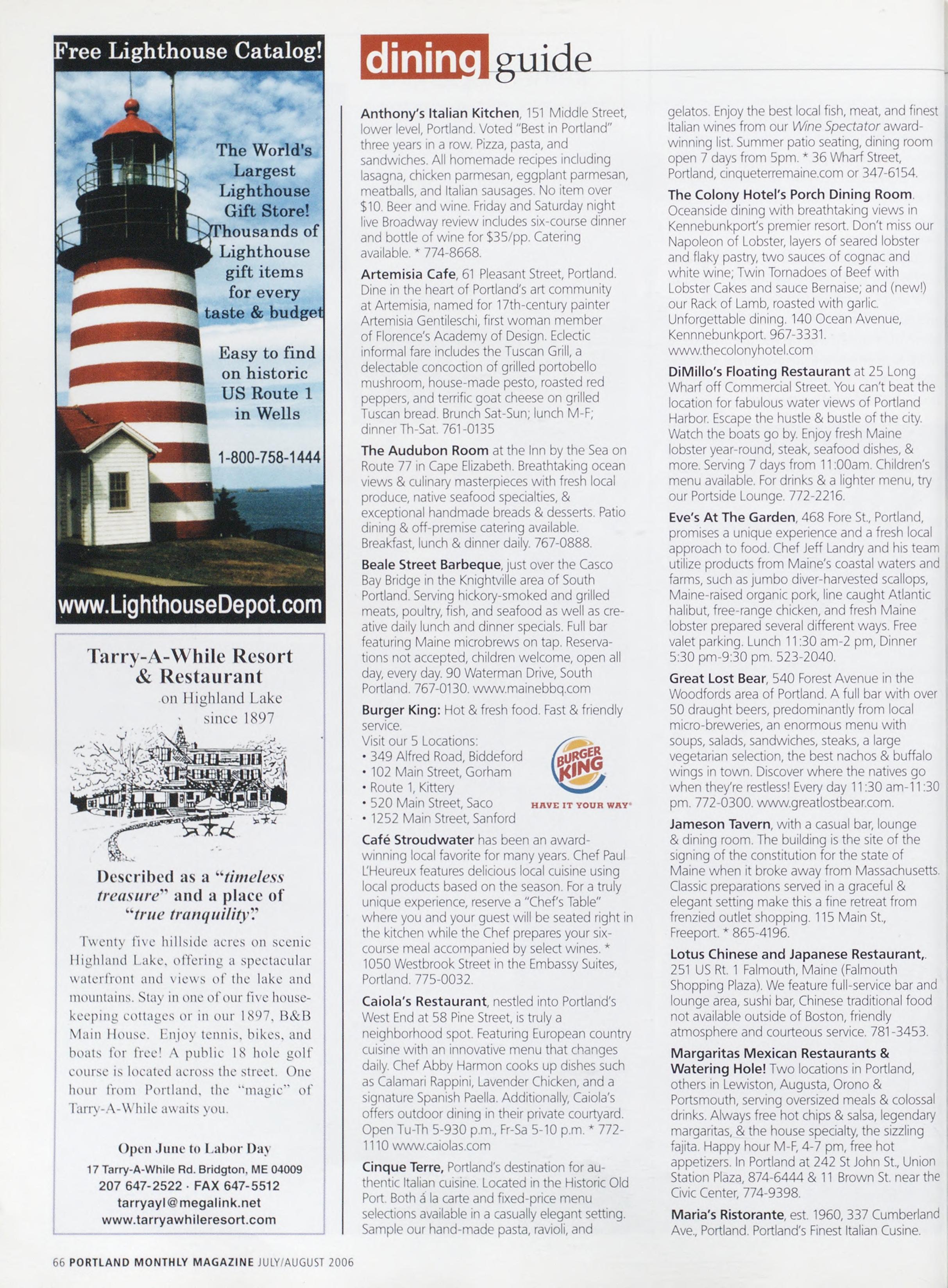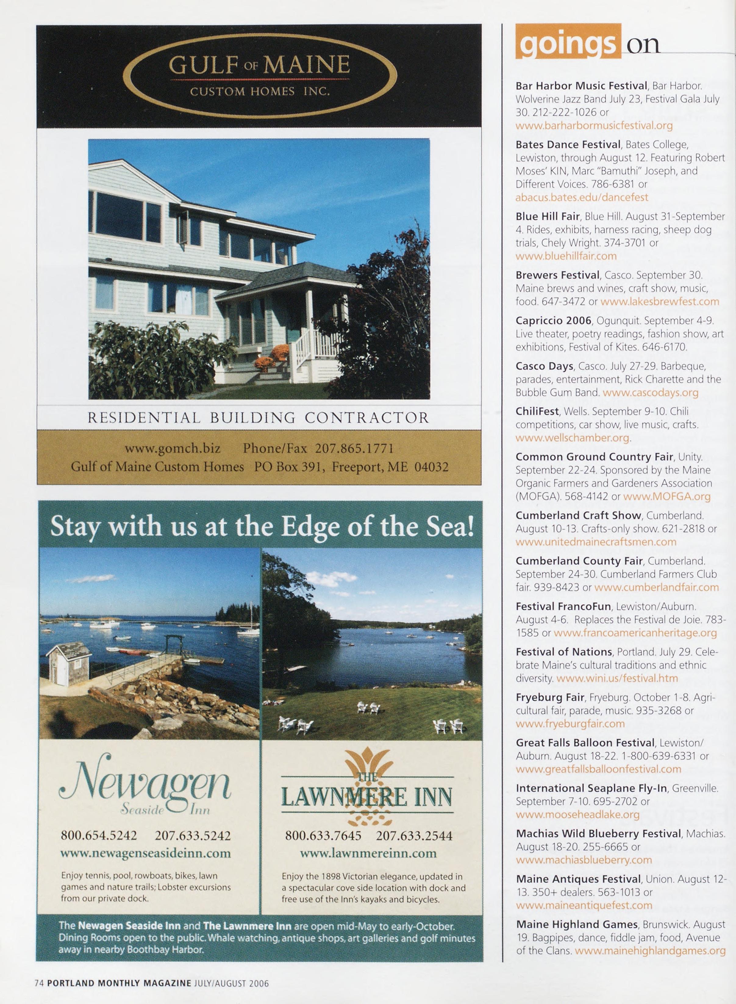 Newsstand Cover Date: July/August 2006, published in June 2006, Vol. 21, No. 5, copyright 2006.Portland Magazine ismailedatthird-class mail rates in Portland, ME 04101 (ISSN: 1073-1857). Opinions expressed in articles are those of authors and do not represent editorial positions ofPortland Magazine. Letters to the editor are welcome and will be treated as unconditionally assigned for publication and copyright pur¬ poses and as subject toPortland Magazine's unrestrictedrighttoedit and comment editorially. Responsible only for that portion of any advertisement which is printed incorrectly. Advertisers are responsible for copyrights of materials they submit. Nothing in this issue may be reprinted in whole or in part without written permission from the pub¬ lishers. Submissions welcome, but we take no responsibility for unso¬ licitedmaterials.