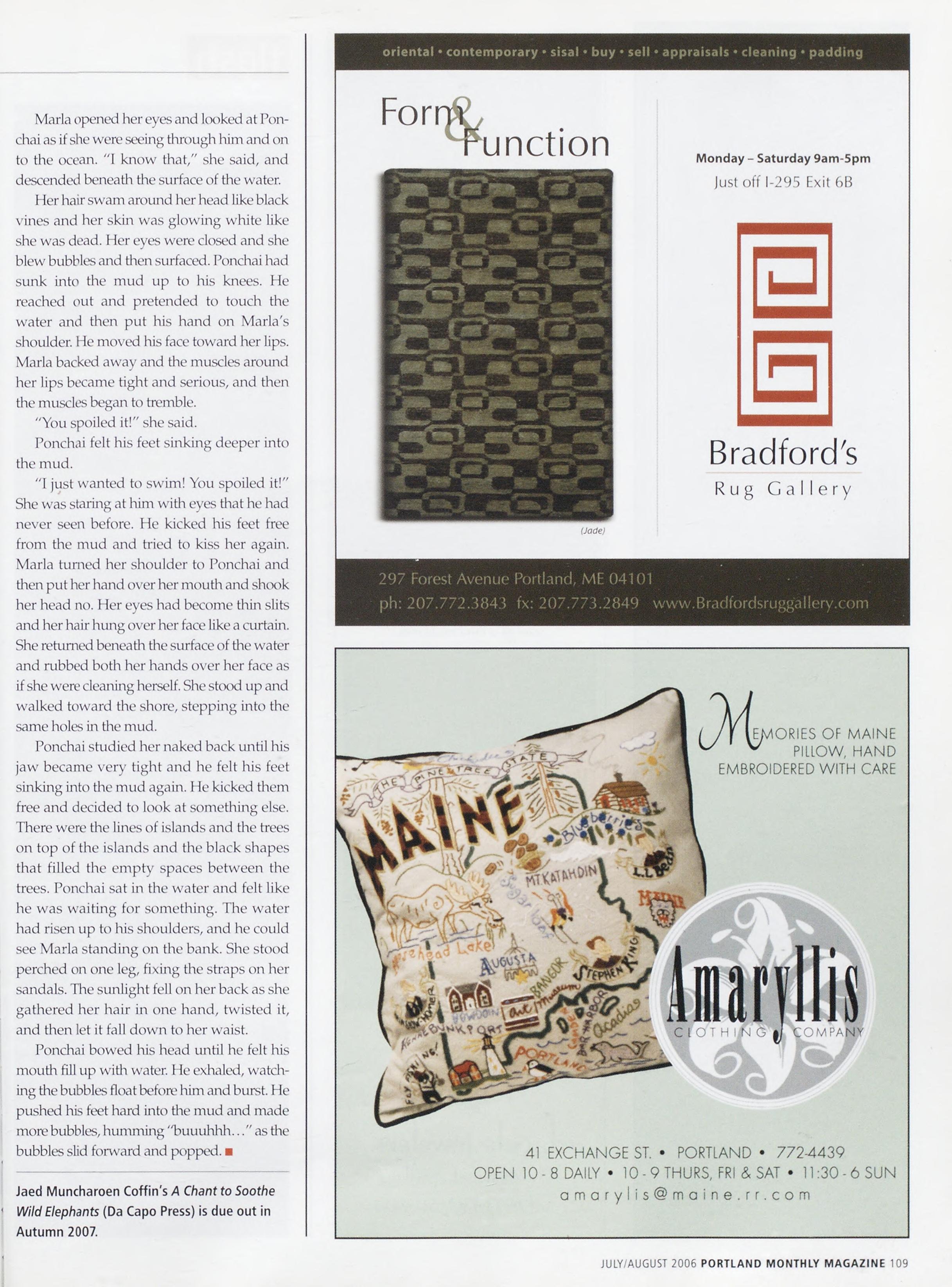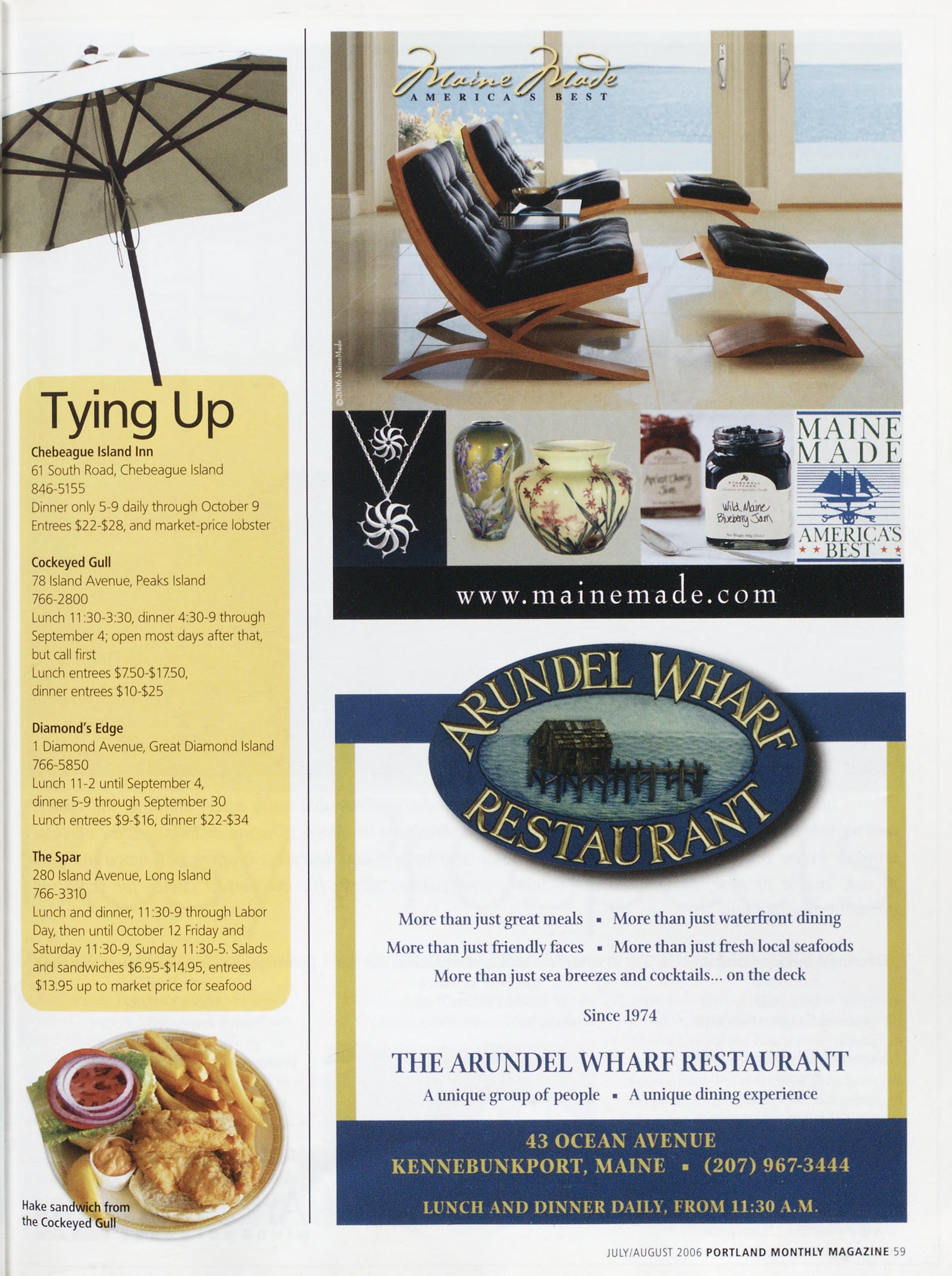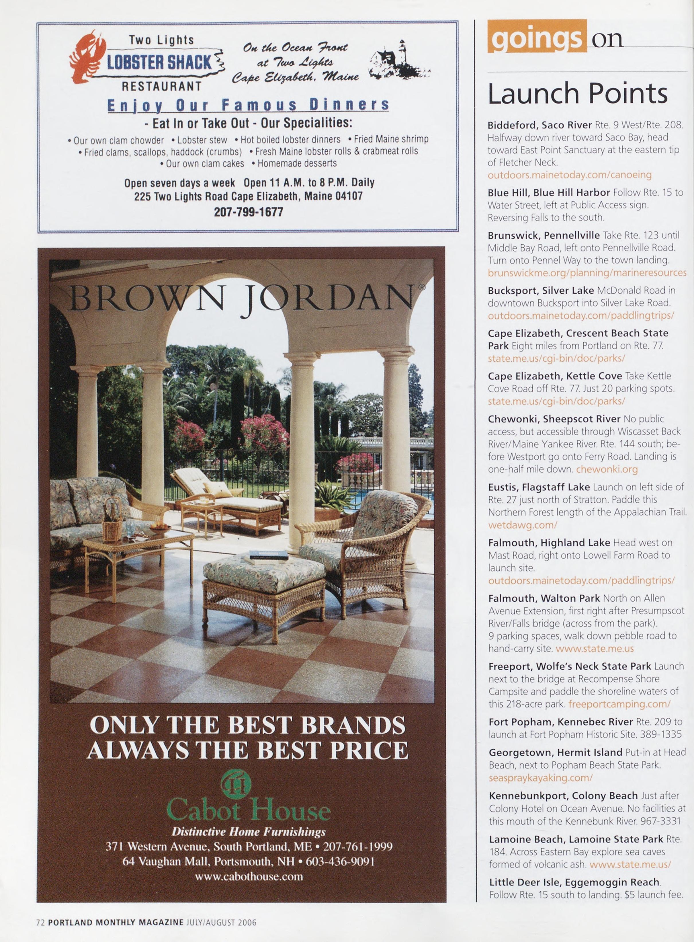 Newsstand Cover Date: July/August 2006, published in June 2006, Vol. 21, No. 5, copyright 2006.Portland Magazine ismailedatthird-class mail rates in Portland, ME 04101 (ISSN: 1073-1857). Opinions expressed in articles are those of authors and do not represent editorial positions ofPortland Magazine. Letters to the editor are welcome and will be treated as unconditionally assigned for publication and copyright pur¬ poses and as subject toPortland Magazine's unrestrictedrighttoedit and comment editorially. Responsible only for that portion of any advertisement which is printed incorrectly. Advertisers are responsible for copyrights of materials they submit. Nothing in this issue may be reprinted in whole or in part without written permission from the pub¬ lishers. Submissions welcome, but we take no responsibility for unso¬ licitedmaterials.