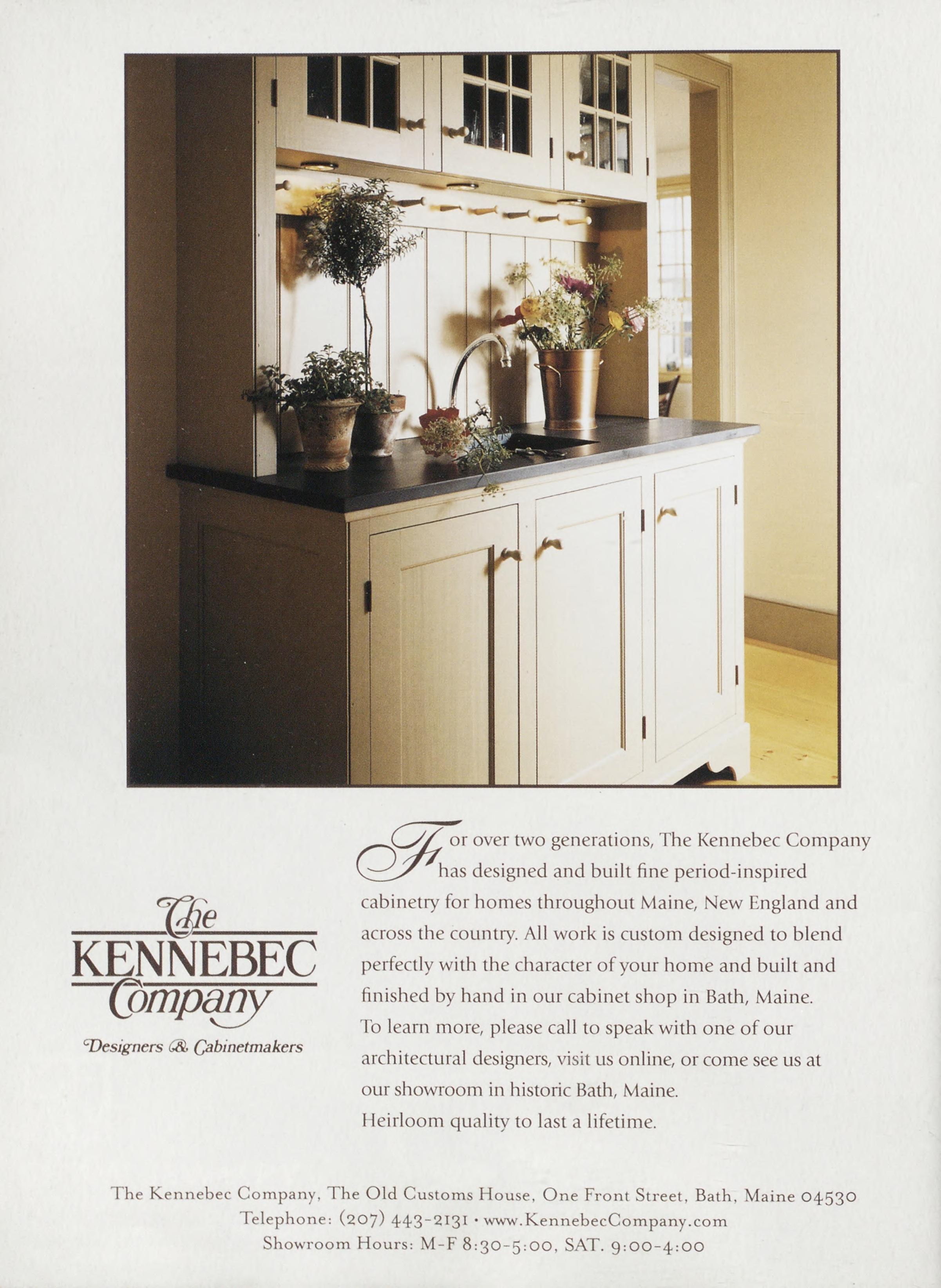 orovertwogenerations,TheKennebecCompany -yXhasdesignedandbuiltfineperiod-inspired cabinetryforhomesthroughoutMaine,NewEnglandand acrossthecountry.Allworkiscustomdesignedtoblend perfectlywiththecharacterofyourhomeandbuiltand finishedbyhandinourcabinetshopinBath,Maine. Tolearnmore,pleasecalltospeakwithoneofour architecturaldesigners,visitusonline,orcomeseeusat ourshowroominhistoricBath,Maine. Heirloomqualitytolastalifetime.