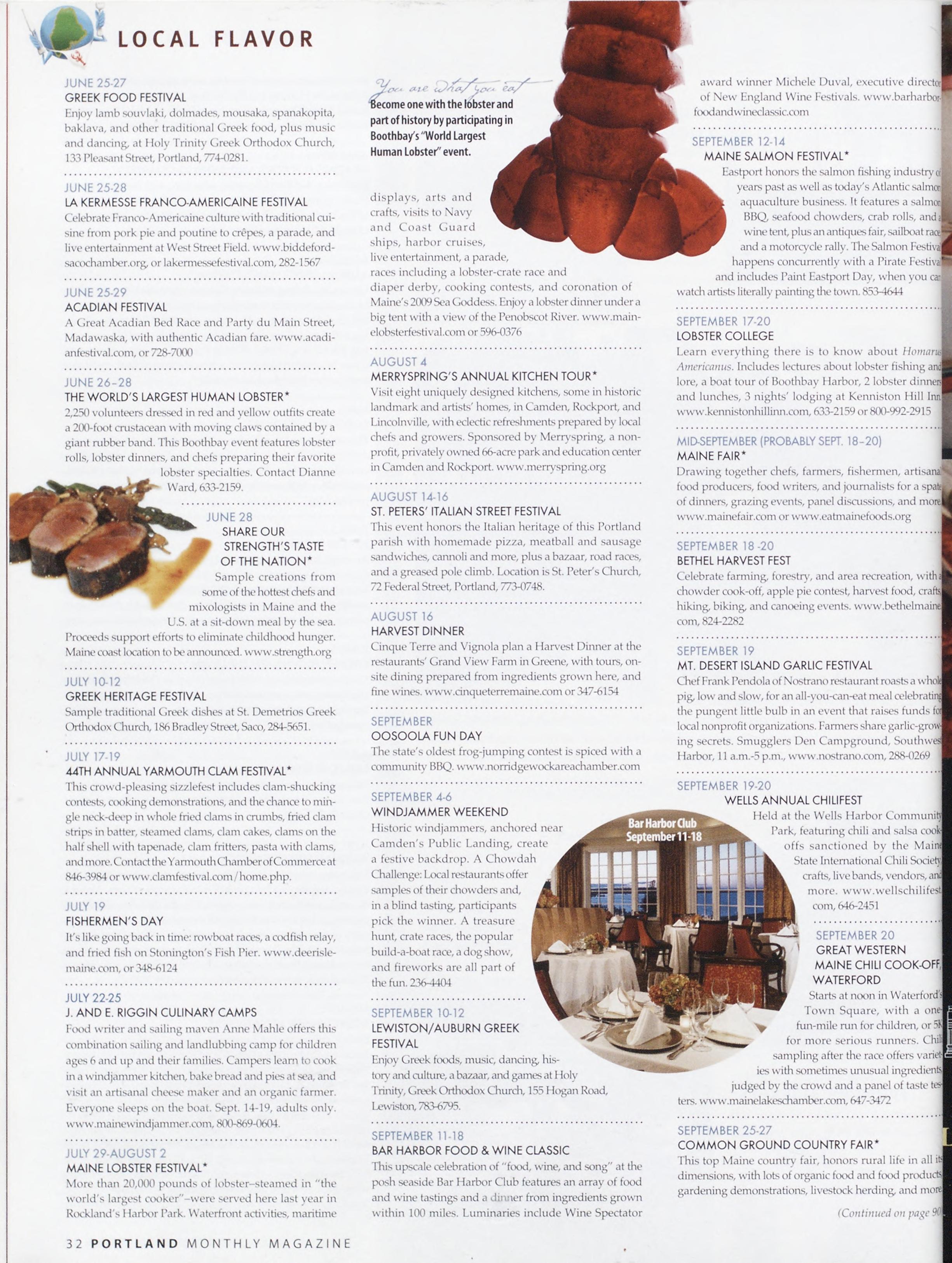 Your four-season directory to over 95 gourmet festivals, soirees, wine tastings, deaths by chocolate, exhibitions, world's largest human lobster, and celebrity battles of the chefs: Get out your Blackberry-this year's going to be incredible.