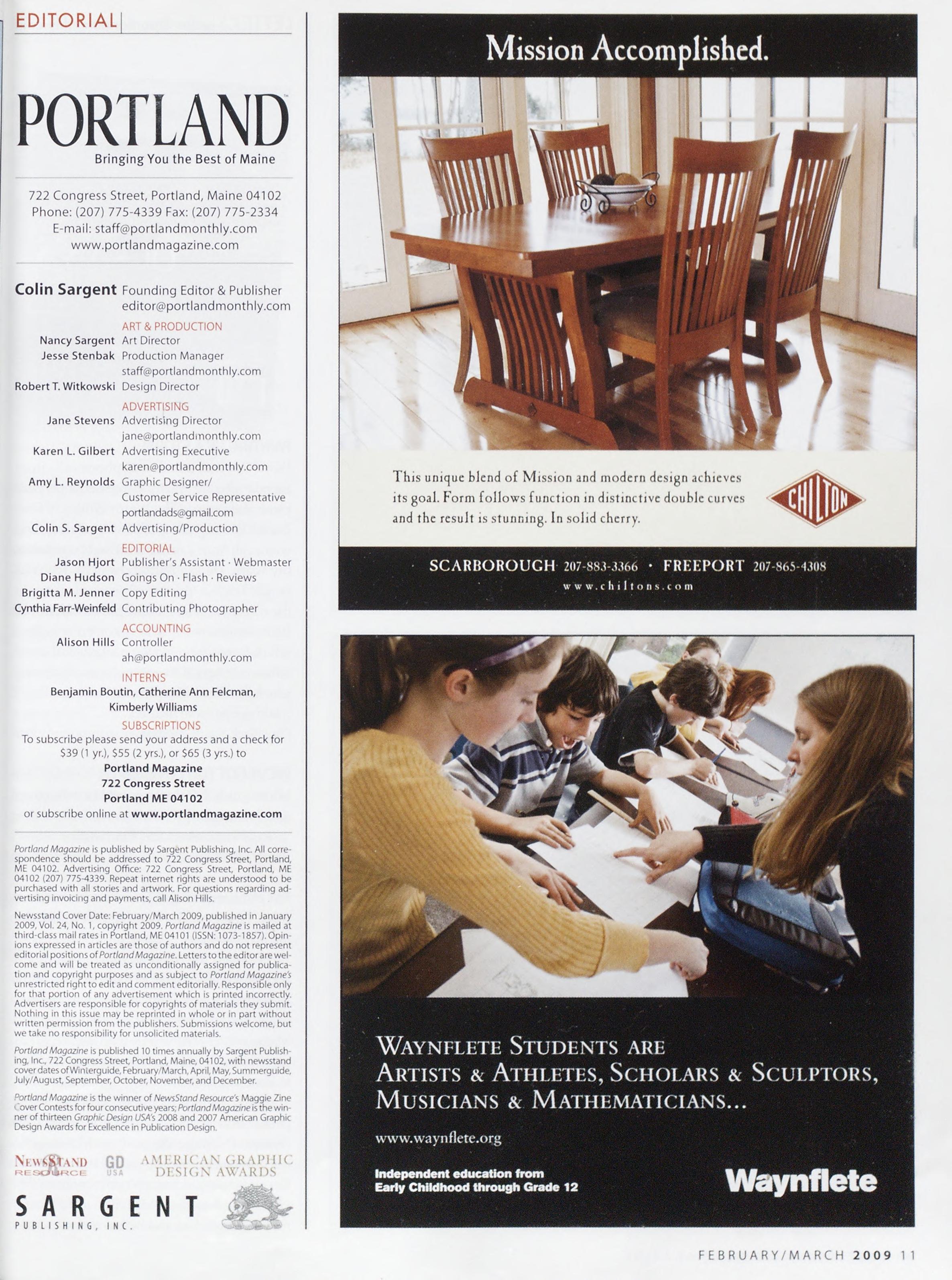 Newsstand Cover Date: February/March 2009, published in January 2009,Vol.24,No.1,copyright2009.Portland Magazineismailedat third-classmailratesinPortland,ME04101(ISSN:1073-1857).Opin¬ ionsexpressedinarticlesarethoseofauthorsanddonotrepresent editorialpositionsofPortland Magazine.Letterstotheeditorarewel¬ come and will be treated as unconditionally assigned for publica¬ tion and copyright purposes and as subject toPortland Magazine's unrestrictedrighttoeditandcommenteditorially.Responsibleonly forthatportionofanyadvertisementwhichisprintedincorrectly. Advertisersareresponsibleforcopyrightsofmaterialstheysubmit. Nothing in this issue may be reprinted in whole or in part without written permission from the publishers. Submissions welcome, but wetakenoresponsibilityforunsolicitedmaterials.