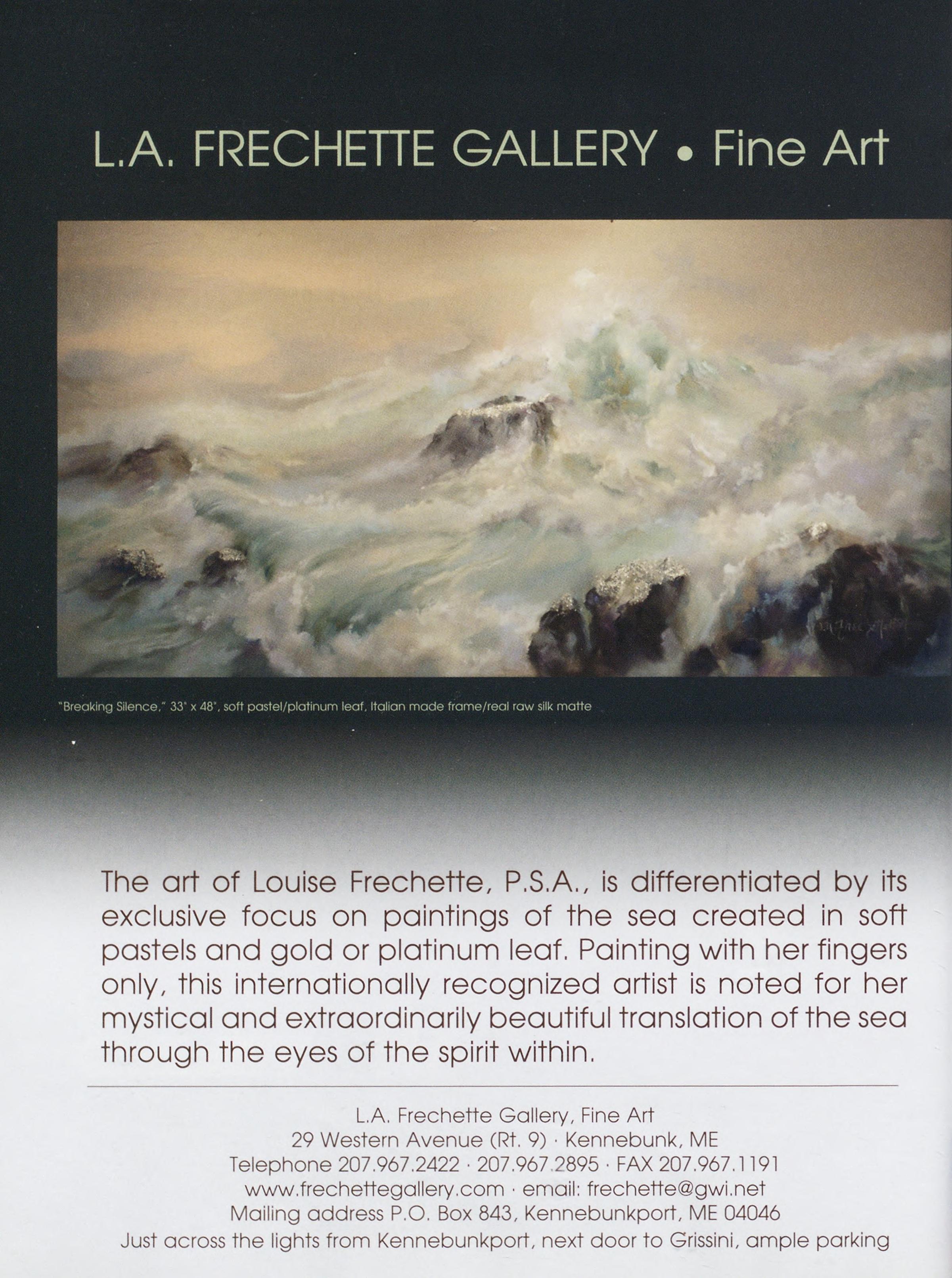 TheartofLouiseFrechette,P.S.A.,isdifferentiatedbyits exclusivefocusonpaintingsoftheseacreatedinsoft pastelsandgoldorplatinumleaf.Paintingwithherfingers only,thisinternationallyrecognizedartistisnotedforher mysticalandextraordinarilybeautifultranslationofthesea throughtheeyesofthespiritwithin.