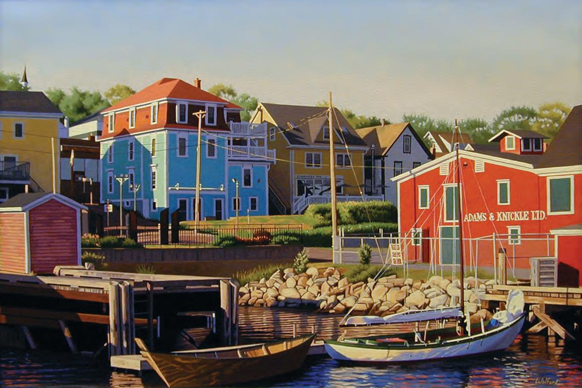 Jim Wolford cannot be characterized as a landscape painter in the traditional sense. His works often feel like intimate portraits or still life paintings. Though light is often impeccably rendered as he captures the details of buildings or entire harbors, he seems to remove any atmosphere that would obscure the strong linear nature of his design. His paintings evoke a sense of place; he often takes subjects considered mundane and transforms them by finding and pointing out their inherent beauty.