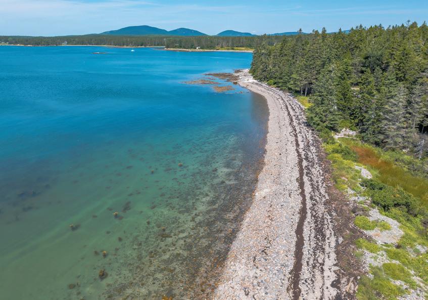 tine proper ty and an amazing 2,700± feet of sandy and pebbly shoreline. This private haven, at the end of a secluded point, presents breathtaking westerly views across open waters, with the majestic mountains of Acadia National Park ser ving as your backdrop The proper ty is a unique blend of rustic charm and natural beauty, featuring several structures that add to