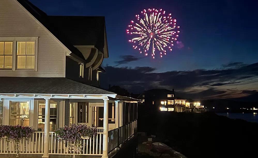 Where the views are even better. Where will the person who buys this house be standing when they say, “I want this place—right now!” You’ll absolutely be standing on the porch. You’re looking across toward the Cli House and the lights from Kennebunkport.