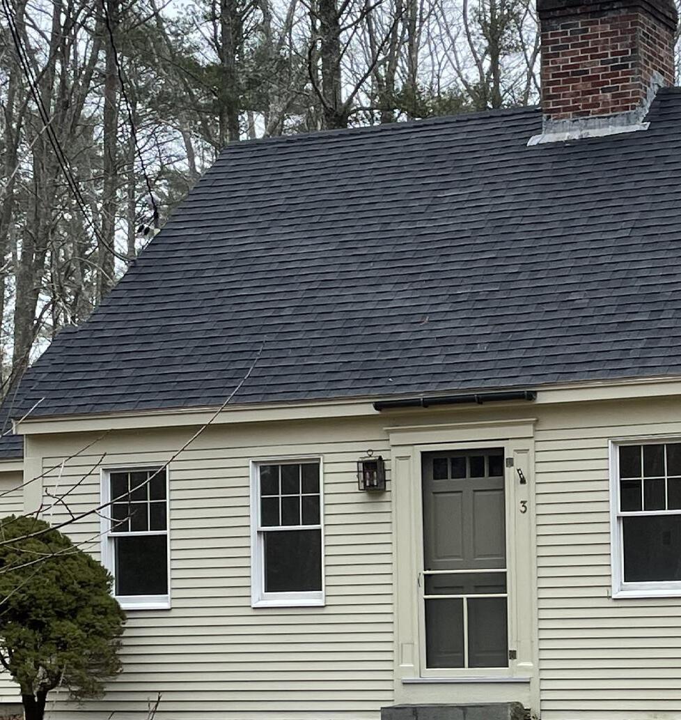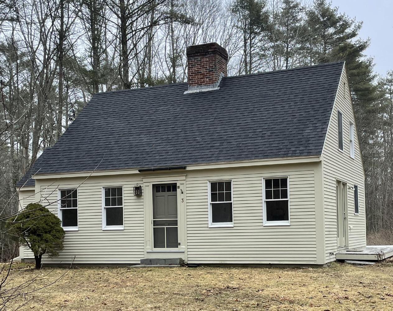 Sweet sunlit cape cotage on private 2.5 acre lot set back from road. Open concept kitchen/dining area. Floors of pine and hardwood. Ceiling is exposed beams with tongue and groove boards Loft bedroom with skylight. Large 3 fue brick chimney ready for comforting wood stoves. Full basement and large storage shed. Recent oil tank and roof shingles. Sold at $485,000