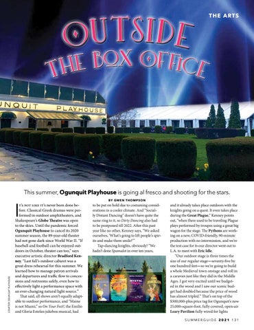 and it already takes place outdoors with the knights going on a quest. It even takes place during the Great Plague,” Kenney points out, “when there used to be traveling Plague plays performed by troupes using a great big wagon for the stage. The Pythons are working on a new, COVID-friendly, 90-minute production with no intermission, and we’re the test case for it–our director went out to L.A. to meet with Eric Idle. “Our outdoor stage is three times the size of our regular stage—seventy-five by one hundred feet—so we’re going to build a whole Medieval town onstage and roll in a caravan just like they did in the Middle Ages. I got very excited until we budgeted in the wood and I saw our scenic budget had doubled because the price of wood has almost tripled.” That’s on top of the $300,000-plus price tag for Ogunquit’s new 25,000-square-foot, fully covered, open-air Leary Pavilion fully wired for lights SUMMERGUIDE 2021 131
