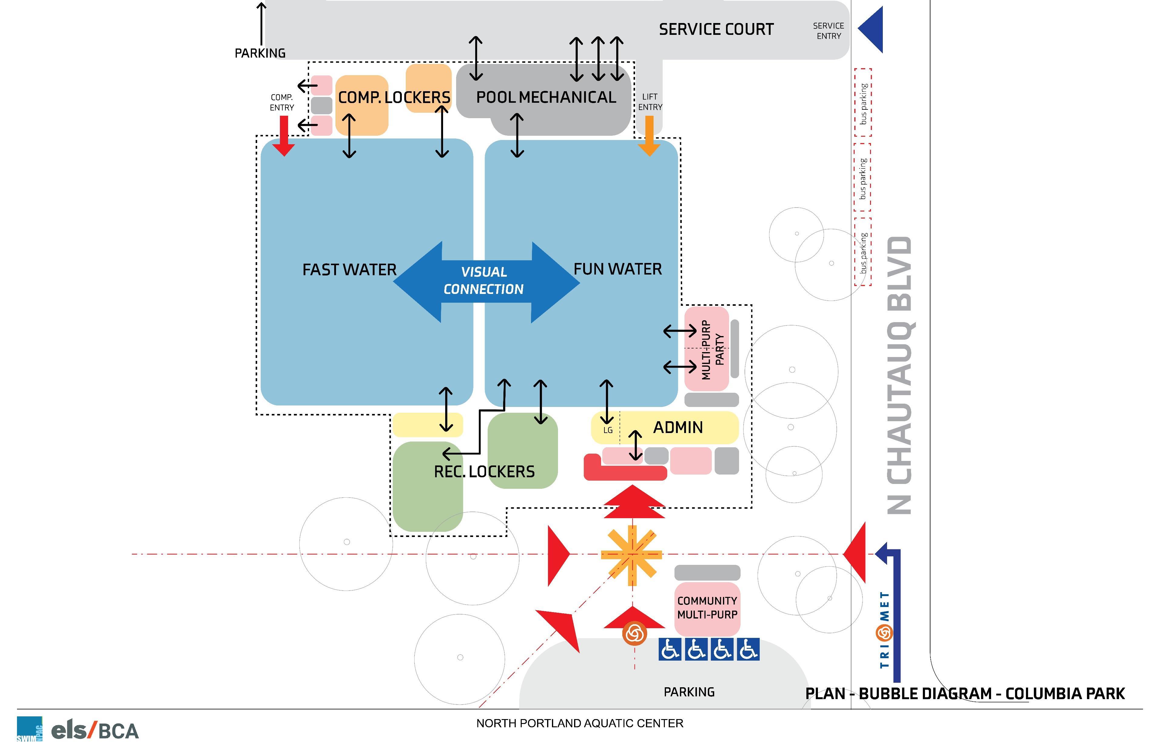 Columbia Park Aquatic Facility Concept: Aerial view looking northeastColumbia Park Aquatic Facility Concept: View looking north showing entry from parking lot