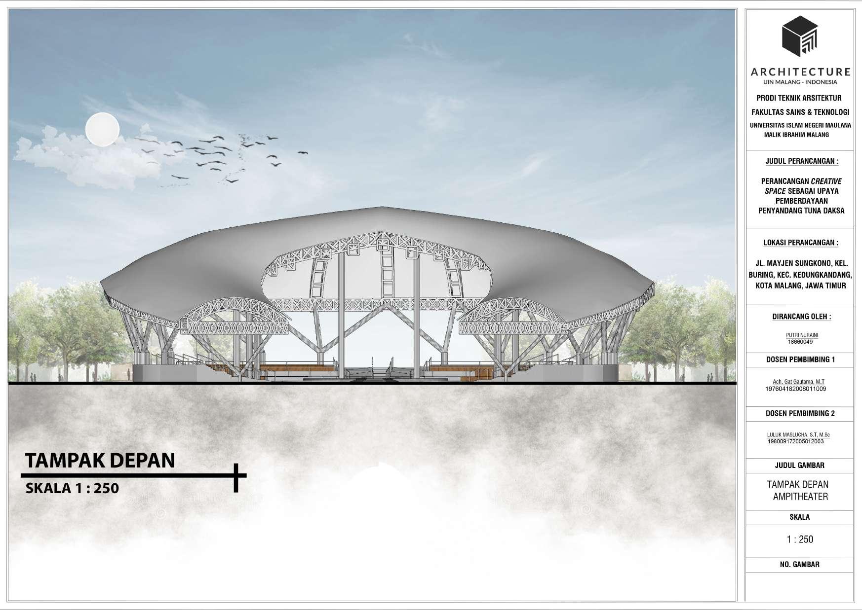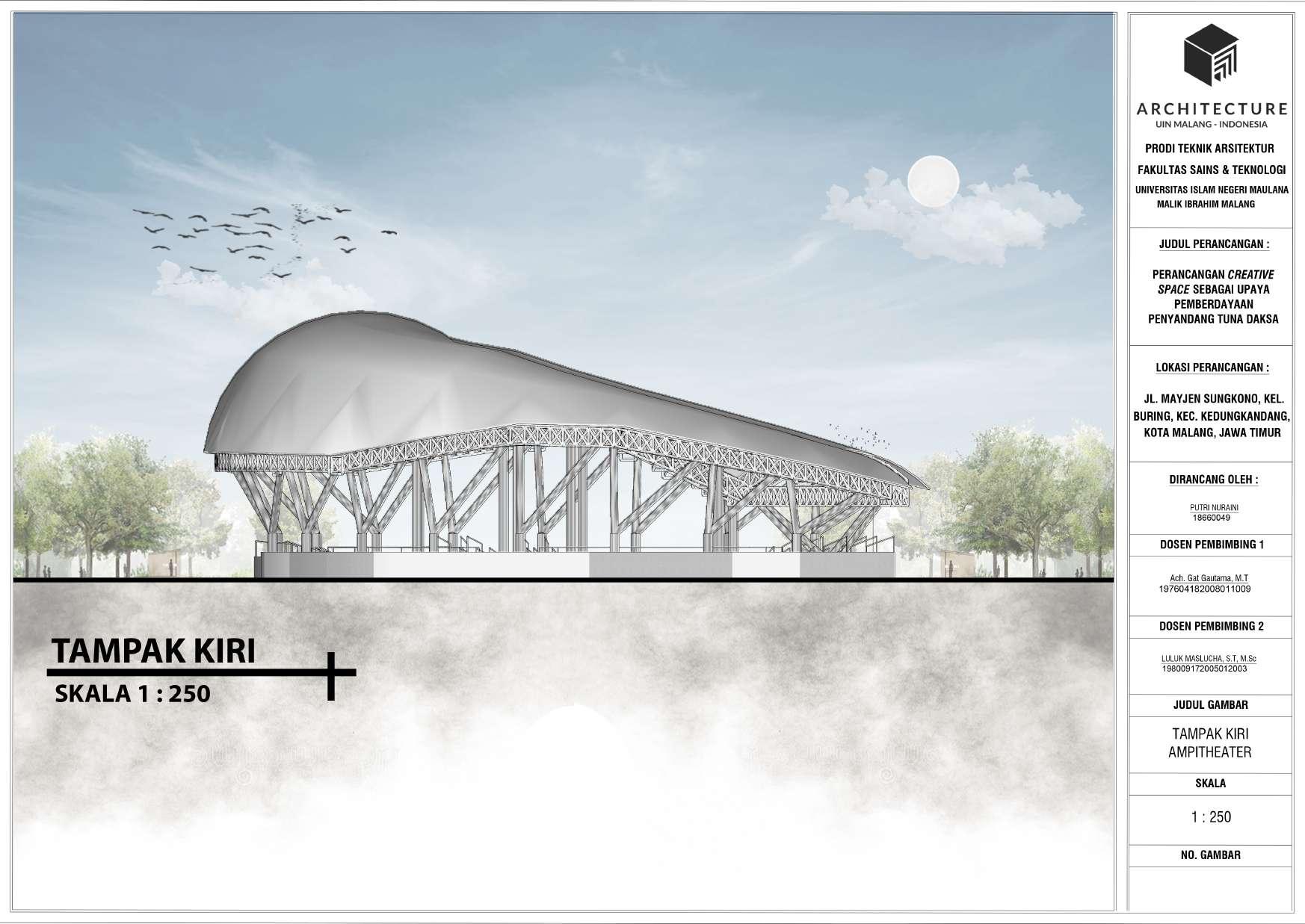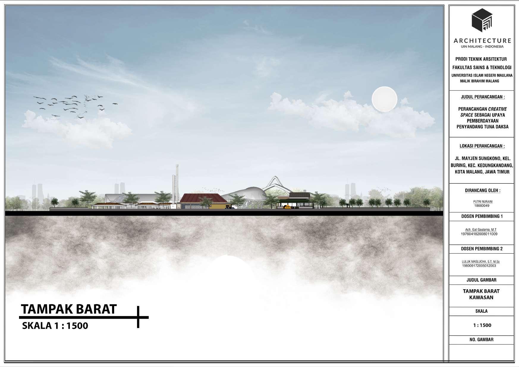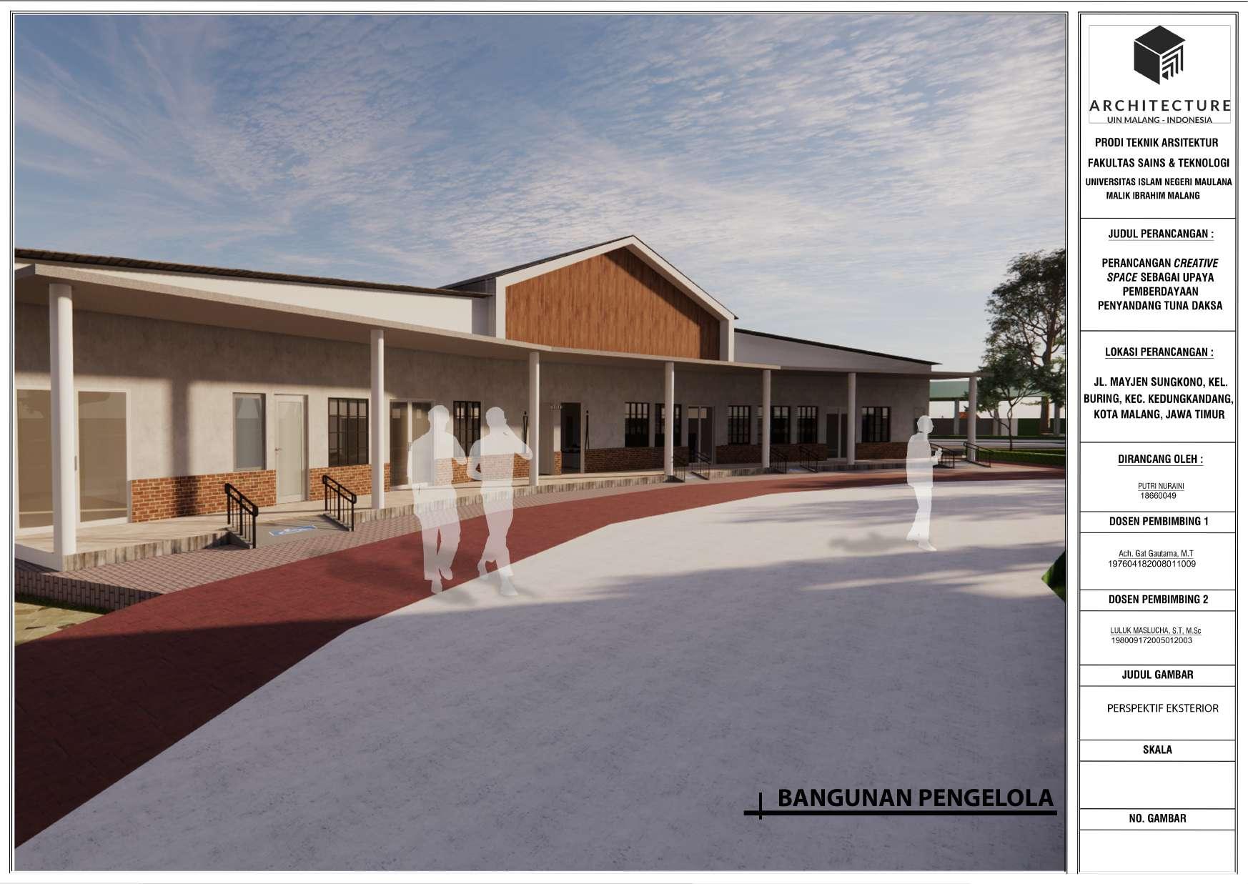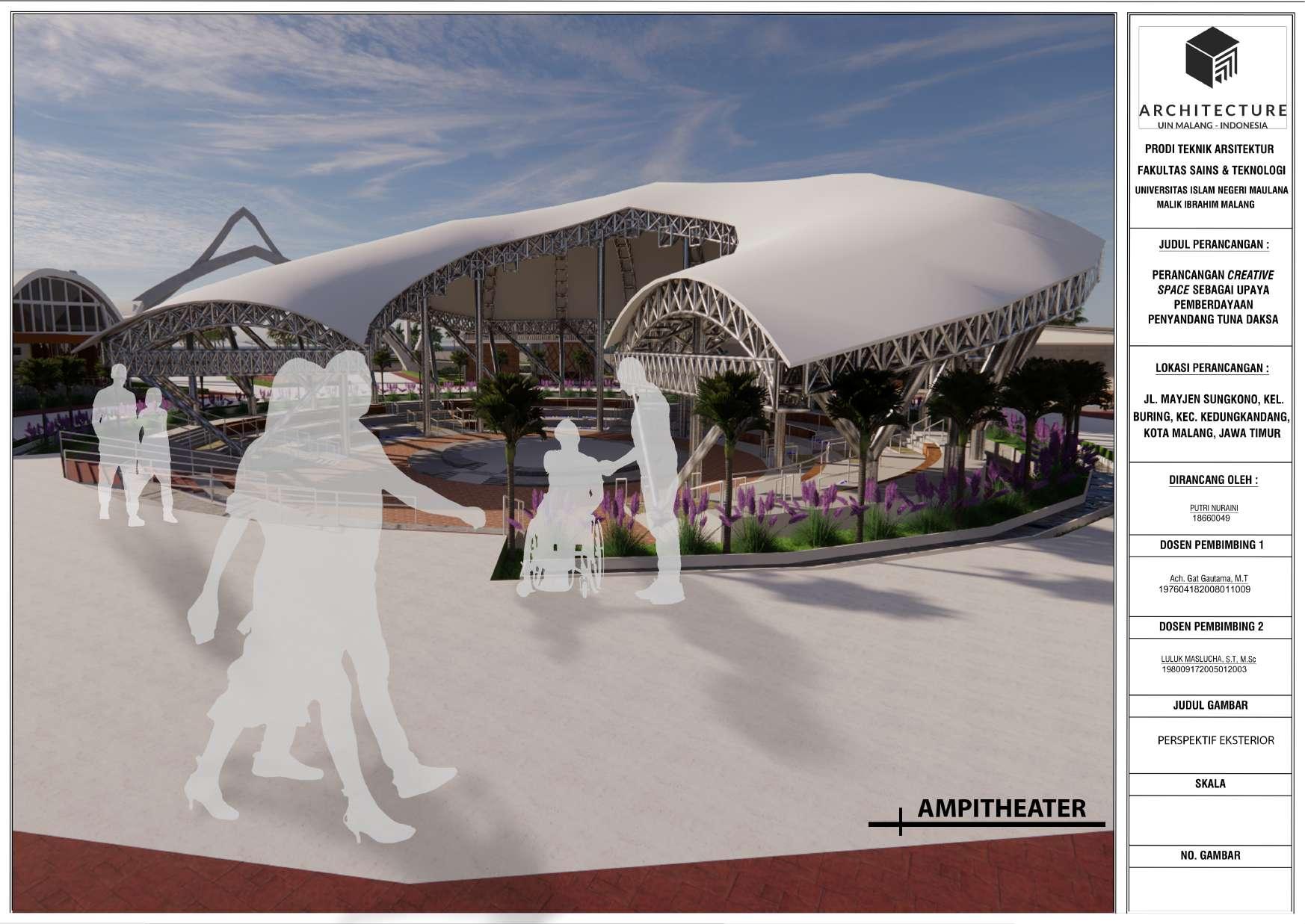 Laporan tugas akhir ini telah dipertahankan di hadapan dewan penguji dan diterima sebagai salah satu syarat memperoleh gelar Sarjana Arsitektur (S.Ars) di UIN Maulana Malik Ibrahim Malang Oleh: PUTRI NURAINI 18660049 Judul : Perancangan Creative Space sebagai Upaya Pemberdayaan Penyandang Tuna Daksa Tanggal Ujian : 16 Juni 2022 iii
