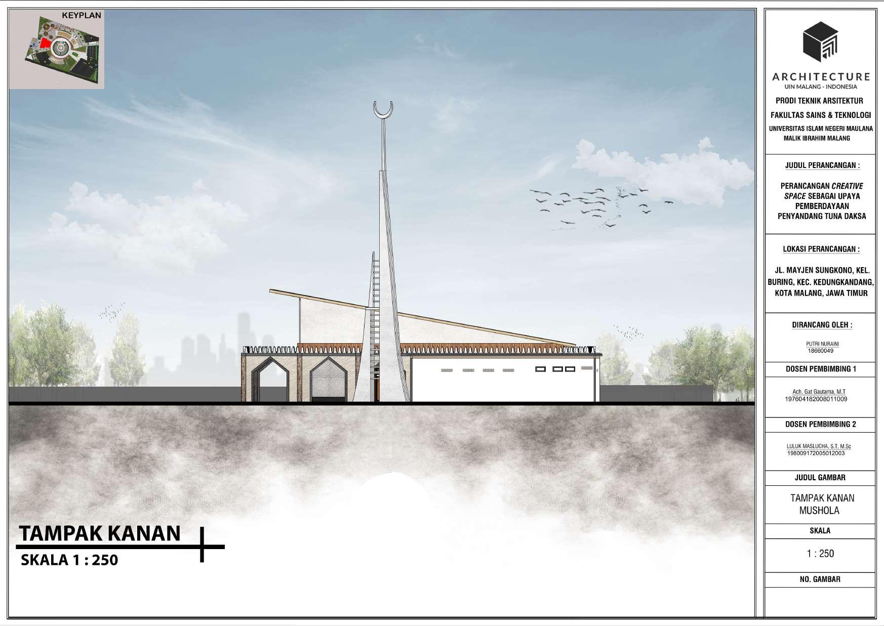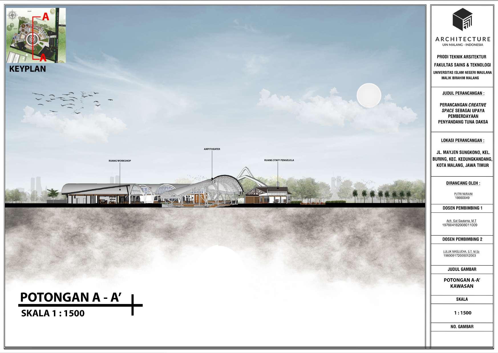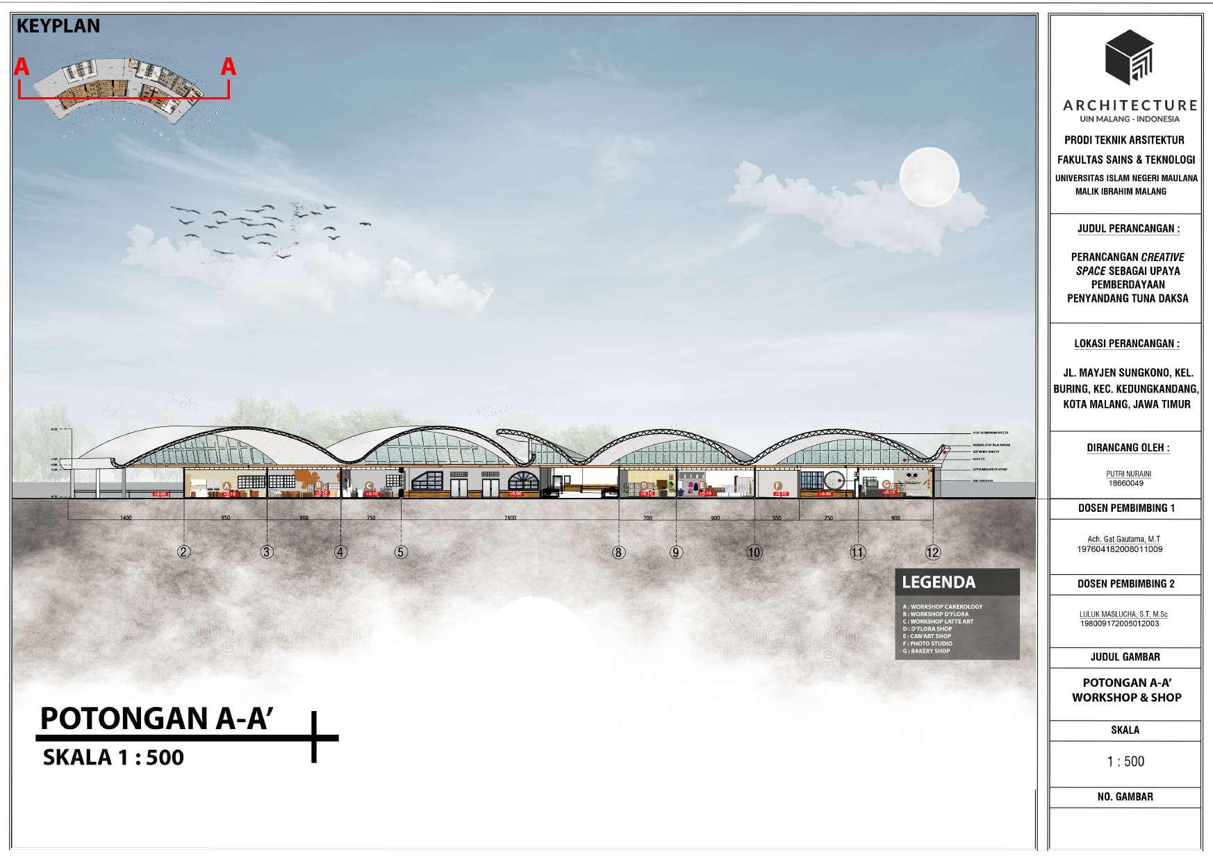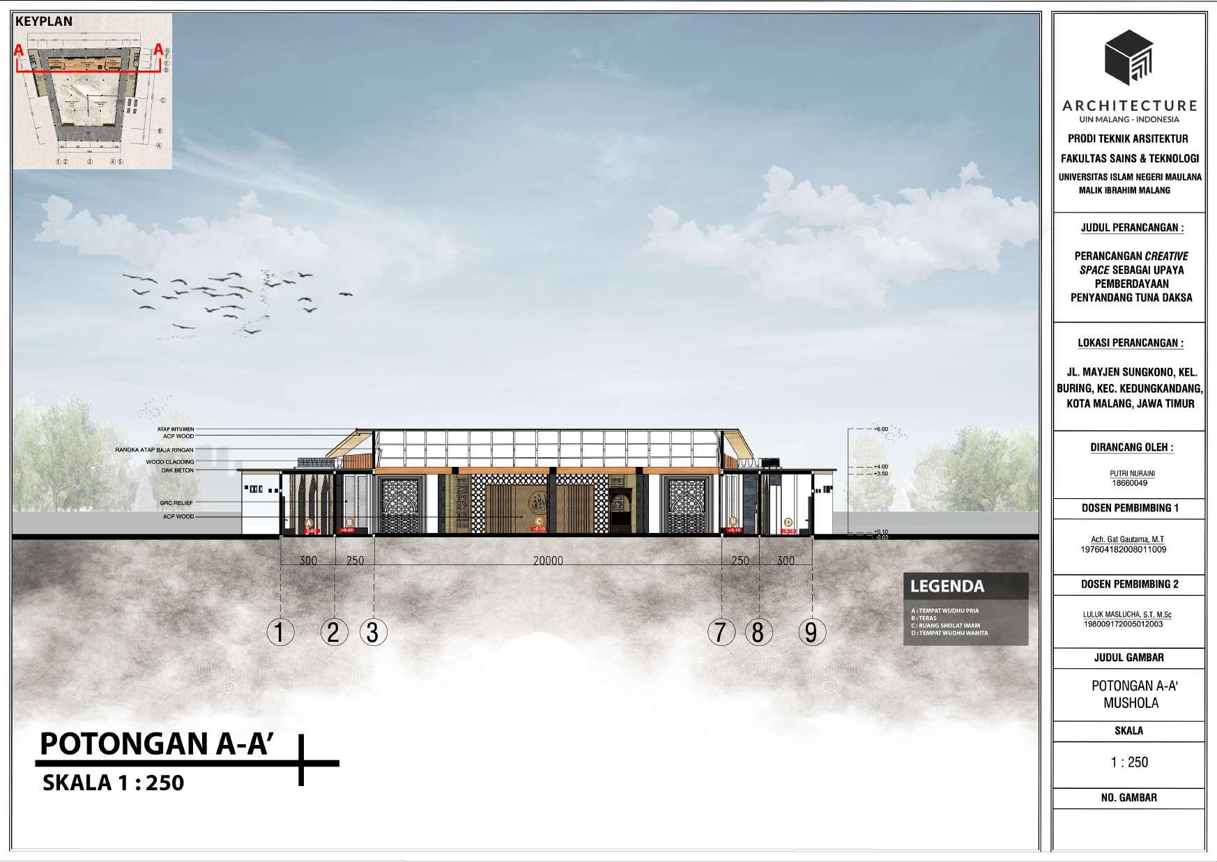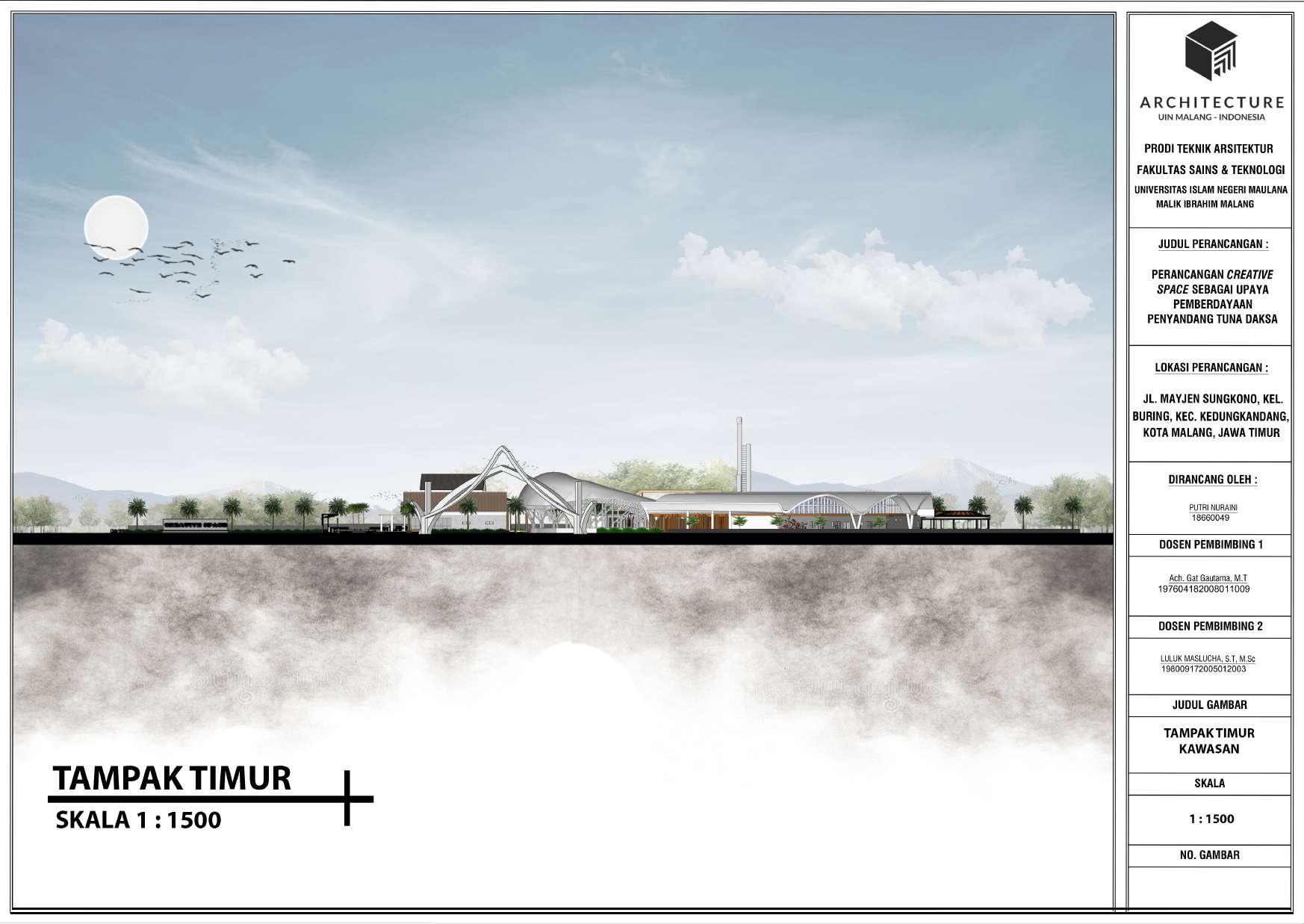 Laporan tugas akhir ini telah dipertahankan di hadapan dewan penguji dan diterima sebagai salah satu syarat memperoleh gelar Sarjana Arsitektur (S.Ars) di UIN Maulana Malik Ibrahim Malang Oleh: PUTRI NURAINI 18660049 Judul : Perancangan Creative Space sebagai Upaya Pemberdayaan Penyandang Tuna Daksa Tanggal Ujian : 16 Juni 2022 iii