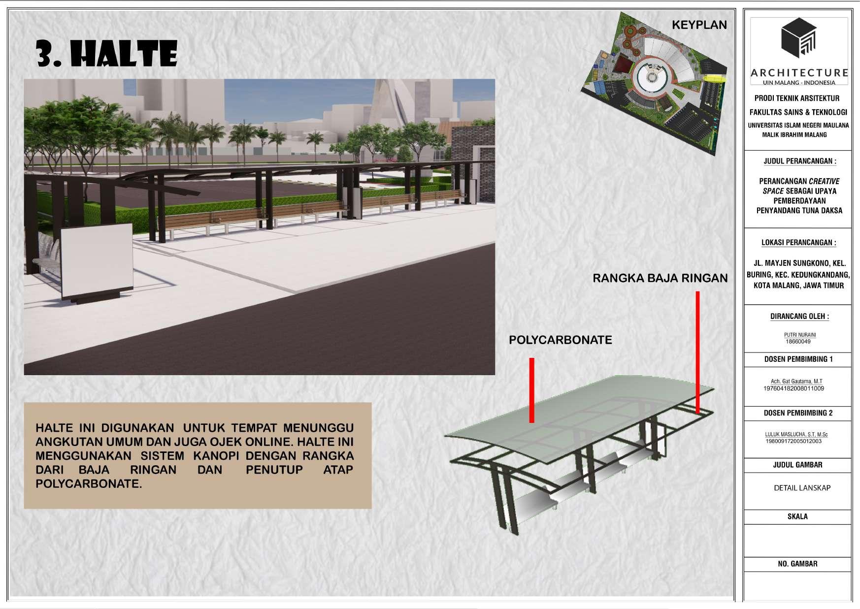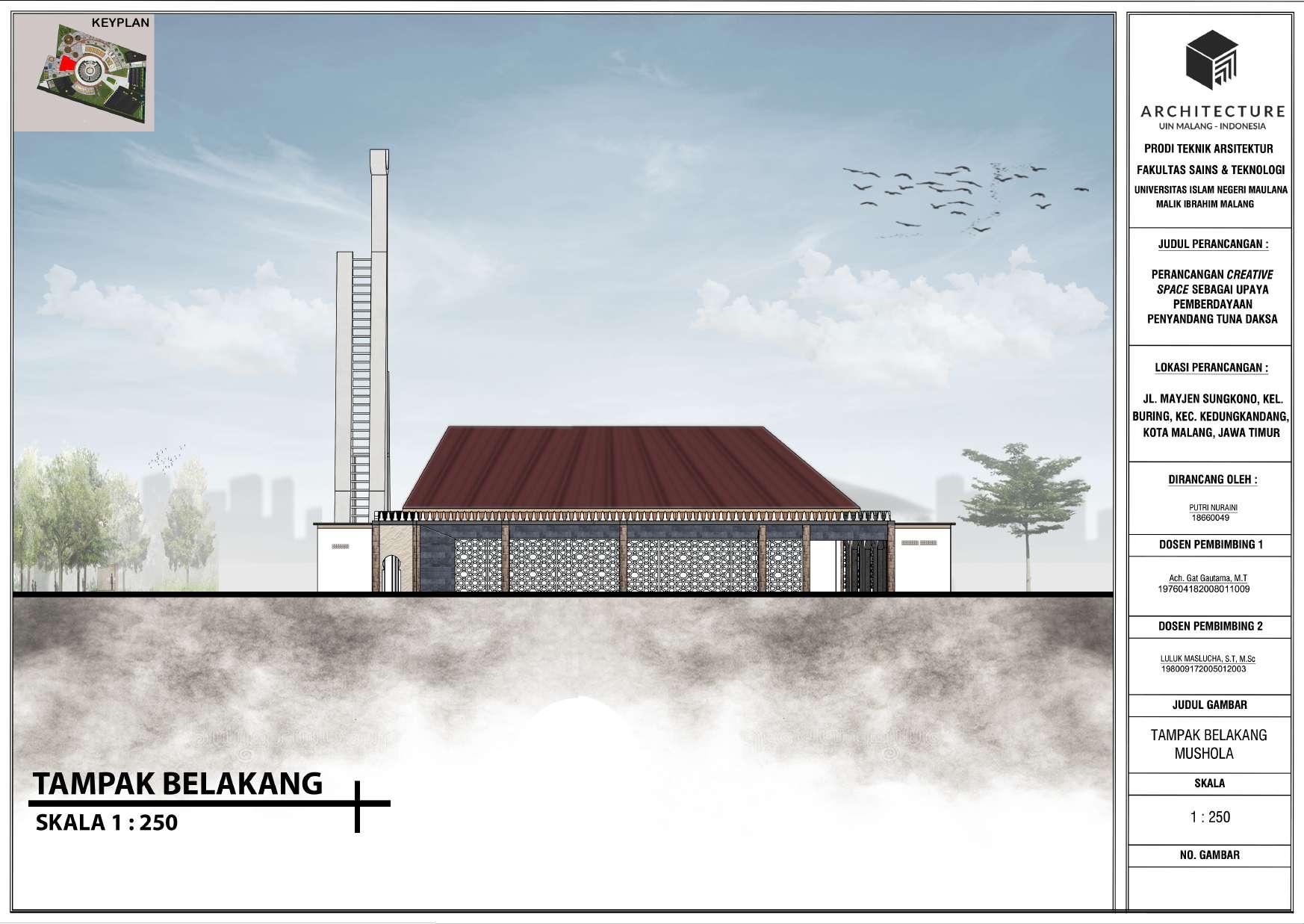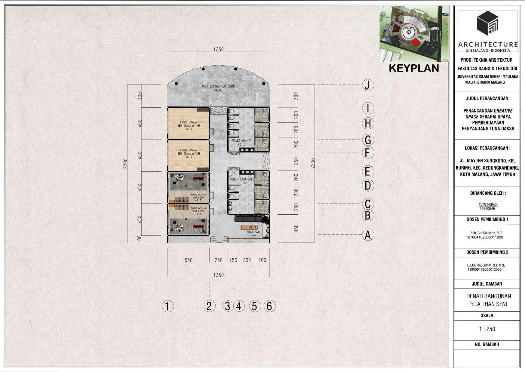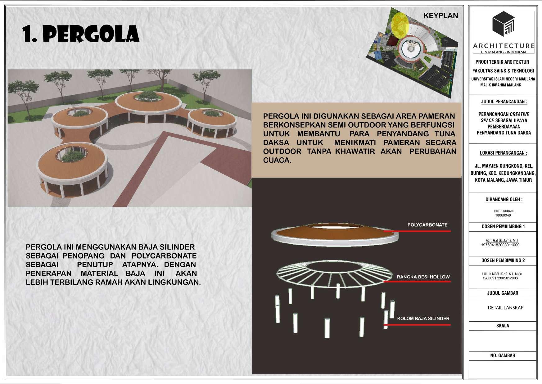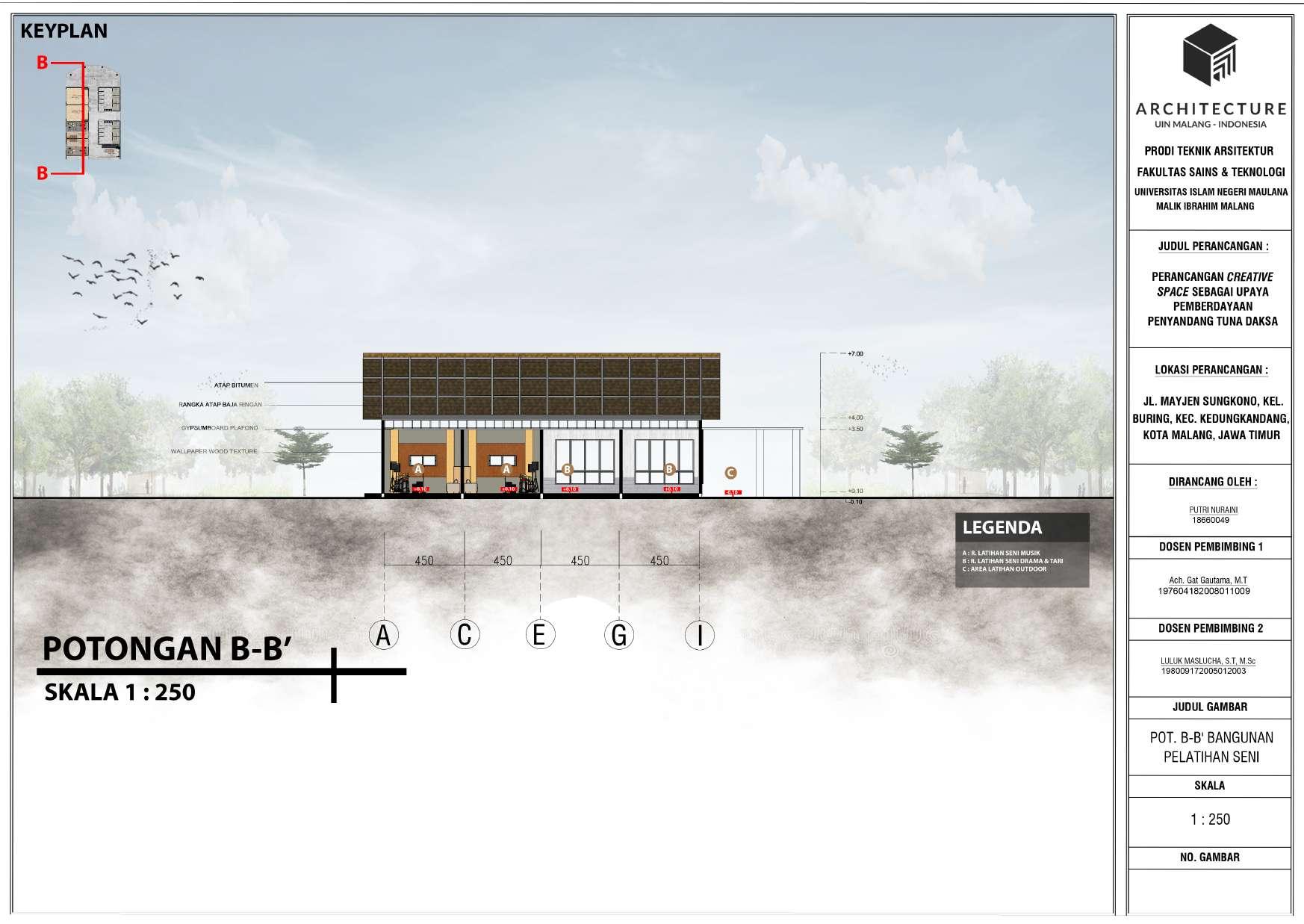 Laporan tugas akhir ini telah dipertahankan di hadapan dewan penguji dan diterima sebagai salah satu syarat memperoleh gelar Sarjana Arsitektur (S.Ars) di UIN Maulana Malik Ibrahim Malang Oleh: PUTRI NURAINI 18660049 Judul : Perancangan Creative Space sebagai Upaya Pemberdayaan Penyandang Tuna Daksa Tanggal Ujian : 16 Juni 2022 iii