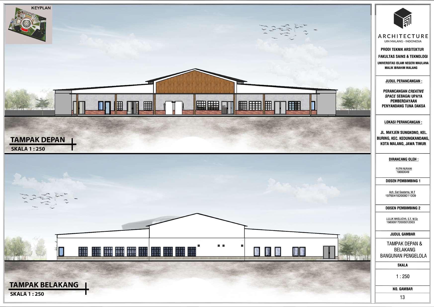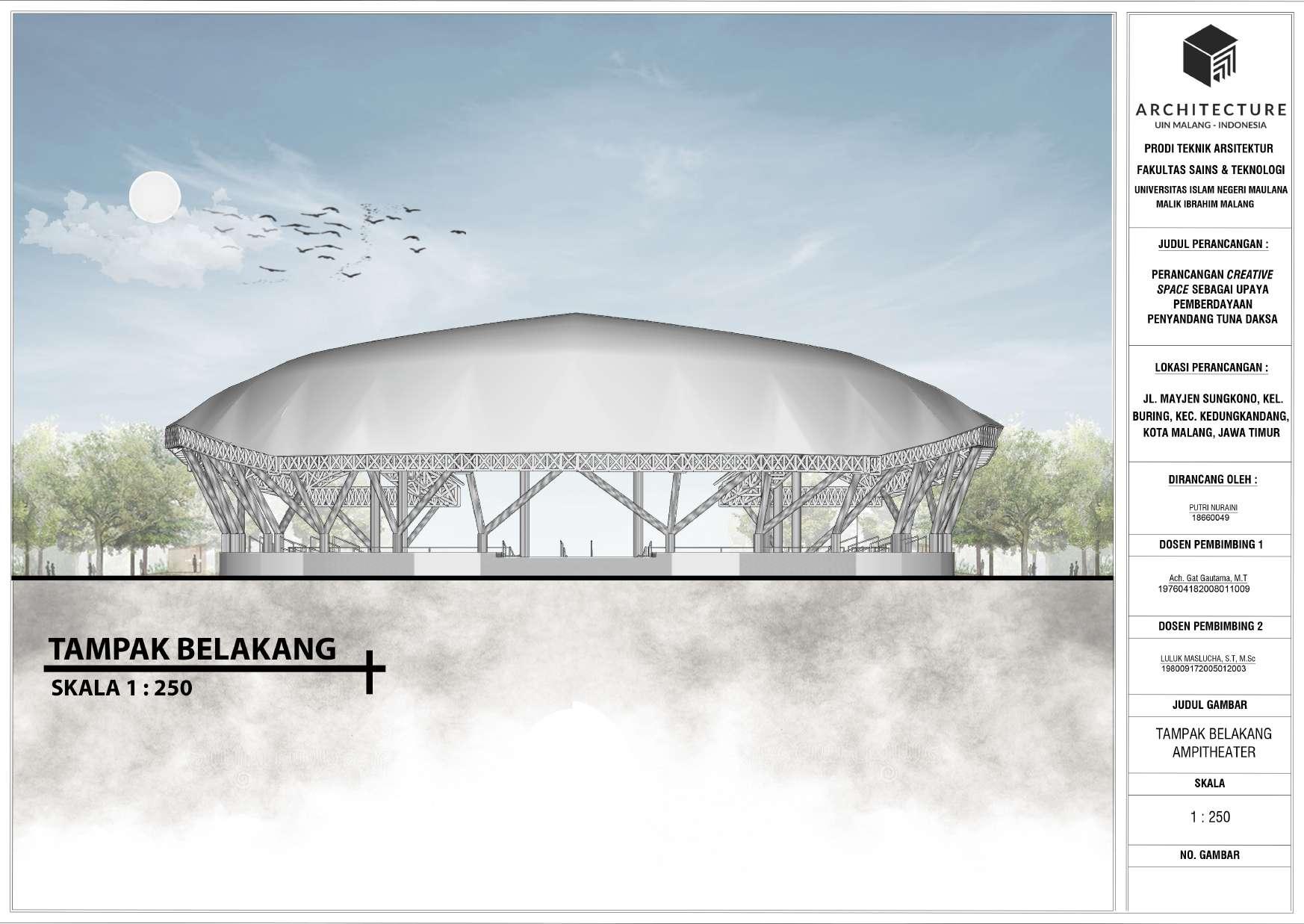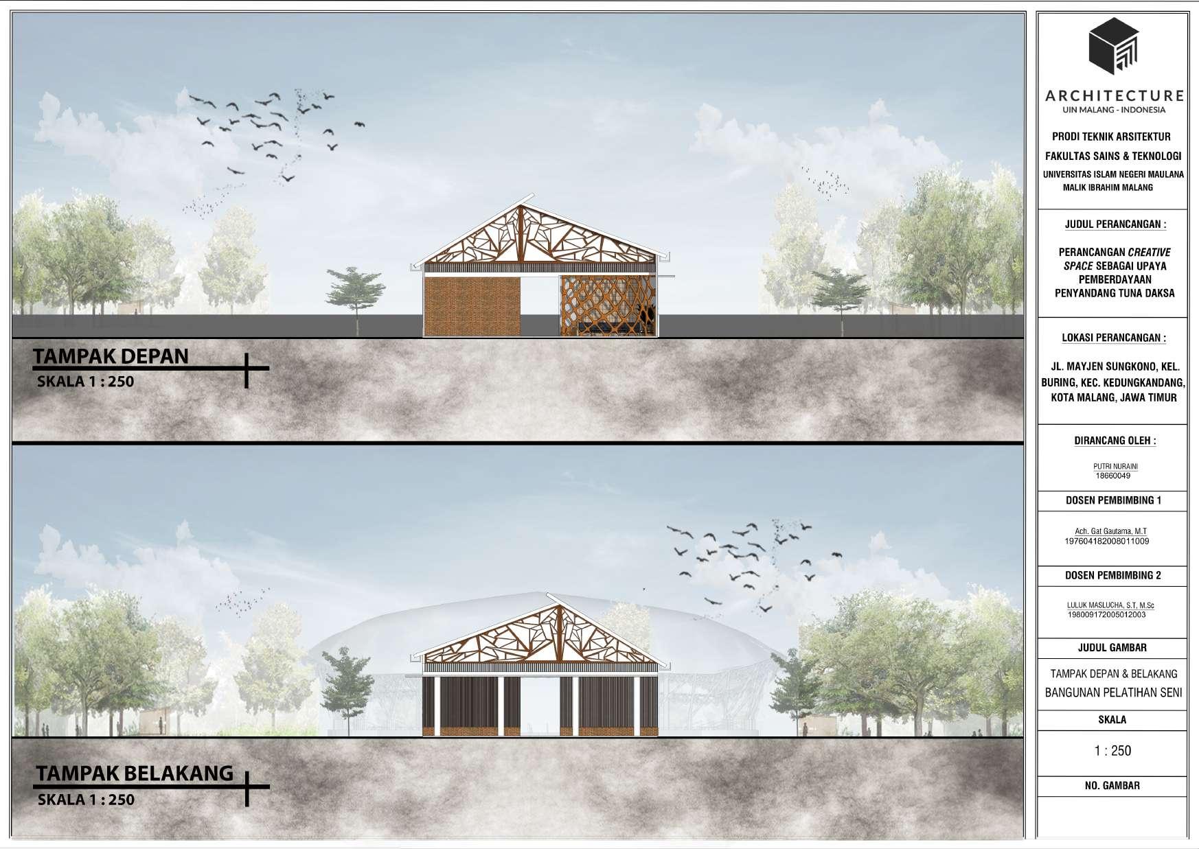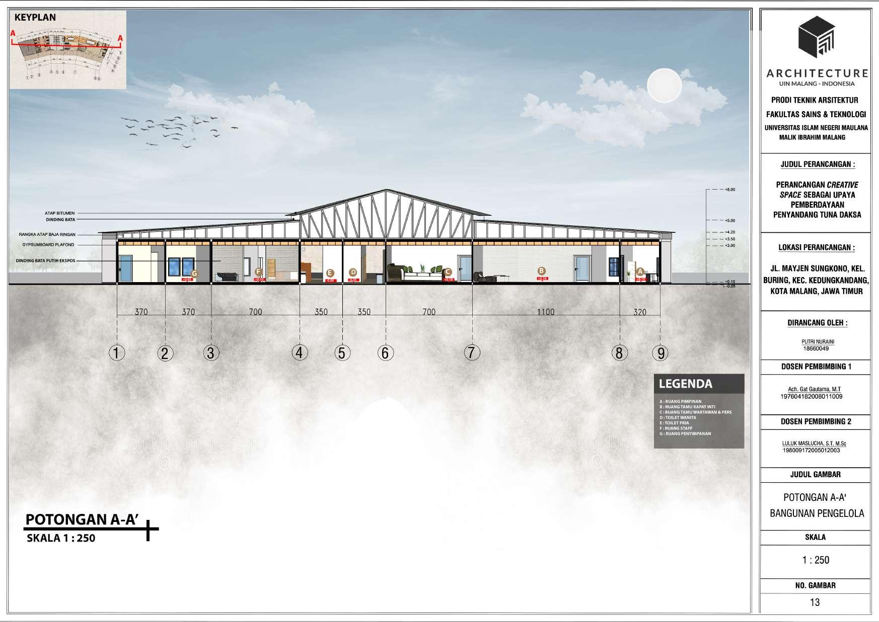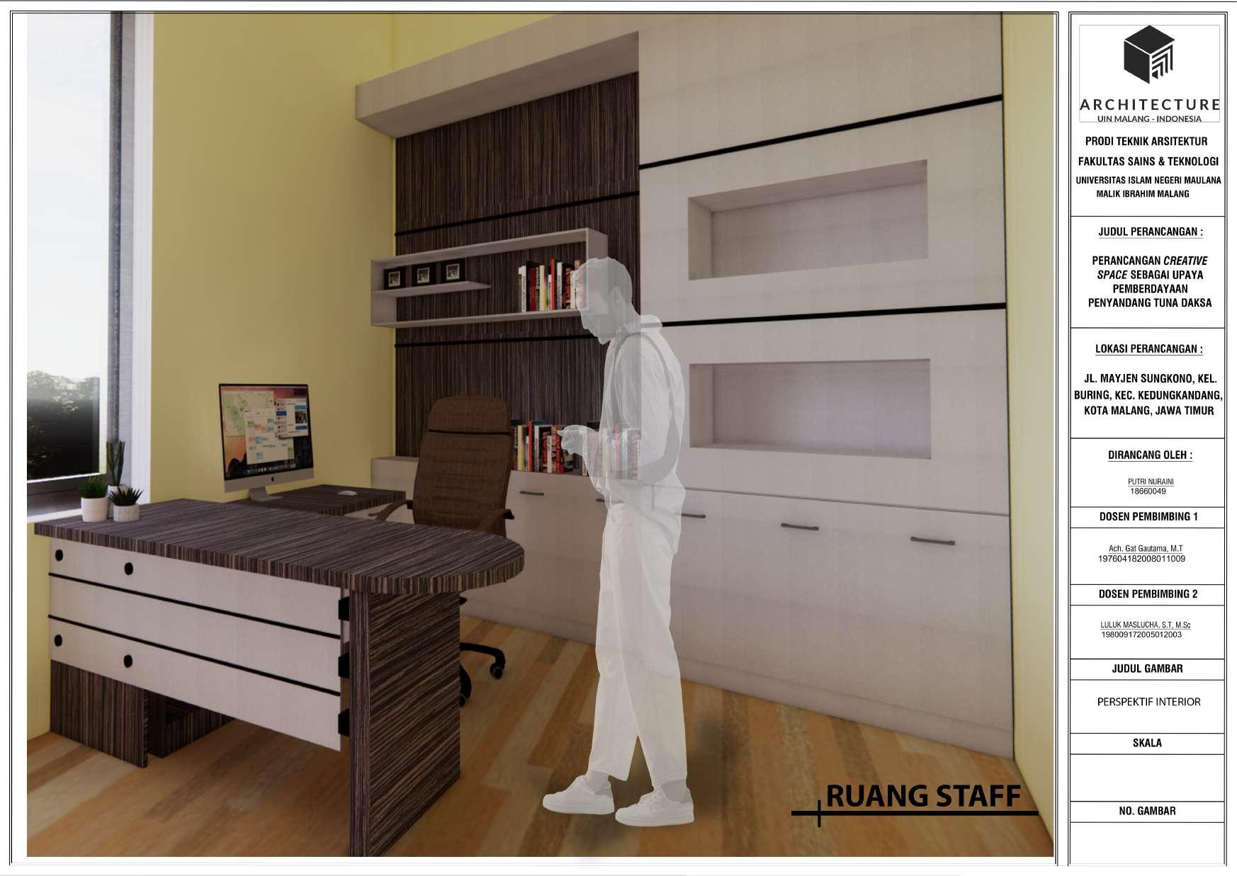 Laporan tugas akhir ini telah dipertahankan di hadapan dewan penguji dan diterima sebagai salah satu syarat memperoleh gelar Sarjana Arsitektur (S.Ars) di UIN Maulana Malik Ibrahim Malang Oleh: PUTRI NURAINI 18660049 Judul : Perancangan Creative Space sebagai Upaya Pemberdayaan Penyandang Tuna Daksa Tanggal Ujian : 16 Juni 2022 iii