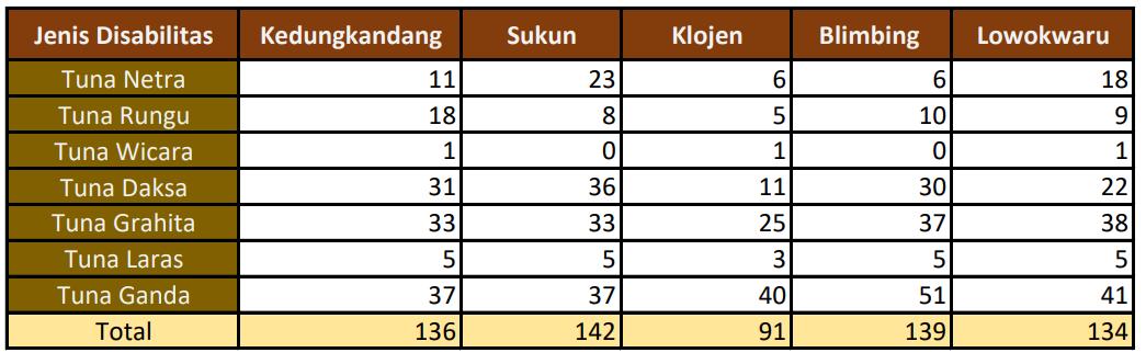 Diambil dari data dinas sosial kota Malang, penyandang tuna daksa di Kota Malang memiliki angka 130 jiwa[4]. Kecamatan Sukun merupakan peringkat pertamadiKota Malang dengan jumlah penyandang terbanyak. Dari jumlah data diatas, pemerintah Kota Malang memperkirakan masih banyak penyandang disabilitas yang tidak termasuk dalam data tersebut. Halinidisebabkan oleh argumen dari masyarakat yang menganggap bahwa disabilitas adalah sebuah aib/penyakit yang harus ditutupi.