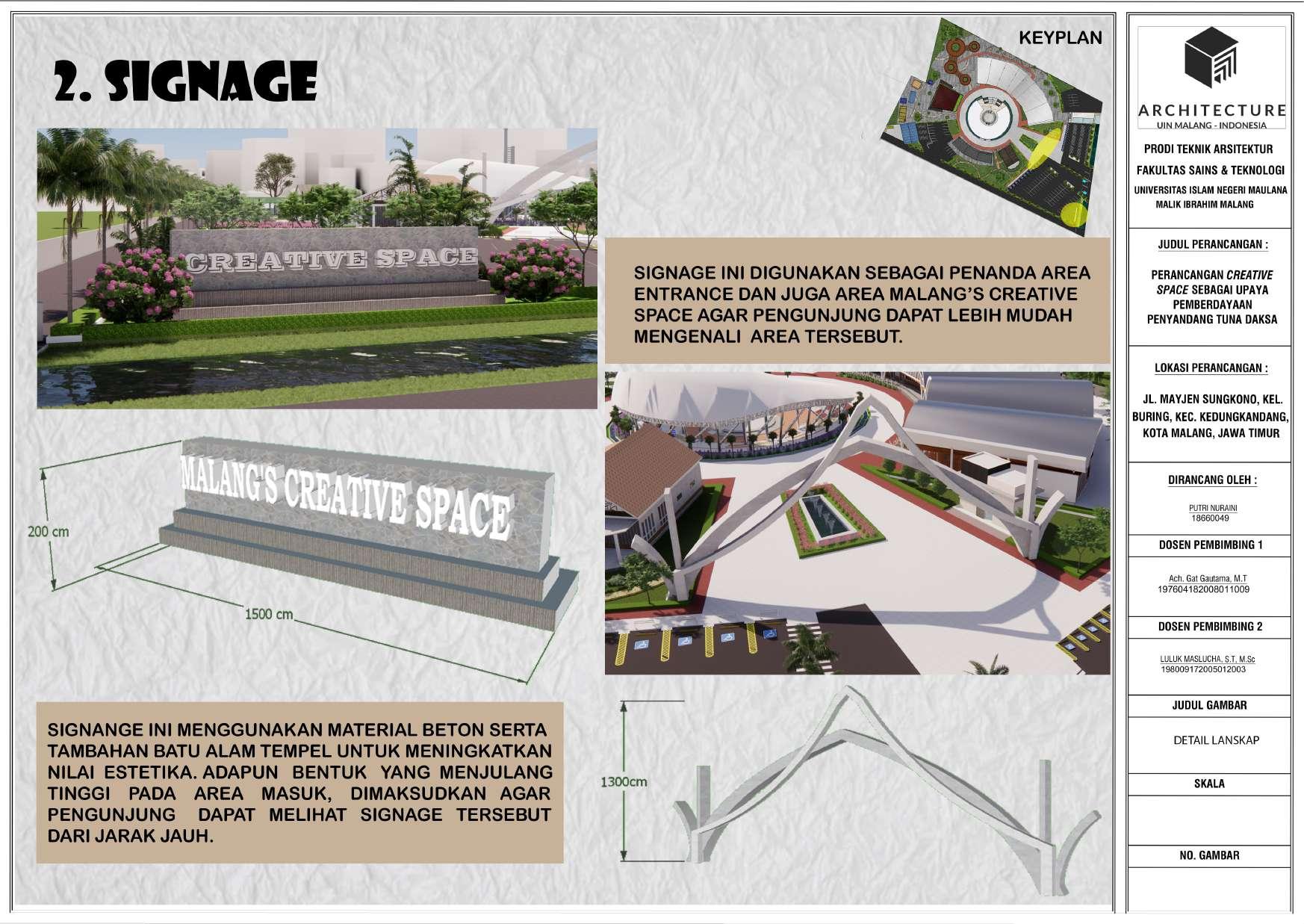Creative space merupakan suatu ruang/tempat, baik fisik maupun nonfisik yang menyatukan komunitas, memberi ruang dan dukungan untuk komunitas atau orang yang berkreasi mengumpulkan, mengembangkan bisnis, serta dibidang lainnya seperti kreatifitas, teknologi dan budaya. Perkembangan creative space di Kota Malang sendiri belum begitu banyak. Padahal jika dilihat dari sisi ekonominya, creative space ini merupakan salah satu penunjang dari ekonomi kreatif yang mampu meningkatkan kesejahteraan bagi penyandang disabilitas.