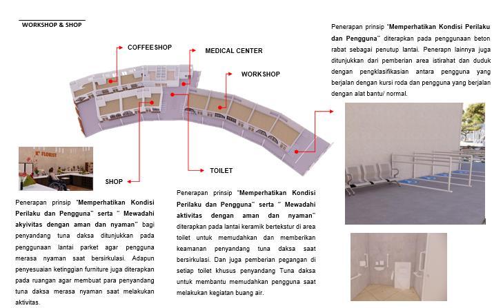 The design of this creative space, which is intended for people with physical disabilities, is expected to be able to help their existence to meet the required facilities and infrastructure. Moreover, by applying the principles of behavioral architecture to the design, it is hoped that it will be able to adjust the needs of people with disabilities in accordance with the standards of behavior and activities of people with disabilities themselves. In addition, the design of this creative space also adapts to the development of the creative economy in the city of Malang, so that the existence of this creative space will always live in line with the times.