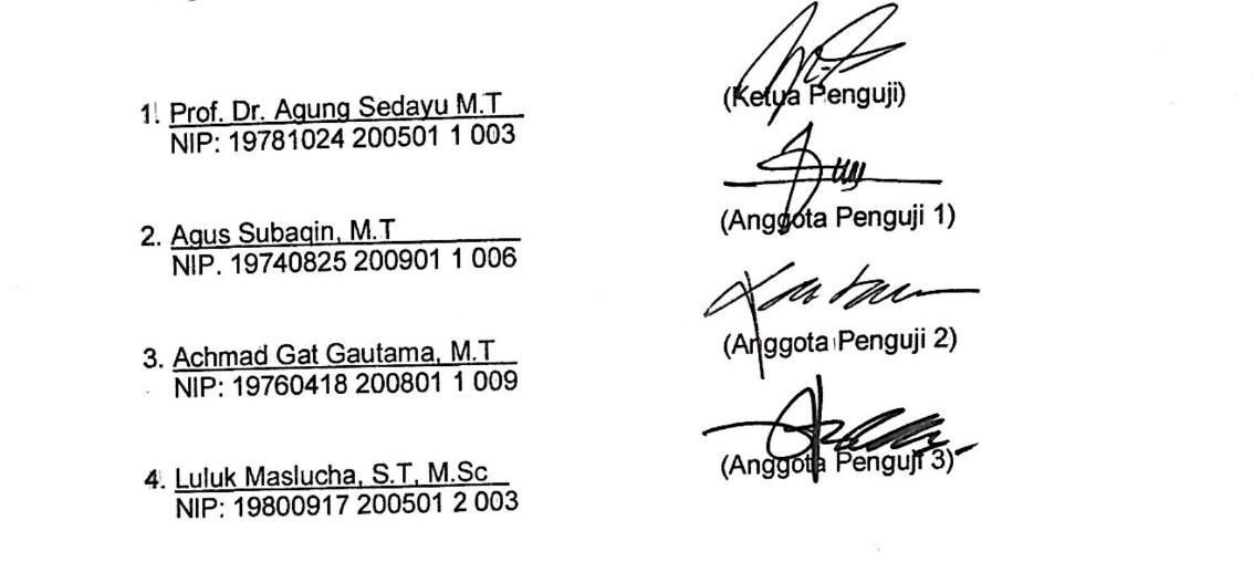 5. Prof. Dr. Agung Sedayu M.T dan Agus Subaqin, M.T, selaku dosen penguji yang telah memberikan saran, arahan serta pengetahuan yang tak ternilai selama masa kuliah, terutama saat proses penyusunan laporan tugas akhir.
