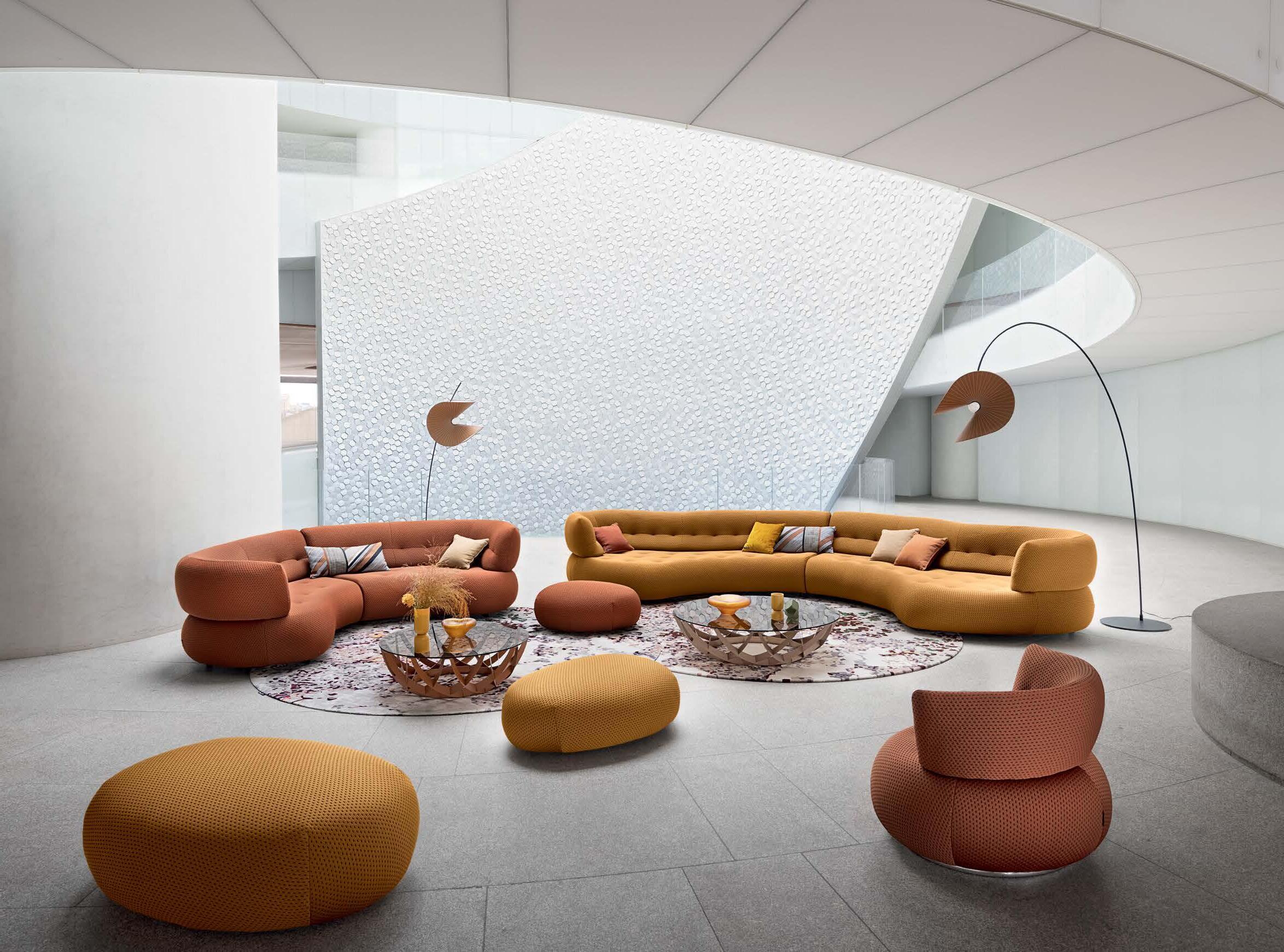 Sense. Modular sofas, armchair and ottomans, designed by Studio Roche Bobois. Cestello. Cocktail tables, designed by Gabriele Fedele. Mariposa. Floor lamps, designed by Marcel Wanders. Botanica. Rugs, designed by Emmanuel Thibault.