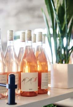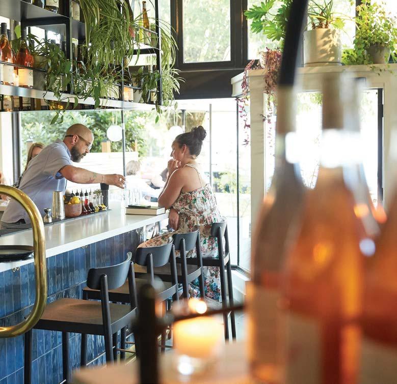 The bar is defined by a custom steel beverage rack packed with leafy plants and natural wine. “It was created to showcase the everchanging wine list, and the plants add a lush layered look,” says Holly Freres.