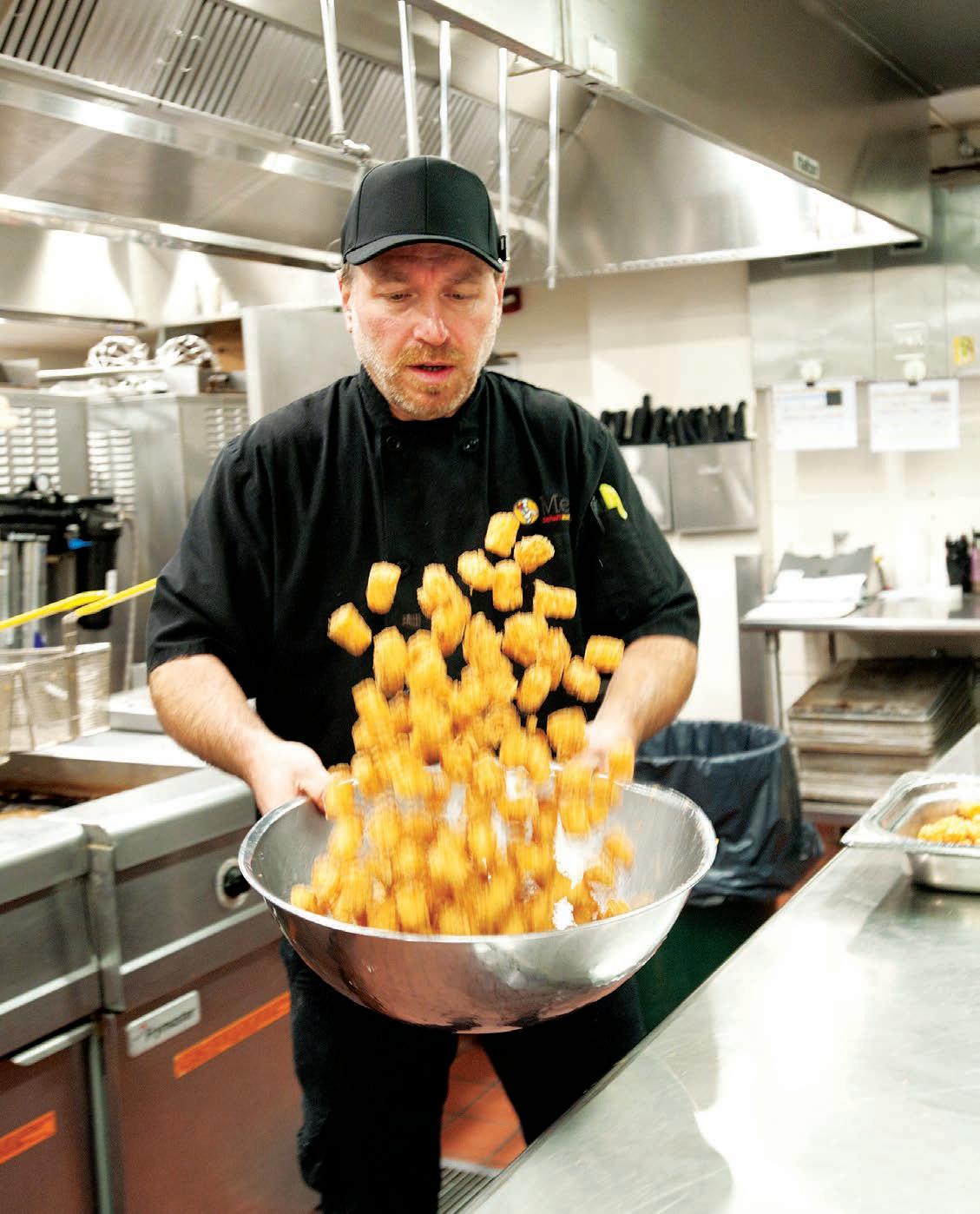 Jon Skaggs of Metz Culinary Management tosses hashbrowns for morning breakfast.