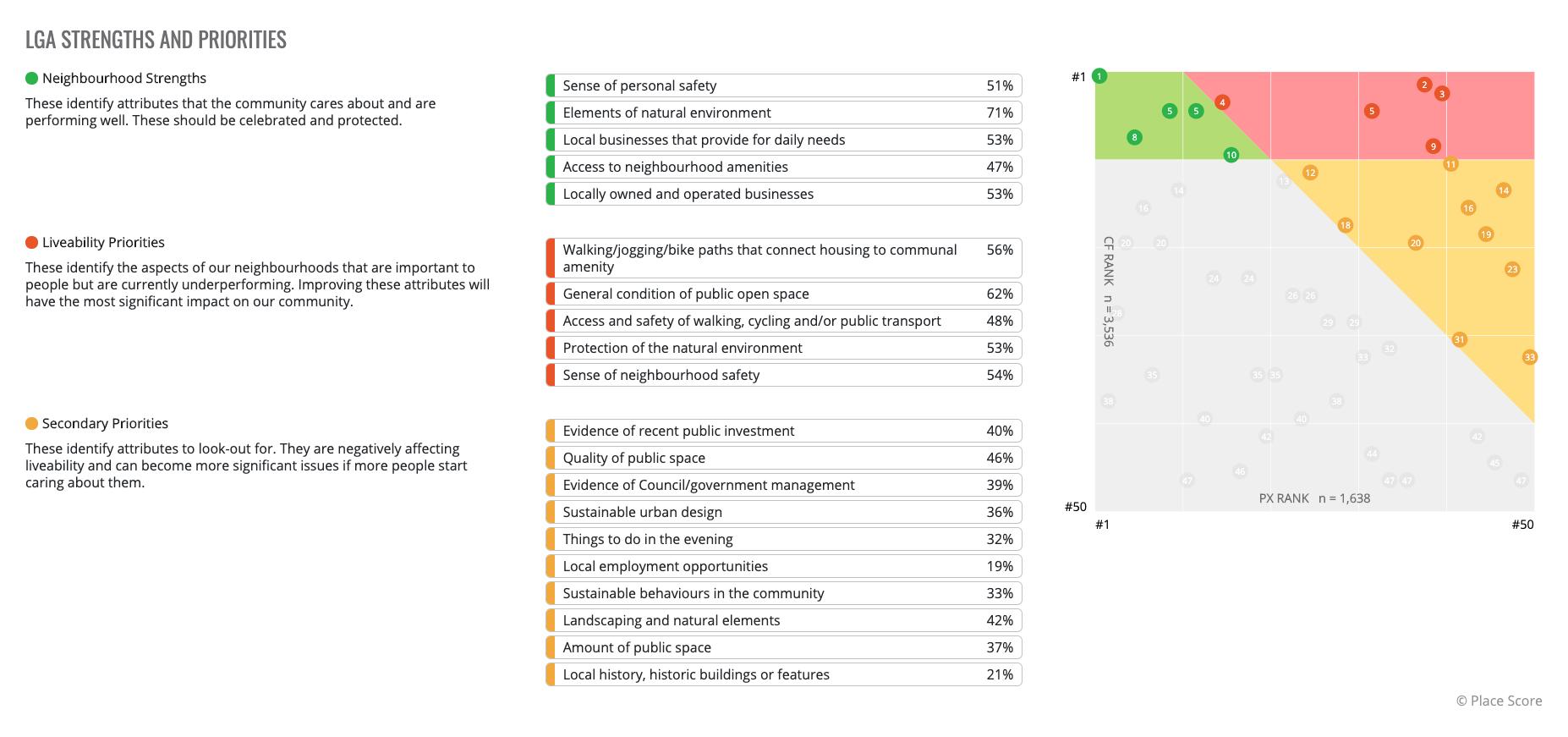 Together they help you identify what is important, how a neighbourhood is performing, and what the focus of change should be. An attribute with a high CF but a low PX should be a priority for investment as it will have the most positive impact on the most amount of people.