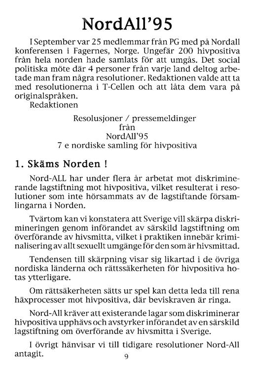 1991 byter bladet namn till PG Nytt och 1993 lanseras PG:s första regelrätta tidning, T Cellen, som några år senare byter namn till TC Magazine. Ett återkommande tema i tidningen är Sveriges smitt skyddslag, och kritiken mot den är hård från början, både nationellt och från hivorganisationer i grannländer. I T Cellen december 1995/januari 1996 står det att representanter för PG deltagit i konferensen Nord All där personer som lever med hiv från hela Norden mötts. Nord All tog fram en resolution som publicerades i tidningen där man fördömer Sveriges lagstiftning. I TC Magazine oktober–december 2003 skriver Henrik Arildsen och Ola Morten Nygård, styrelseledamöter i organisationen Hiv Danmark, med anledning av ett förslag från den svenska regeringen att skärpa lagen: