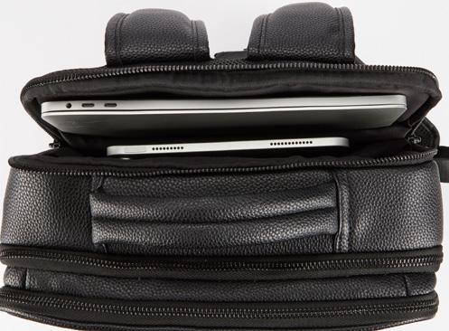 • Three large zippered compartments: one with split, padded laptop/tablet sleeves; one with interior mesh organization pocket; and one with removable key leash