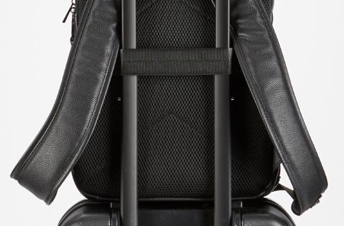 Cushioned straps and back panel for ergonomic carry; trolley strap for travel ease