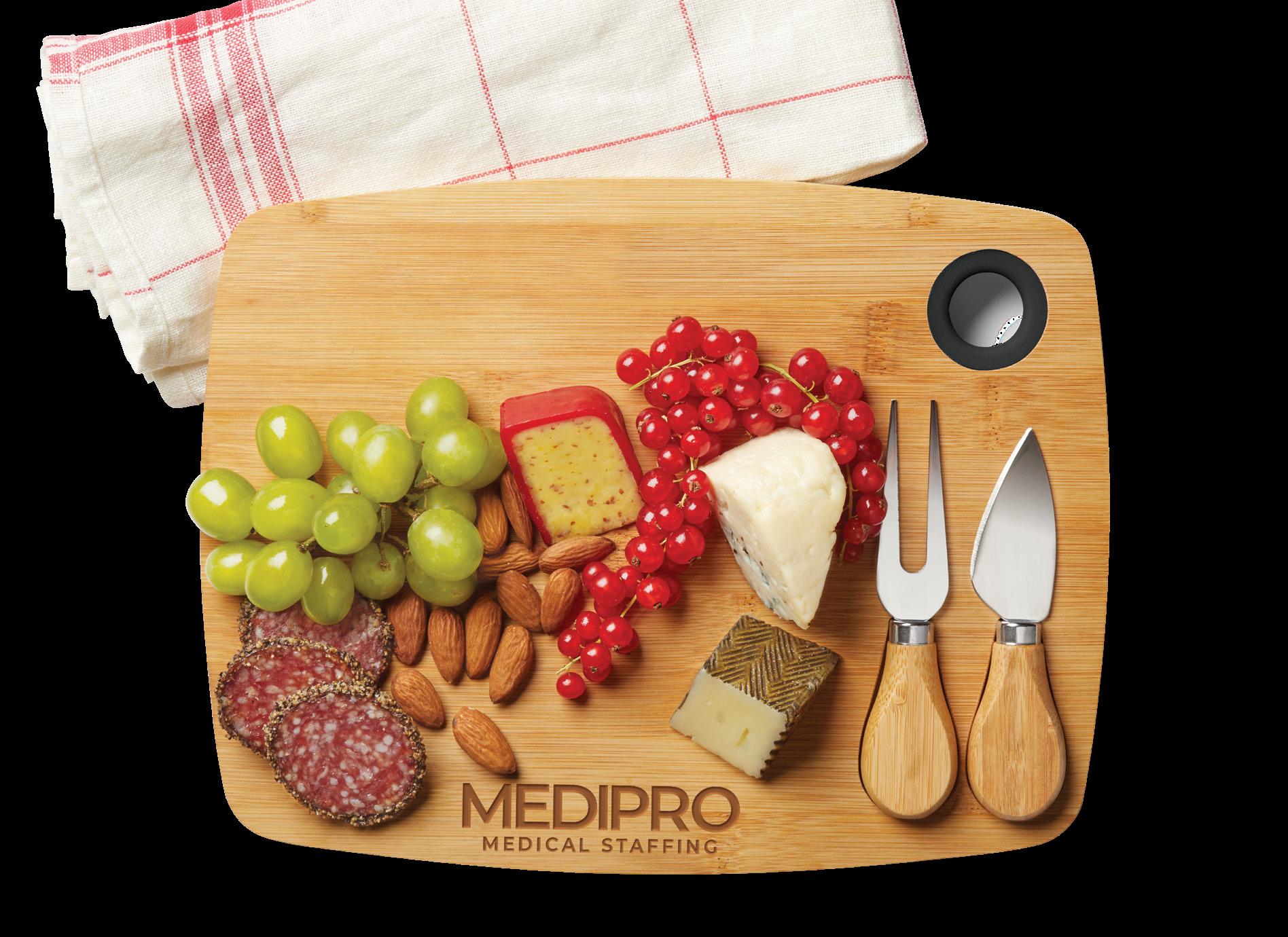 • Serving/cutting board with matching stainless steel serving knife and fork