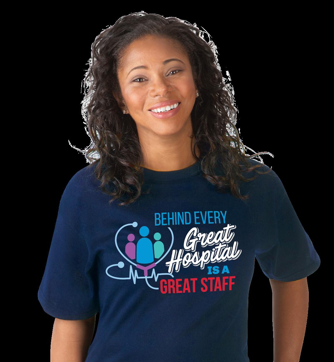 • Designs in two locations: your facility name or message on front upper left chest; choice of 5 exclusive designs on right sleeve