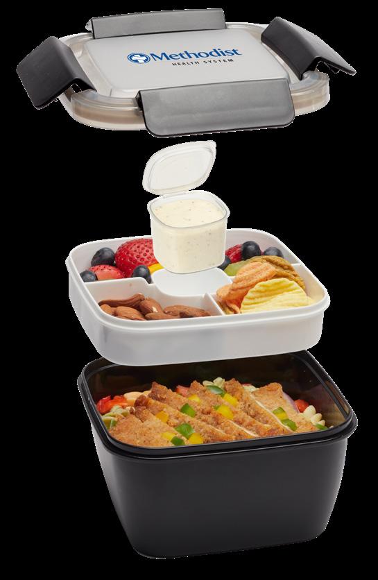 • 4-compartment top tray (2 sections hold 5-oz., 2 hold 3.5-oz.) separates fruit, veggies, nuts, etc.; lidded, removable 3-oz. container stores dressing, toppings or sauce