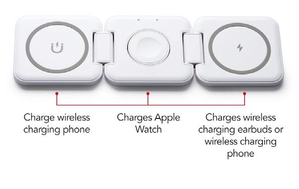• Three foldable panels wirelessly fast-charge phones, smartwatches, earbuds, or other Qi-enabled devices simultaneously