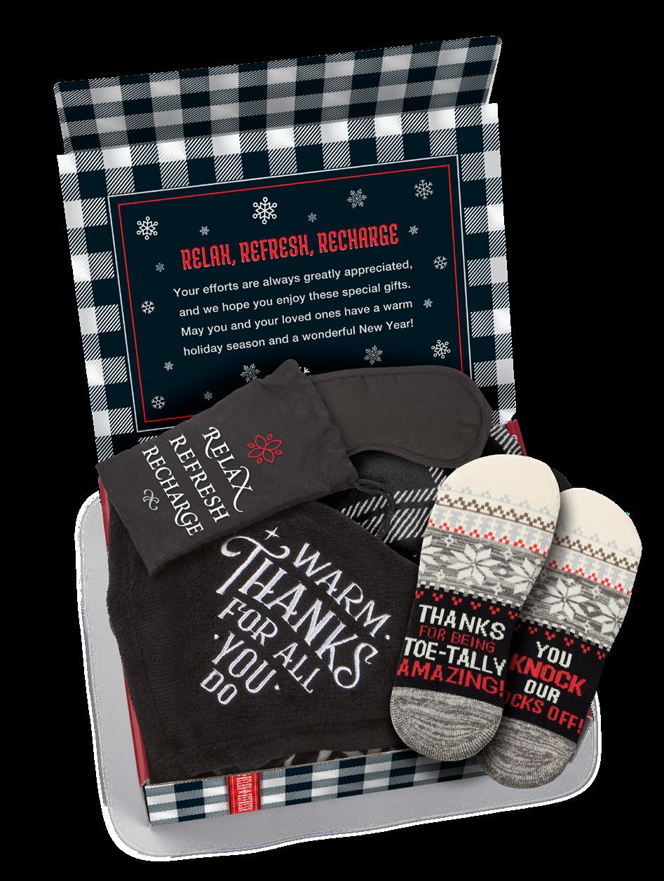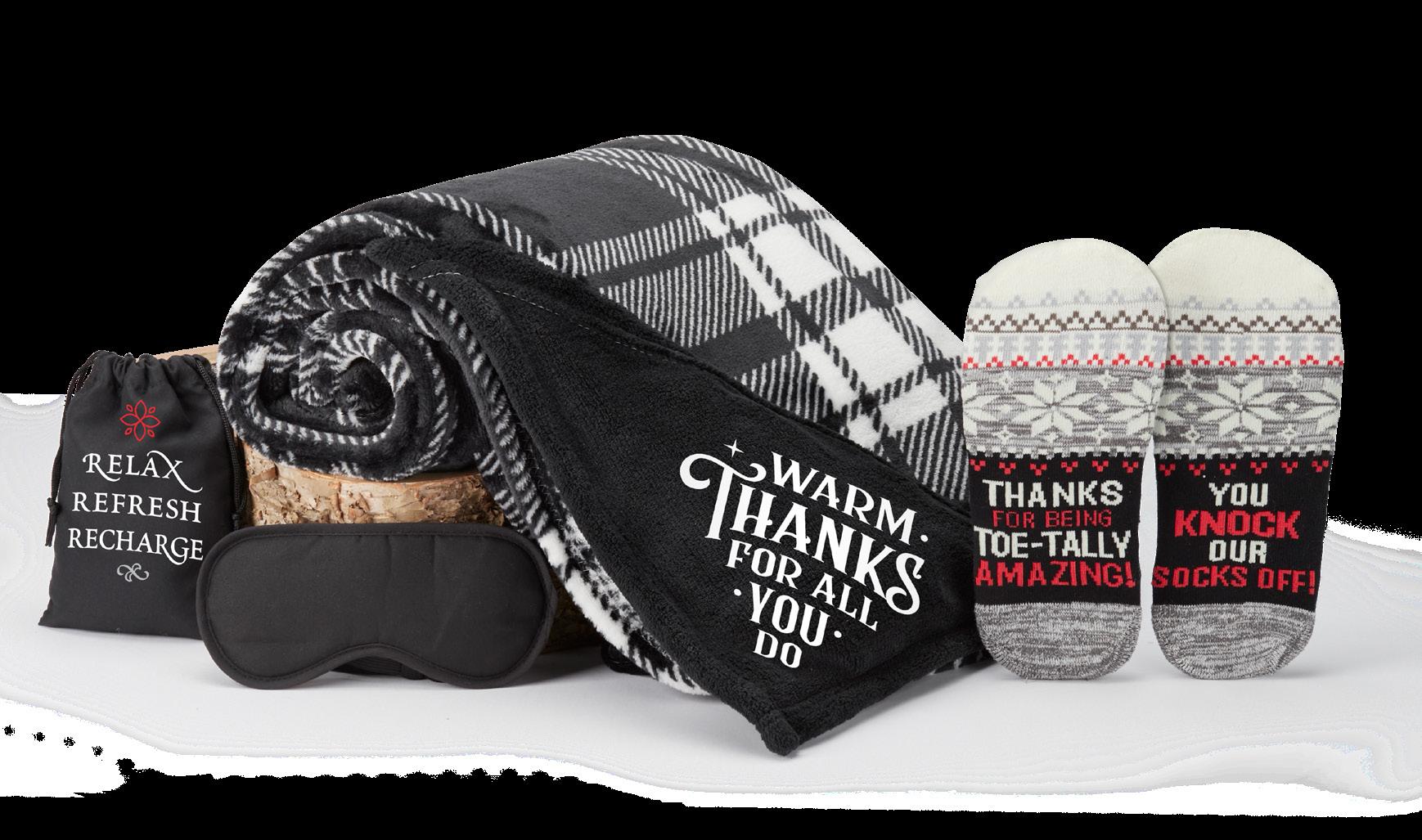 • The 3-in-1 gift set includes a Plaid Mink Fleece Blanket, Eye Mask in a Pouch, & "Toe"-tally Awesome Ankle Socks - plus a personalized appreciation card As Low As: $23.99