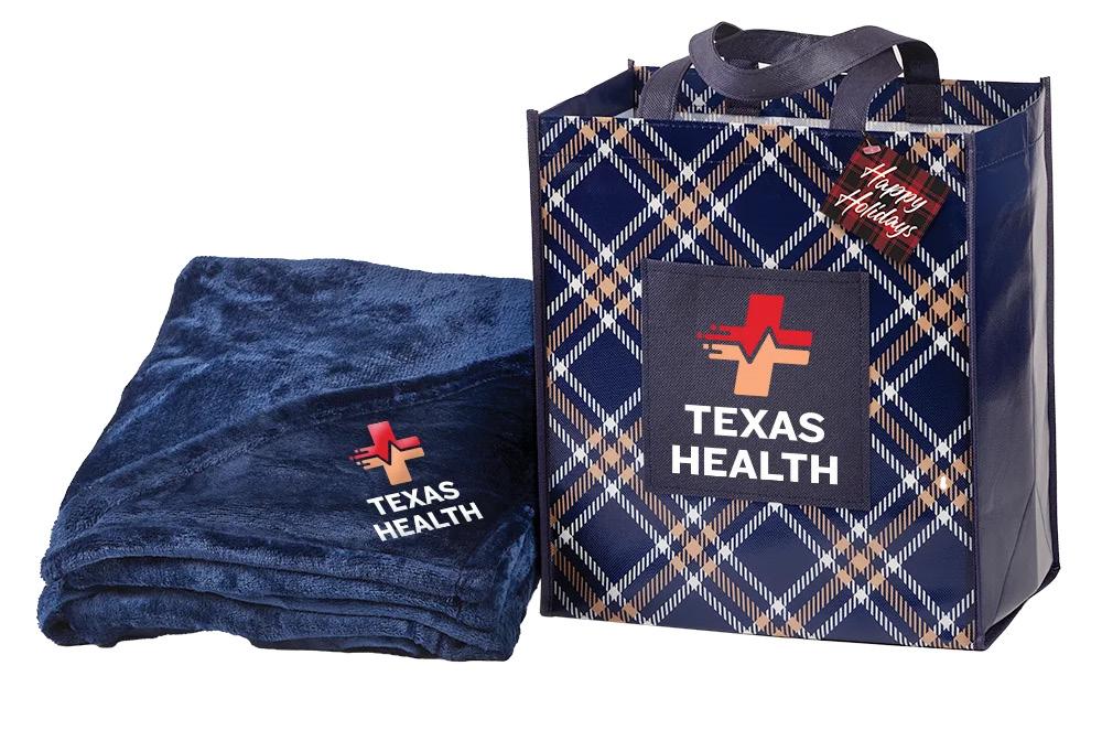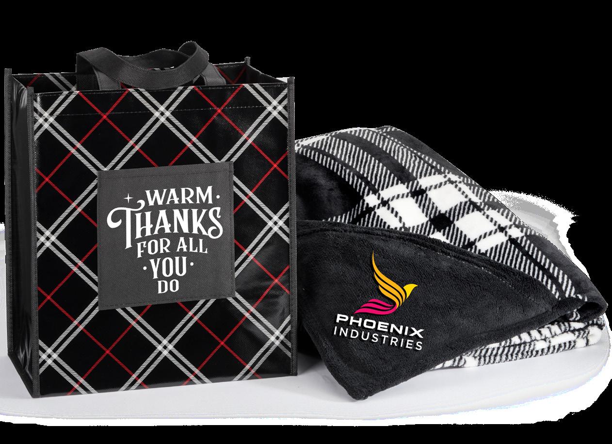 • The set includes a Plaid Mink Fleece Blanket and a Laminated Eco-Shopper Tote Bag