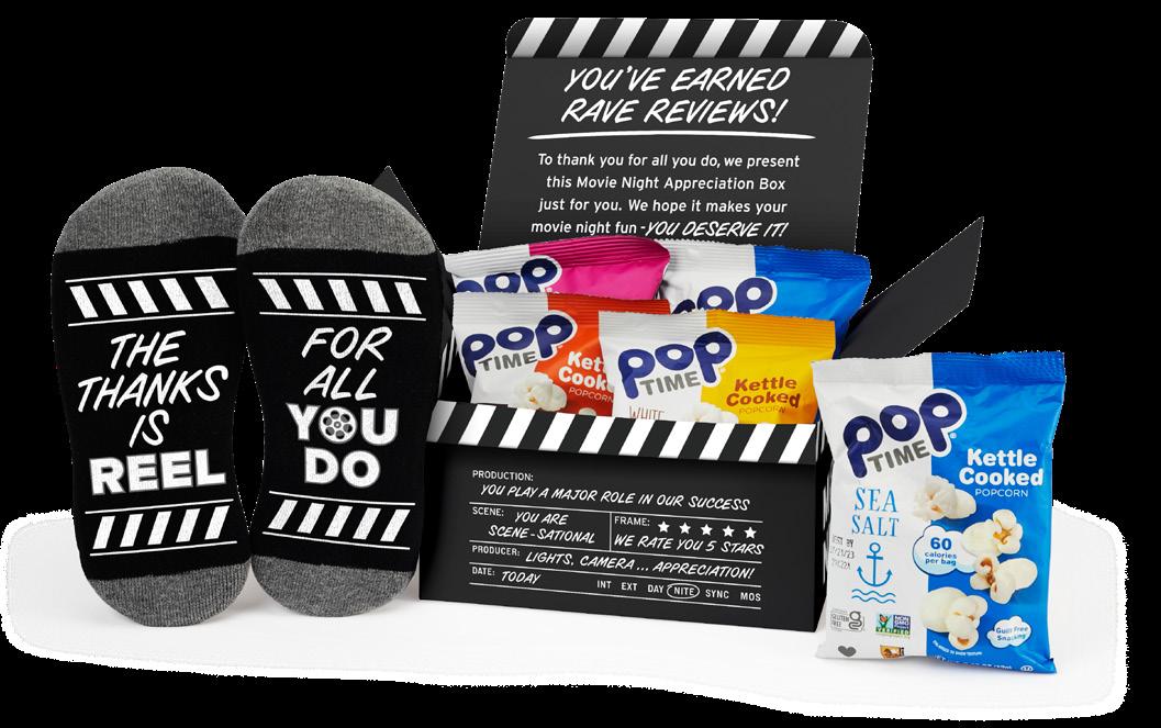 • Includes five bags of popcorn, a pair of "Toe"-tally Awesome Ankle Socks, and a Roll-Up Eco Blanket