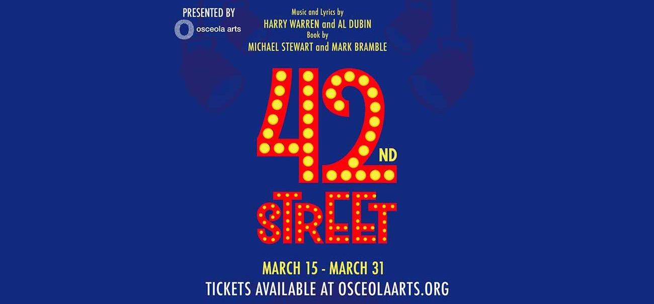 Step into the glitz and glamour of 1930s New York with Osceola Arts’ presentation of the timeless musical, “42nd Street,” on select dates beginning Friday, March 15 – Sunday March 31. This enchanting production promises a journey back in time to an era where dreams come true on the grand stages of Broadway.