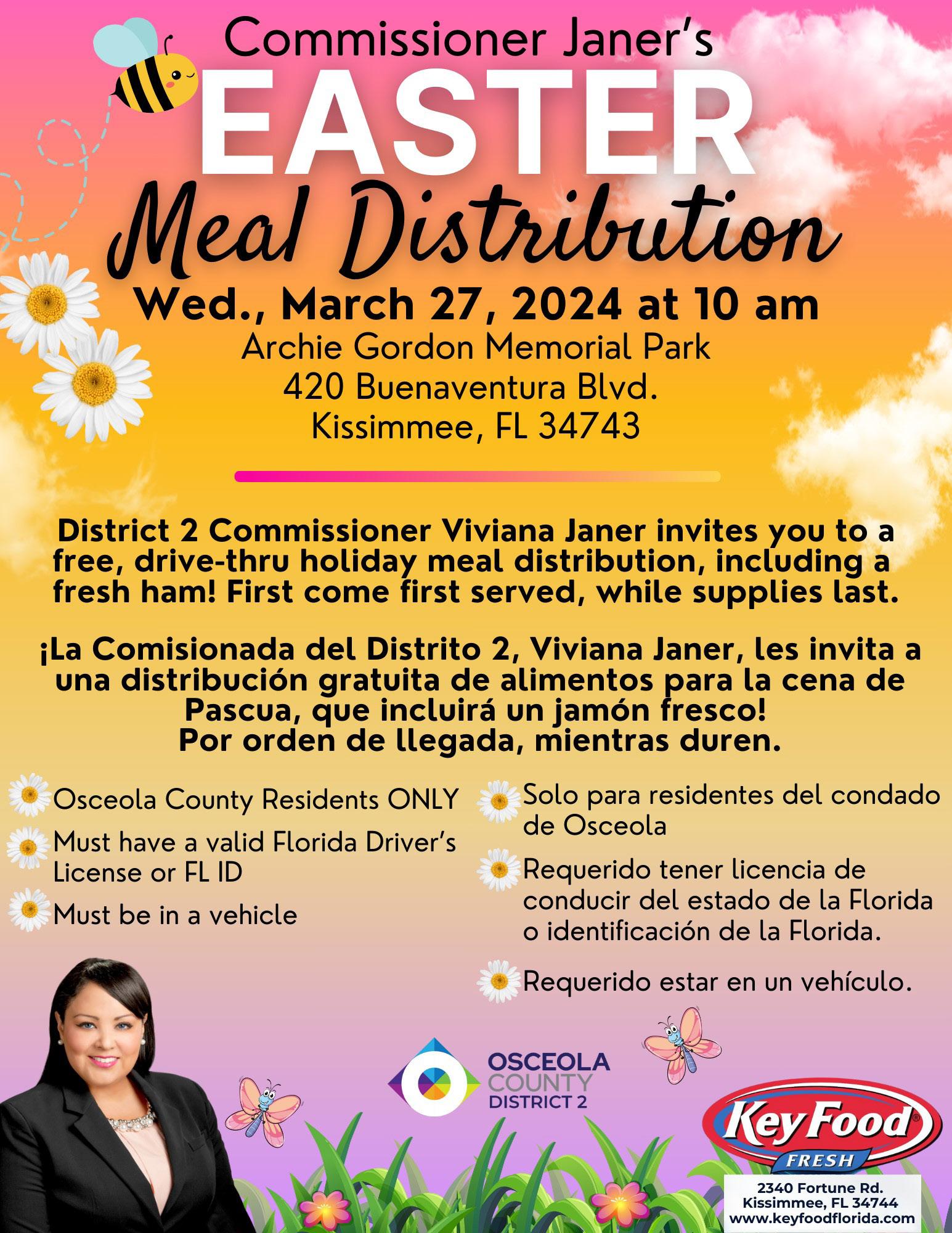 Osceola County residents are in for a treat this Easter season with Commissioner Viviana Janer’s Easter Meal Distribution event. Set to take place on Wednesday, March 27, at 10 a.m., this Osceola County drive-thru event promises to spread joy and support to the community during the festive holiday.
