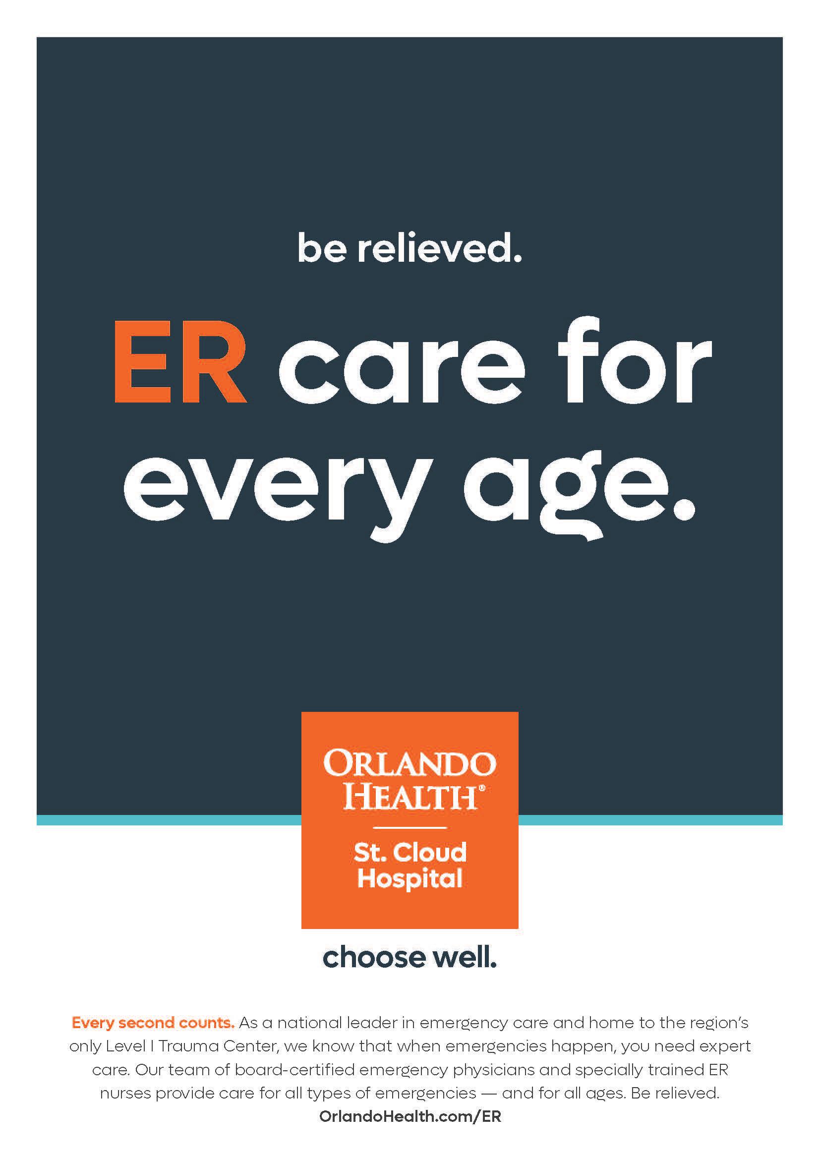 We provide trusted, quality care in your community. At Orlando Health St. Cloud Hospital, get access to care from an expert and compassionate clinical team for all of your healthcare needs — from emergency services to heart care, surgical services and more — all close to home. Giving you more reasons to choose well. OrlandoHealth.com/StCloud choose well.