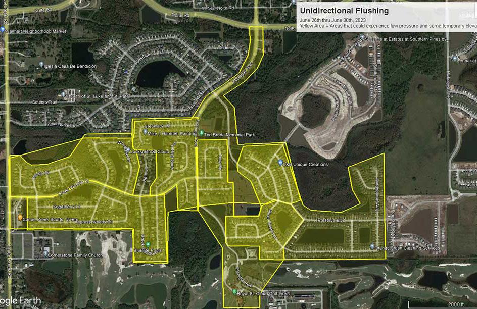 Crews contracted with Toho Water Authority (Toho) will continue water line flushing in certain areas of the City of St. Cloud this week. The map shows the area where customers are likely to experience a temporary drop in water pressure and discolored water. Water pressure and clarity will return once flushing operations in the area are completed.