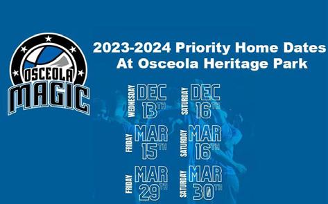 The Osceola Magic, NBA G League affiliate of the Orlando Magic, announced six initial priority home game dates for the upcoming 2023-24 season at Osceola Heritage Park in Kissimmee.