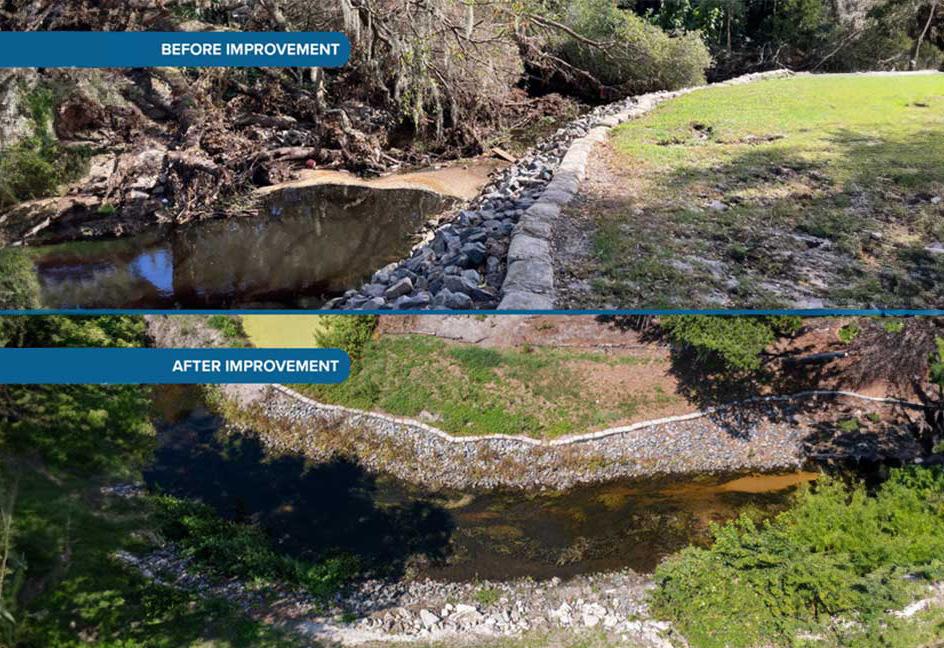 After Hurricane Ian’s heavy rainfall and flooding, numerous trees fell into the waterway, exacerbating erosion and sediment build-up. This accumulation significantly reduced the waterway’s capacity to handle water flow.