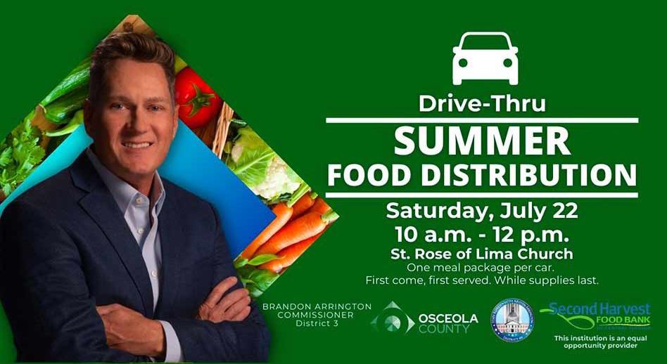On Saturday, July 22nd, from 10am – 12pm, Osceola County Board 0f County Commissioner for District 3 Brandon Arrington will host a free, drive-thru Summertime food distribution, supported by 2nd Harvest Food Bank of Central Florida and State Representative for District 46 Kristen Arrington.