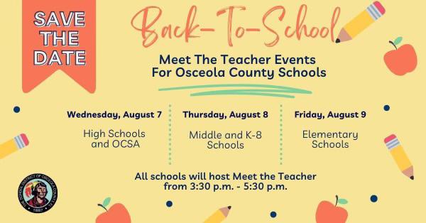 • Wednesday, August 7 – All high schools will host Meet The Teacher from 3:30 p.m. – 5:30 p.m. (including The Osceola County School for the Arts Grades 6-12)
